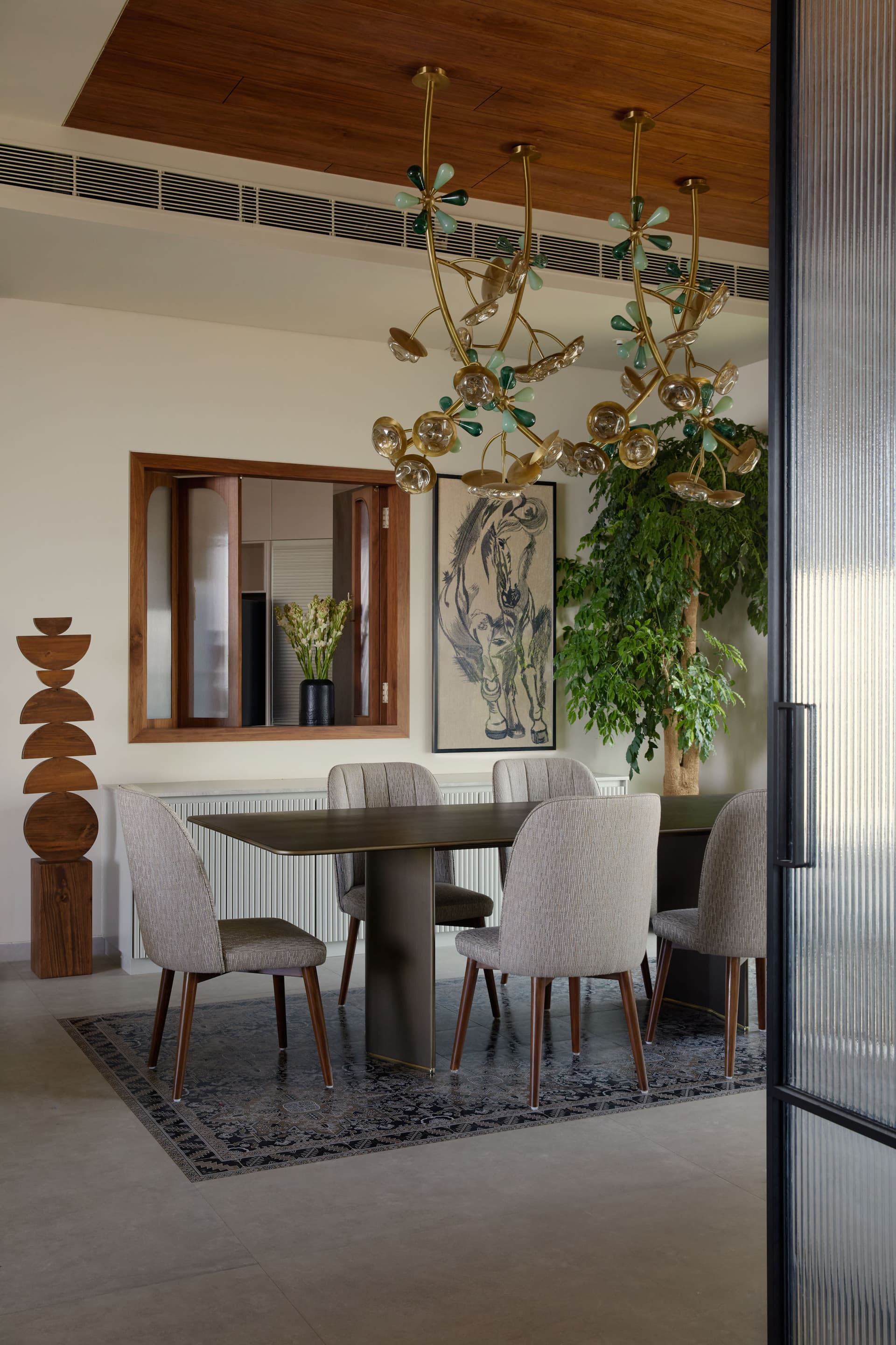 The homeowners, who frequently host their daughter and guests, envisioned a space that reflected their deep-rooted appreciation for Indian aesthetics while embracing a fresh, modern outlook. In response, the design team curated an environment where subtle heritage accents meet refined minimalism, creating a sanctuary that is both dynamic and serene. A palette of blues, greens, and bursts of red animates the neutral backdrop, while brass accents lend an understated opulence, mirroring the couple’s love for nature and vibrant hues.