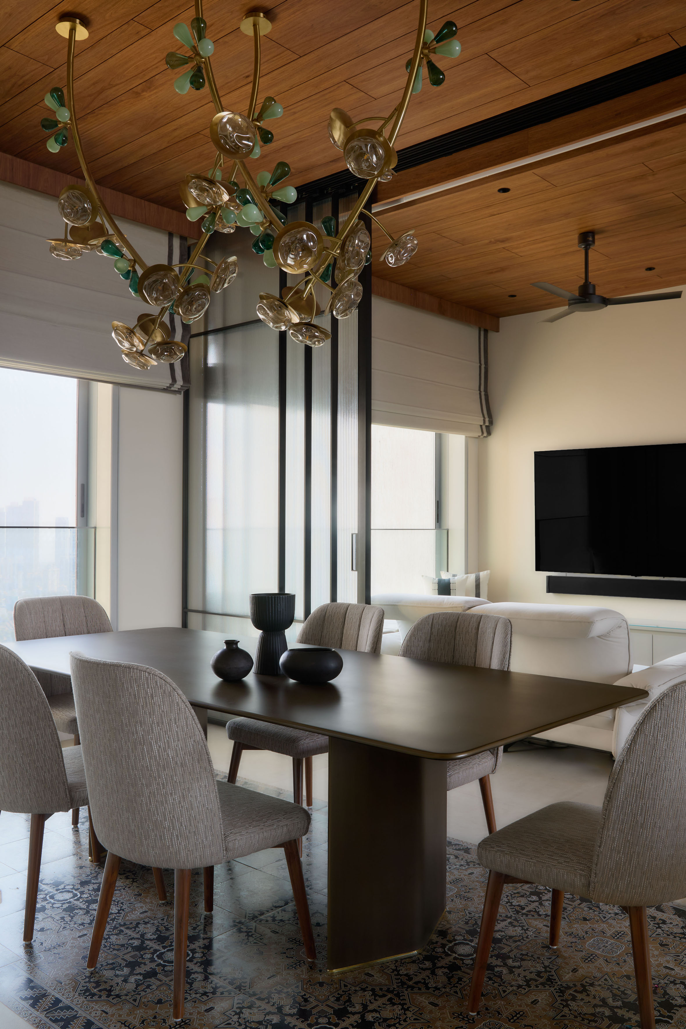 Adjacent to the living space, the dining area is a study in versatility, enclosed by floor-to-ceiling sliding doors that offer both openness and privacy. A wooden ceiling infuses warmth, while a sliding-folding window visually connects the dining and kitchen areas, enhancing the sense of fluidity.