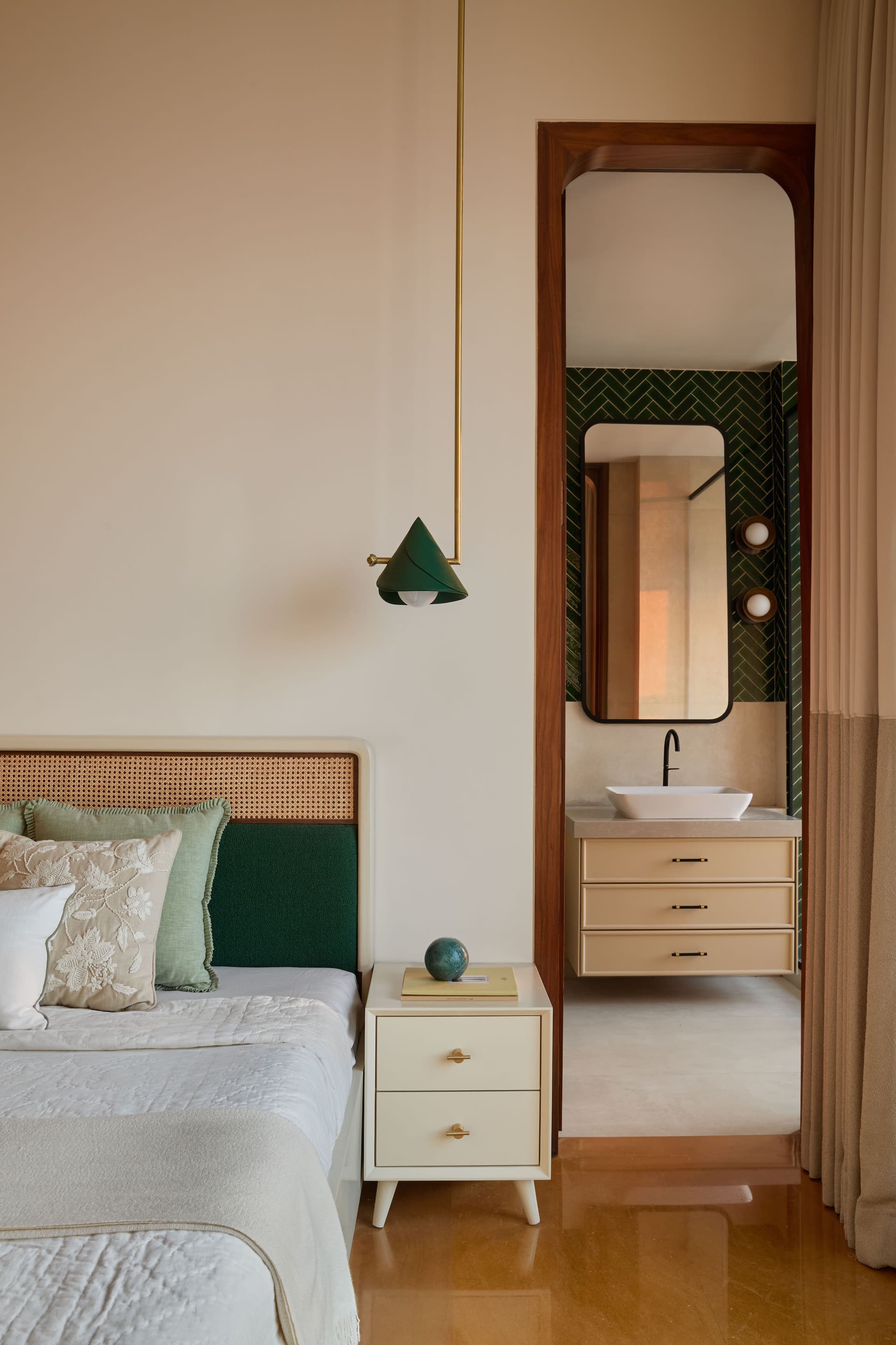 Each private space is thoughtfully curated to reflect its occupant’s personality. The daughter’s bedroom, enveloped in tones of green and Jaisalmer stone, integrates rattan accents, evoking an earthy, tranquil ambiance.