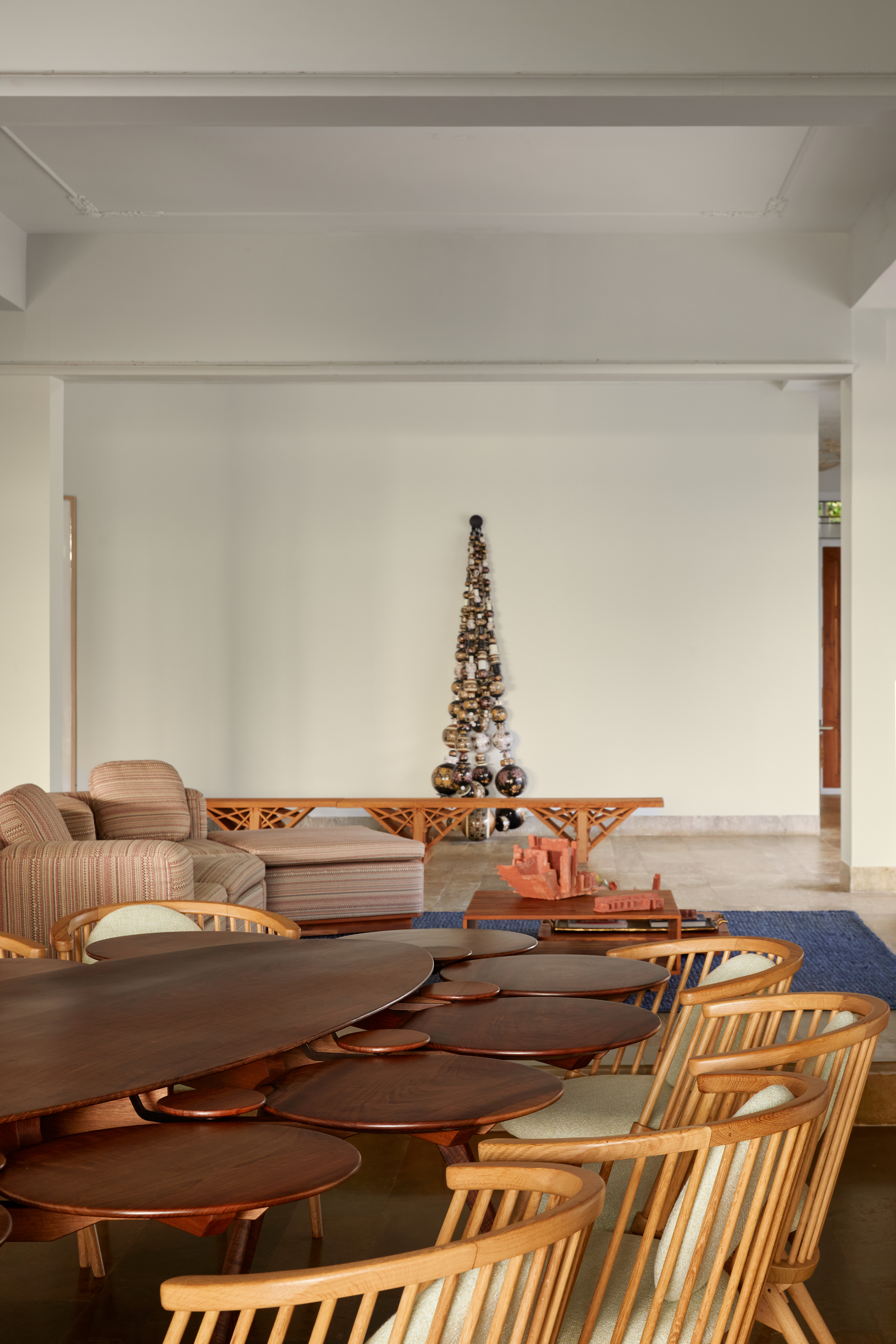 Lighting, both functional and decorative, plays a pivotal role in sculpting the home’s mood. Arjun Rathi, known for his innovative approach to lighting design, introduced three bespoke pieces that imbue the residence with an artful luminosity. His double-height Channapatna-inspired installation, a cascade of antique brass elements, graces the staircase, orchestrating a dramatic interplay of light and shadow. By day, the home is bathed in diffused sunlight through expansive floor-to-ceiling windows, while by night, strategically placed lighting compositions heighten its sculptural qualities.