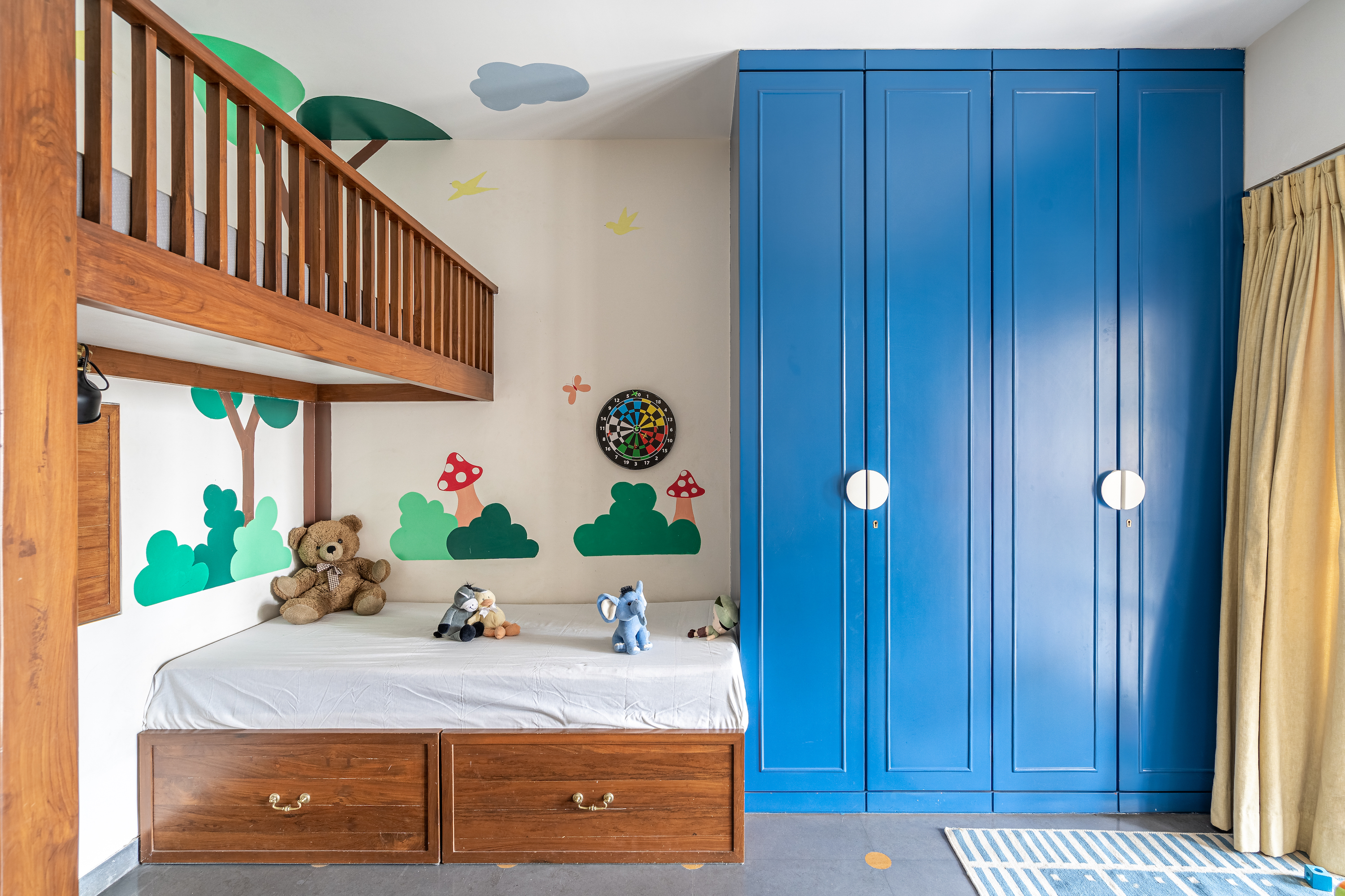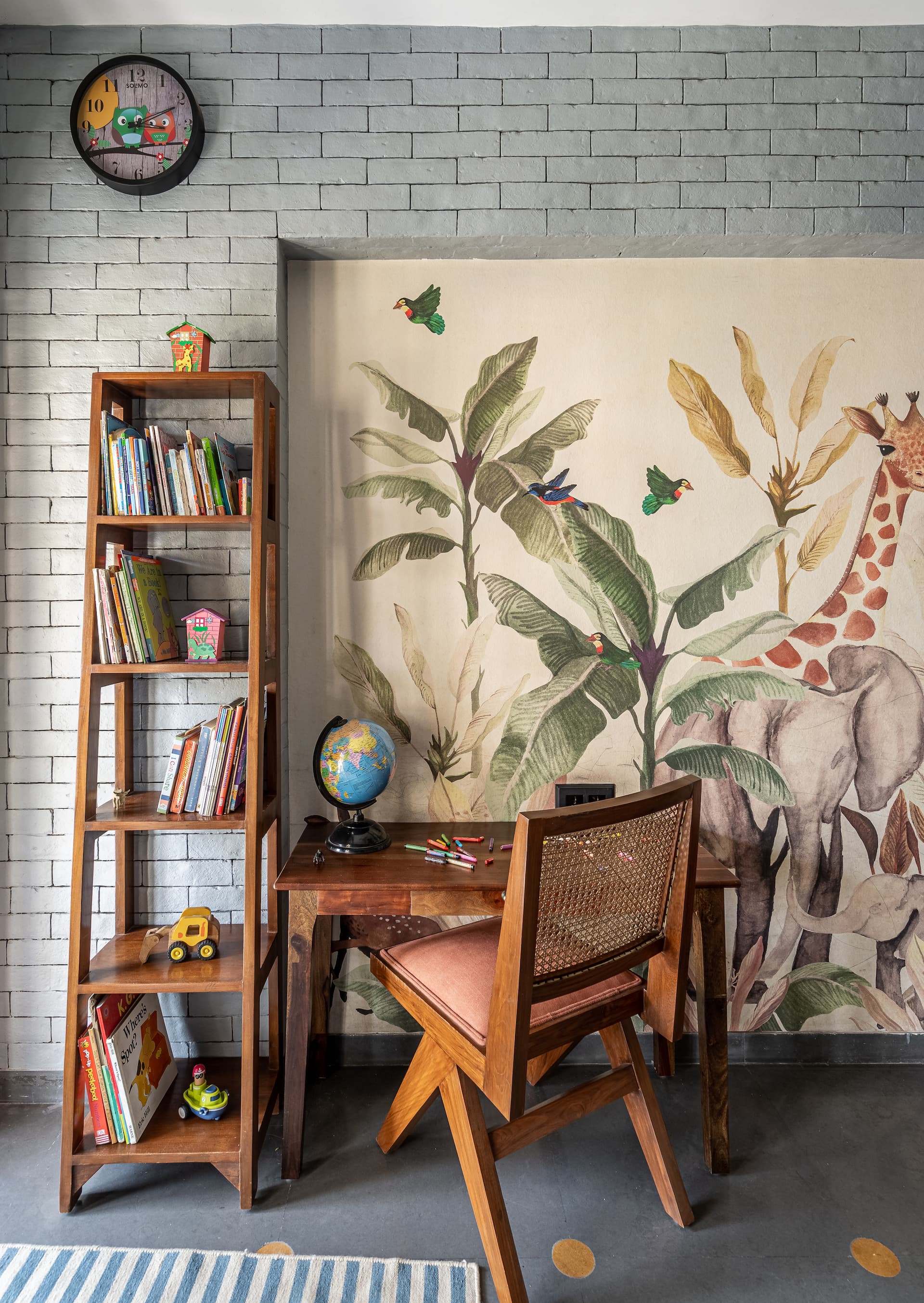Within the children’s bedroom, a truly enchanting atmosphere unfolds. The walls of this space are adorned with an artful portrayal of a charming tree and a delightful array of animals, forming a captivating motif that instantly captures the imagination. As a complementary touch to this artistic scenery, the bedroom is thoughtfully furnished with a bunk bed, ingeniously designed to maximize space and offer a haven for rest and play. Alongside this, a dedicated study space is thoughtfully incorporated, ensuring that young minds have a conducive environment for both learning and creative exploration.