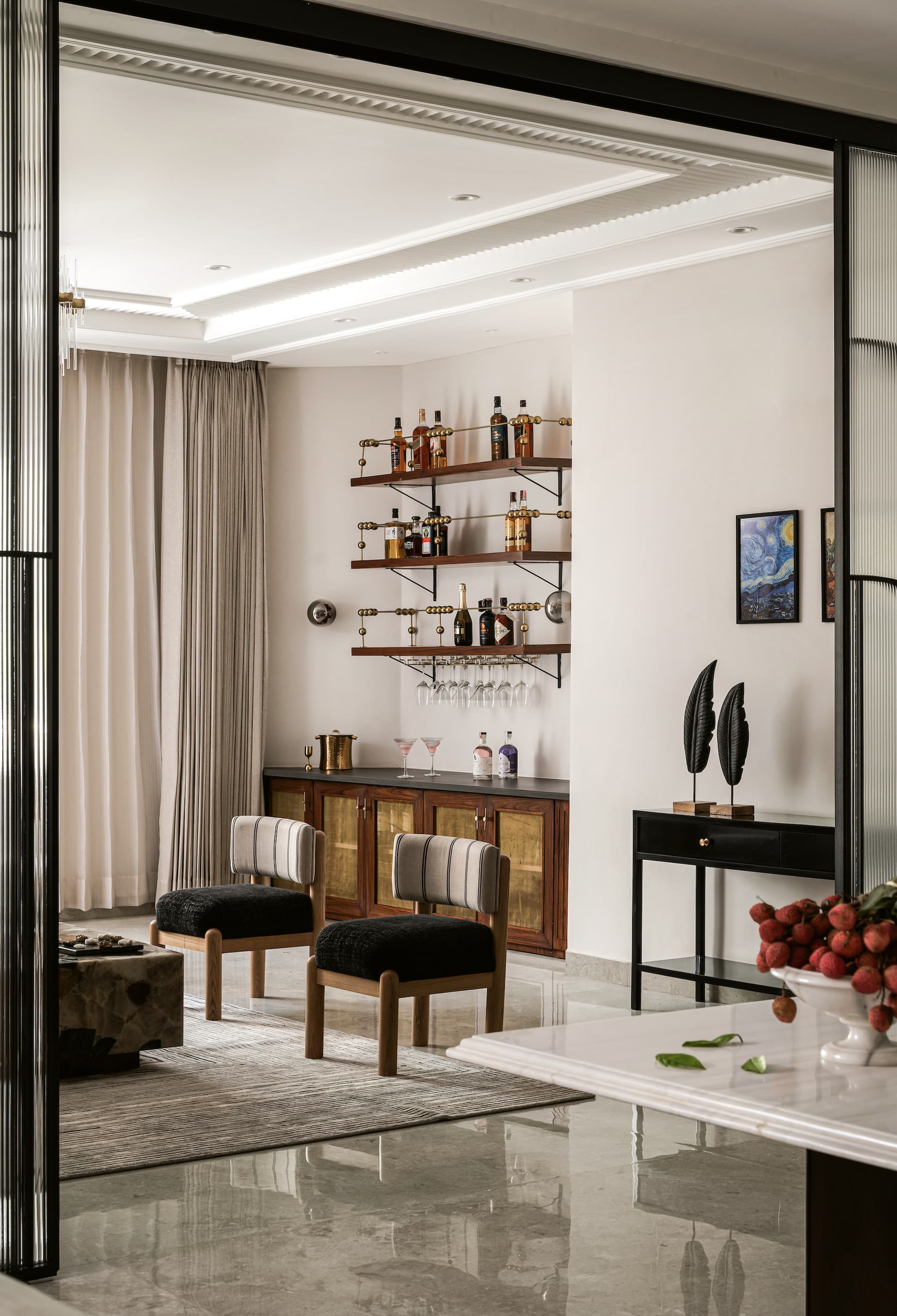 For the homeowner who loves to entertain, the bar area is an ideal blend of modern luxury with a nod to mid-century sophistication. Open shelving made from rich wood, accented with brass, adds a touch of glamour while tying in seamlessly with other metallic elements in the home, from sconce lighting to bar accessories. Thoughtfully arranged spirits and glassware not only provide function but serve as an aesthetic feature, contributing to the room’s refined yet inviting ambiance.