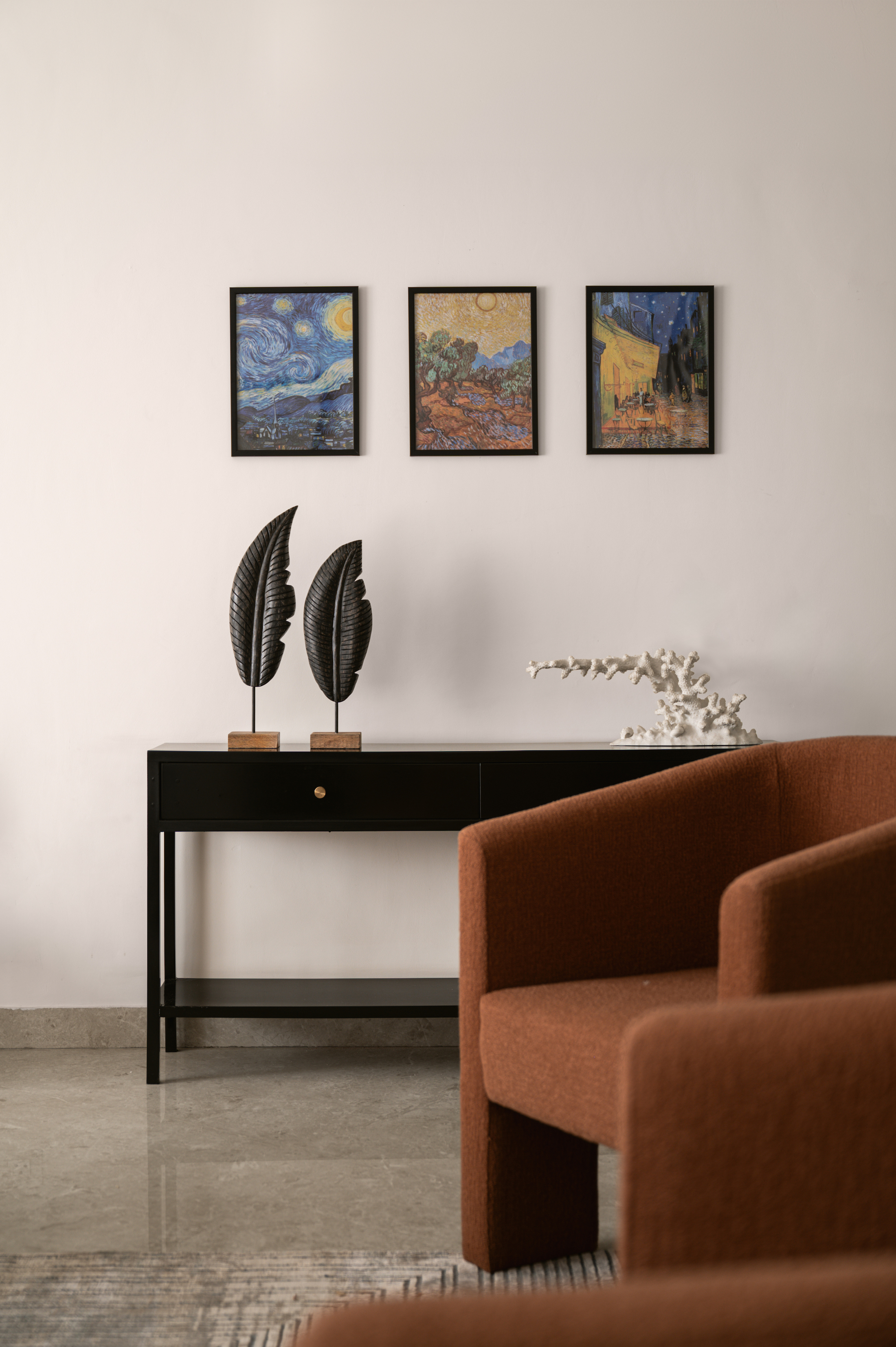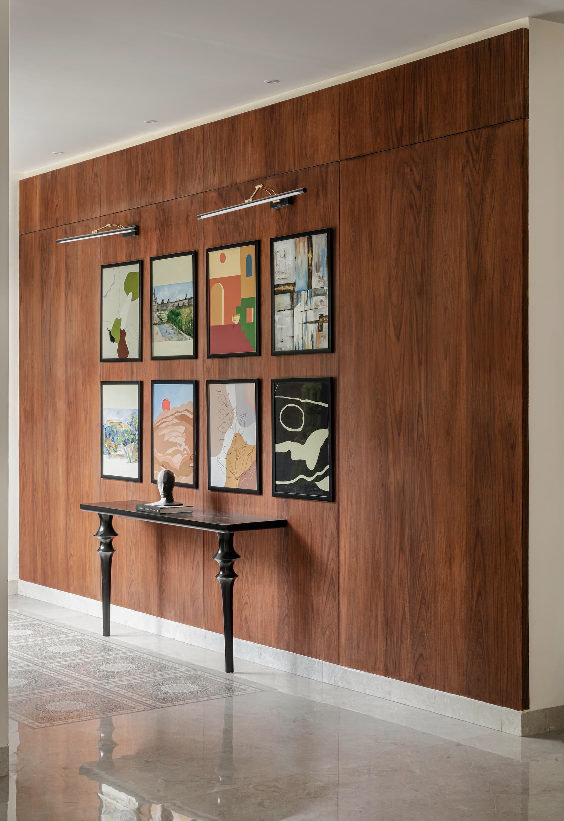 The console table, with its bold design and dark wood finish, serves as a striking focal point, contrasting beautifully against the light walls. It’s a perfect example of how the home blends modern and classic aesthetics to create a sense of balance and tranquility.