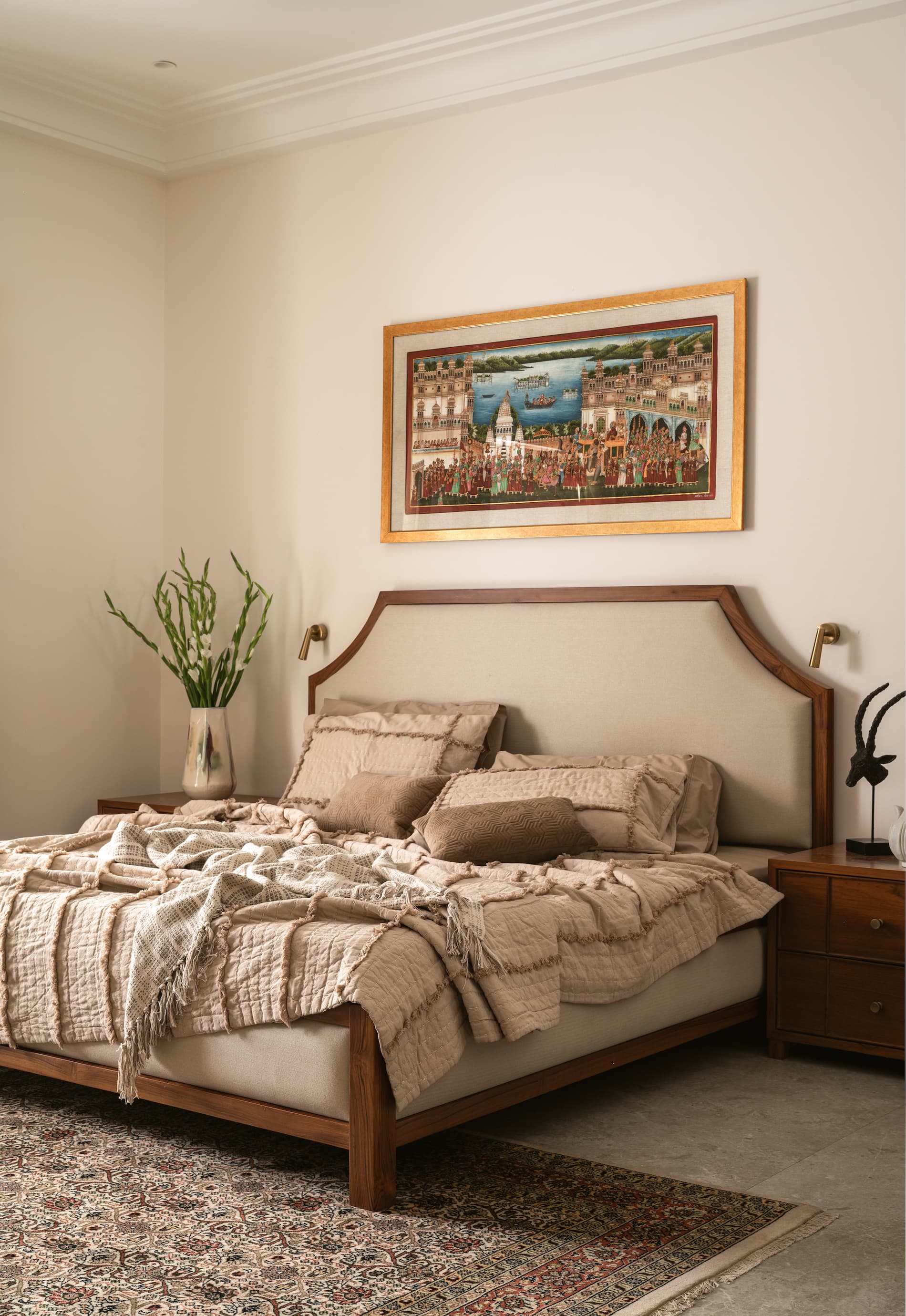 The bedrooms offer a perfect balance of traditional and contemporary design elements, creating serene retreats within the home. In the master bedroom, the neutral color scheme is elevated by rich textures and carefully selected decor, ensuring a timeless yet inviting atmosphere. One of the standout features is the trio of organically shaped mirrors, artfully placed above a sculptural dark wood console table. This striking arrangement breaks the linearity of the surrounding furniture, adding a playful yet sophisticated touch to the space.