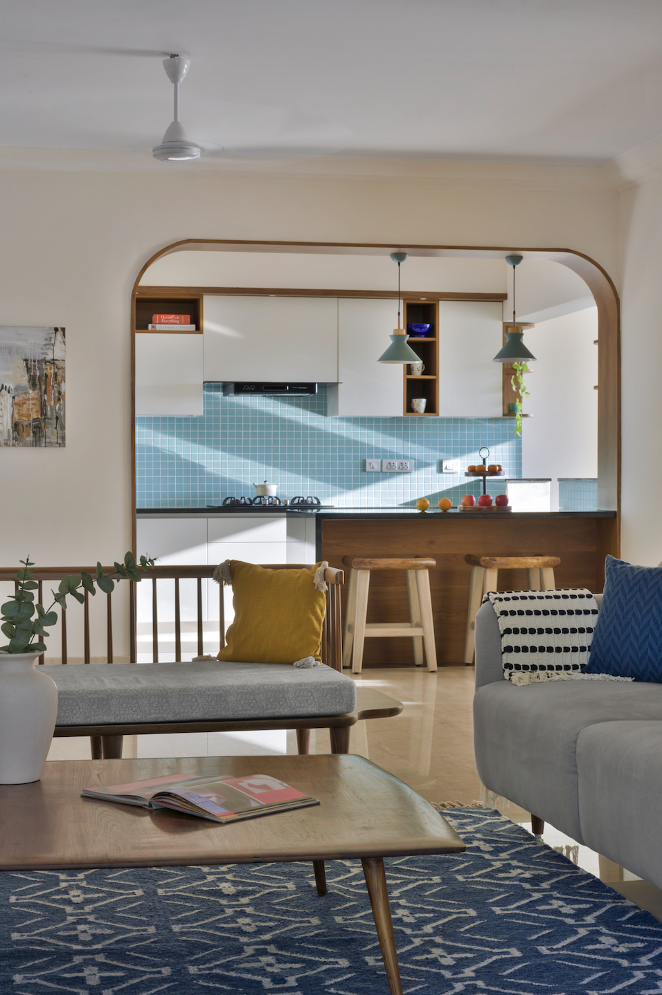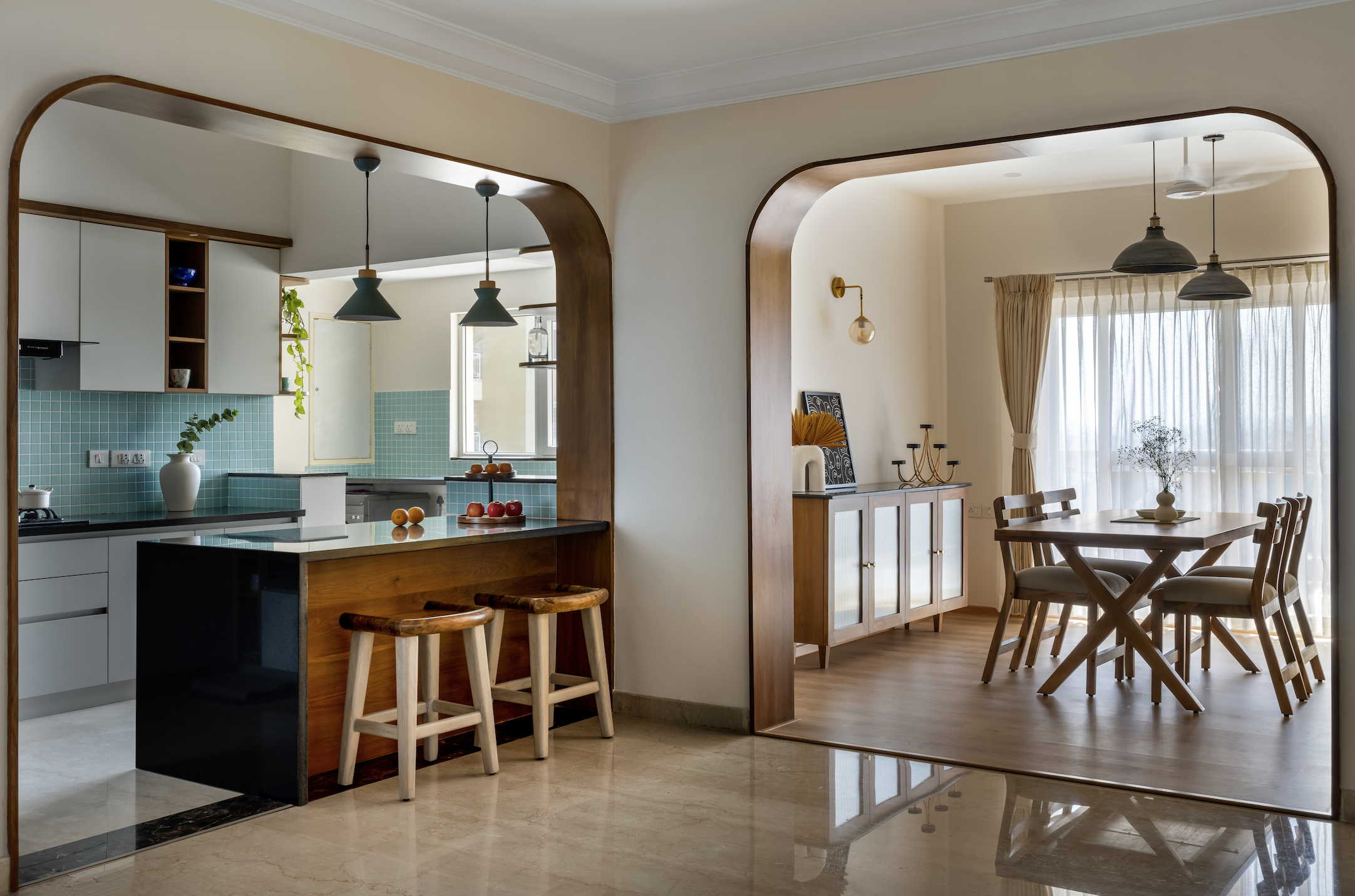 The living room resembles a courtyard with every room, including the kitchen, dining room, and foyer, looking into it, and vice versa. The design team suggested veneer panelling around the arches for a warm appearance, while maintaining an airy feeling throughout. The natural teak finish ties all the veneer-based units and elements together, from the crockery to the TV unit, study/side ledges, wooden slats, and breakfast counter fascia.