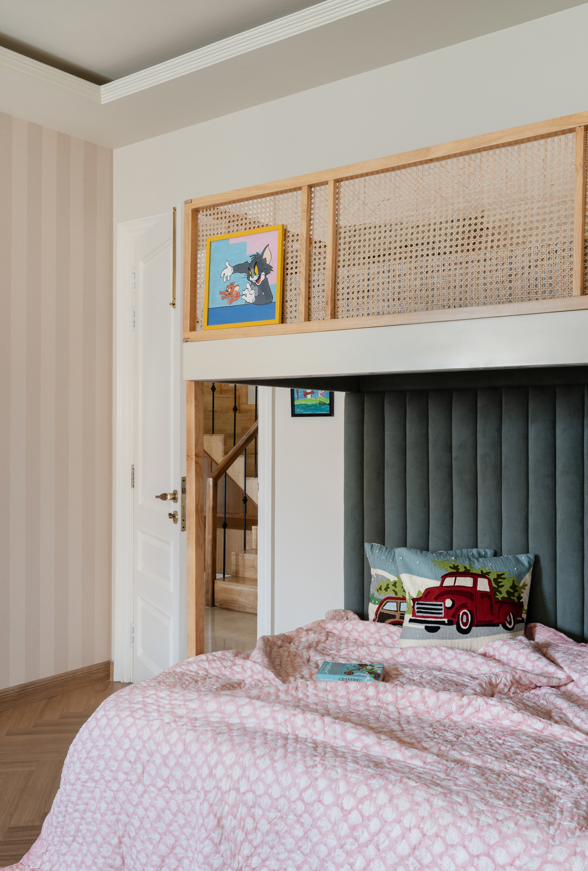 The master bedroom on this floor offers a serene escape, adorned with soft linens and earthy tones. This blend of French and English sensibilities creates a calming, luxurious environment, perfect for rest and rejuvenation. The integration of pastel colours and minimalistic wall treatments enhances the floor’s light, airy feel, making it a tranquil retreat within the home.