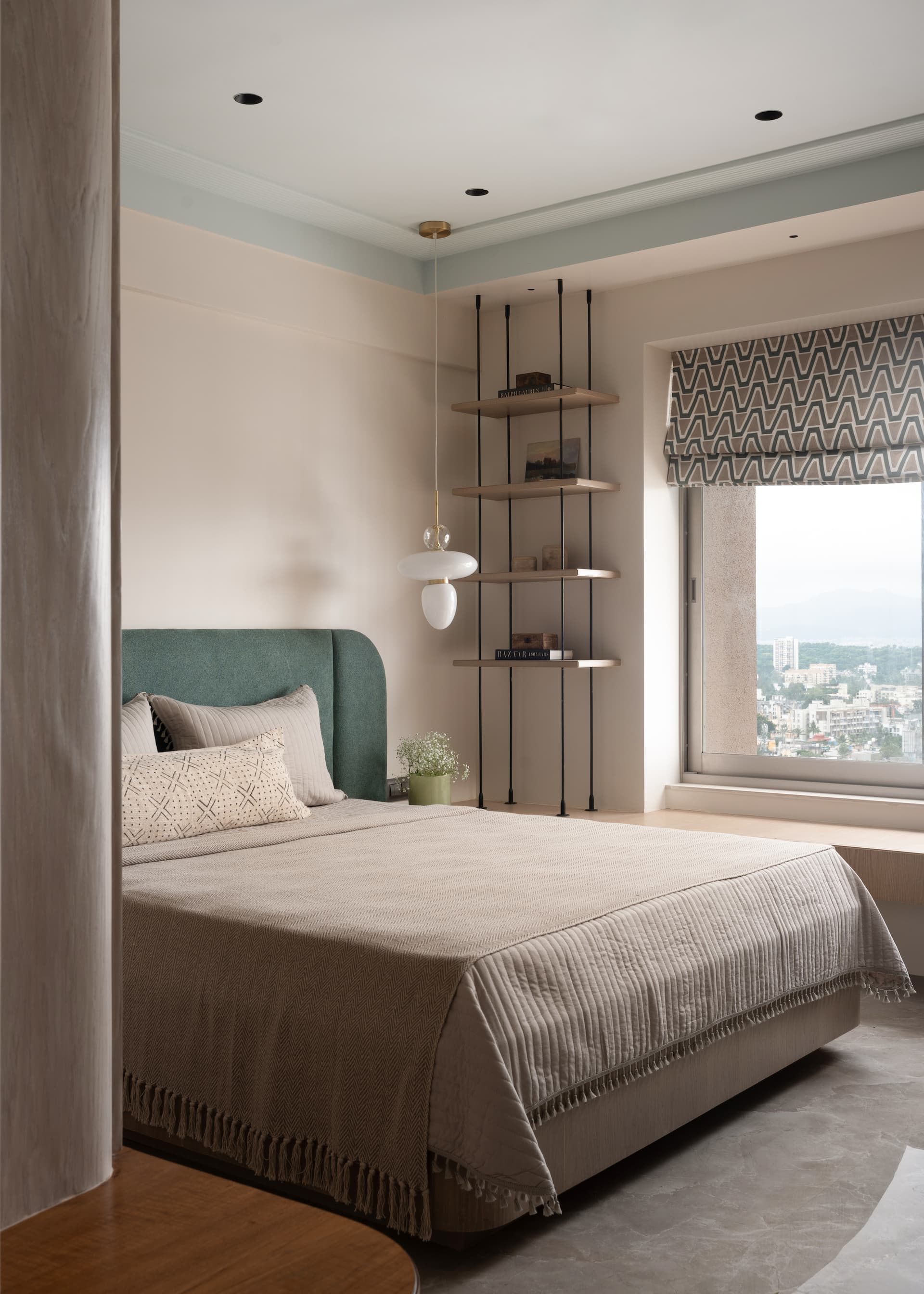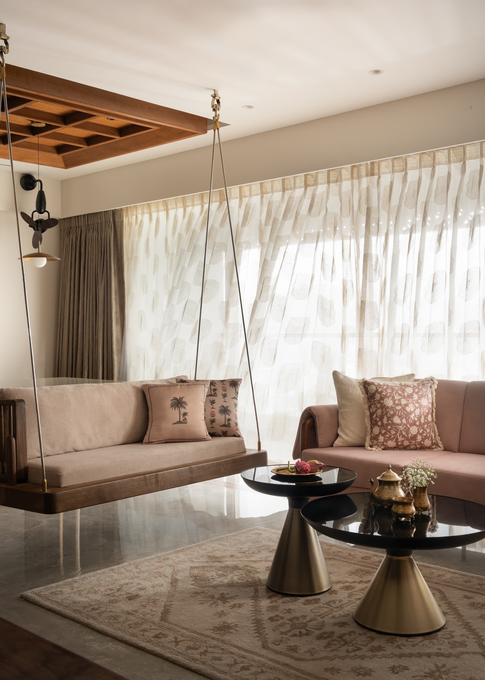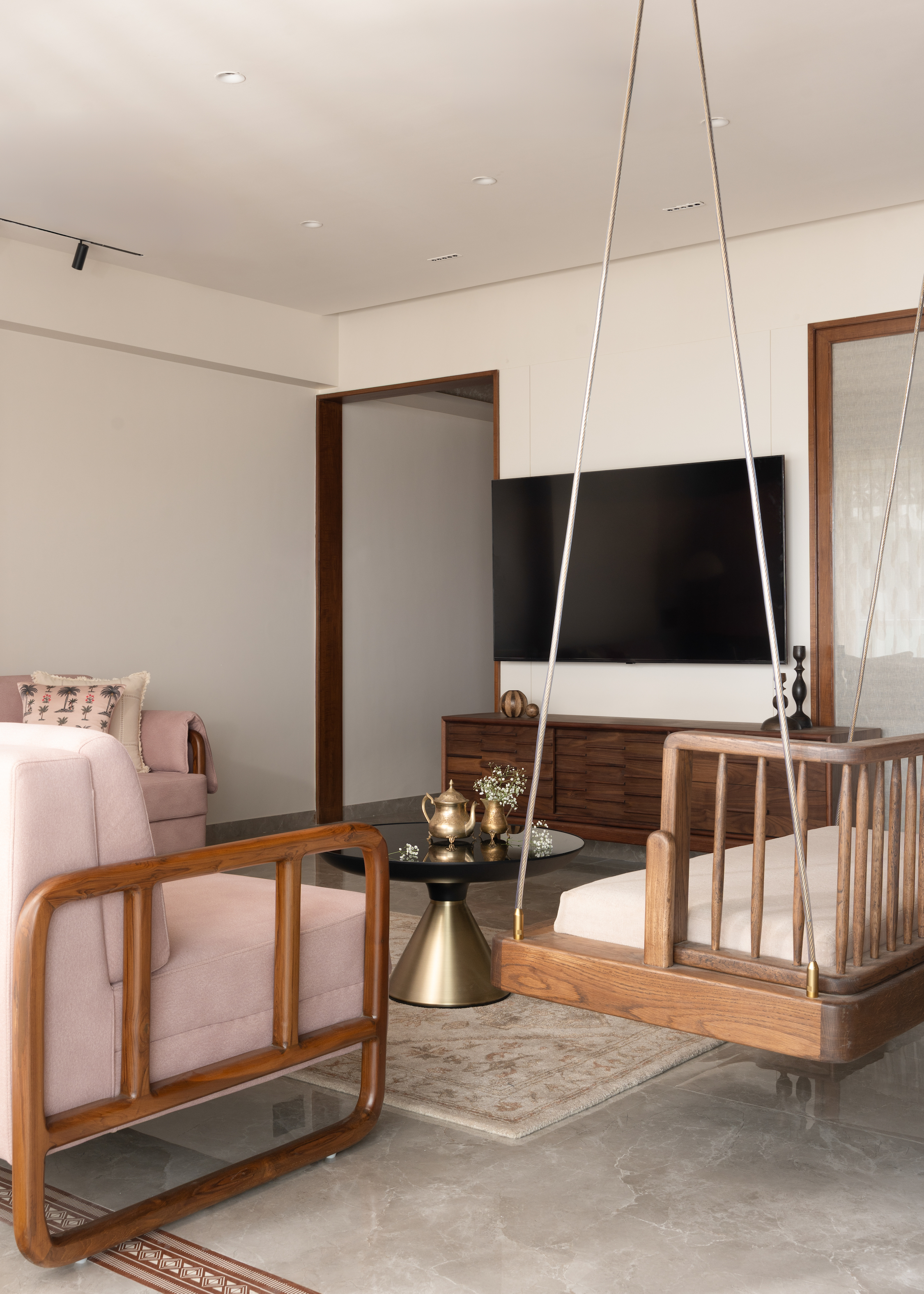Both homeowners grew up in spaces where design held purpose. Familiar elements like carved wooden furniture, bold hues, brass details, textured fabrics, and the beloved swing shaped their childhood homes. The swing, especially, carried nostalgic weight, tied to family, storytelling, and slow conversations with grandparents. For years, it remained a quiet desire, never fitting into the functionality of their previous residences. This apartment, the one they see as their long-term home and eventual retirement haven, offered the perfect opportunity to honour that memory with intention.