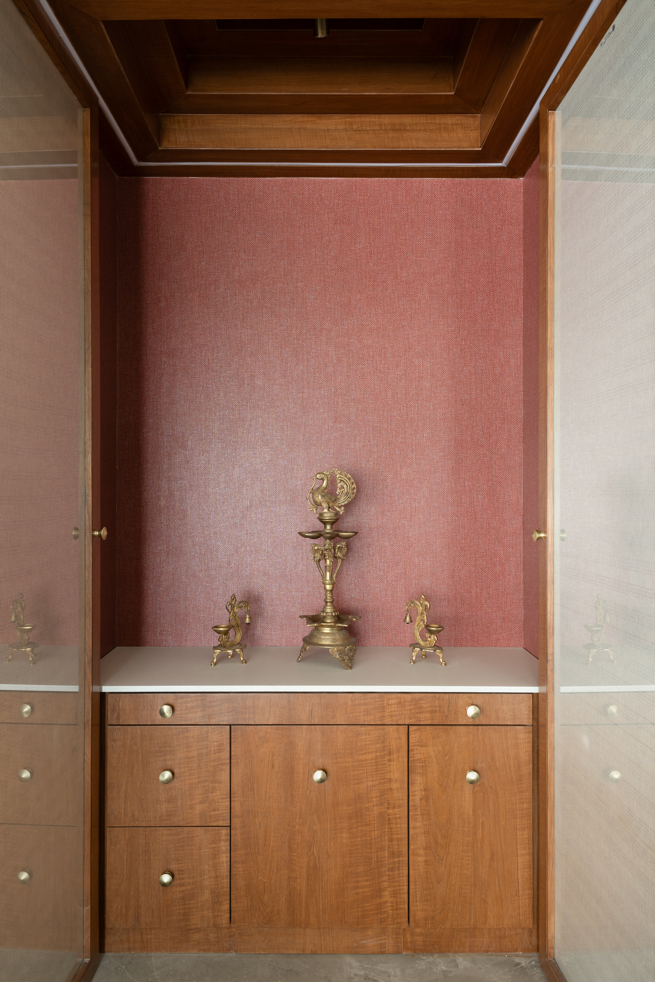 Modern functionality and heritage inspired elements coexist seamlessly. The marble and brass dining ensemble exudes elegance without excess. The mandir, lined in a striking red interior, becomes a quiet moment of pause. The kitchen, with patterned flooring, clean forms, and warm finishes, balances precision and personality.
