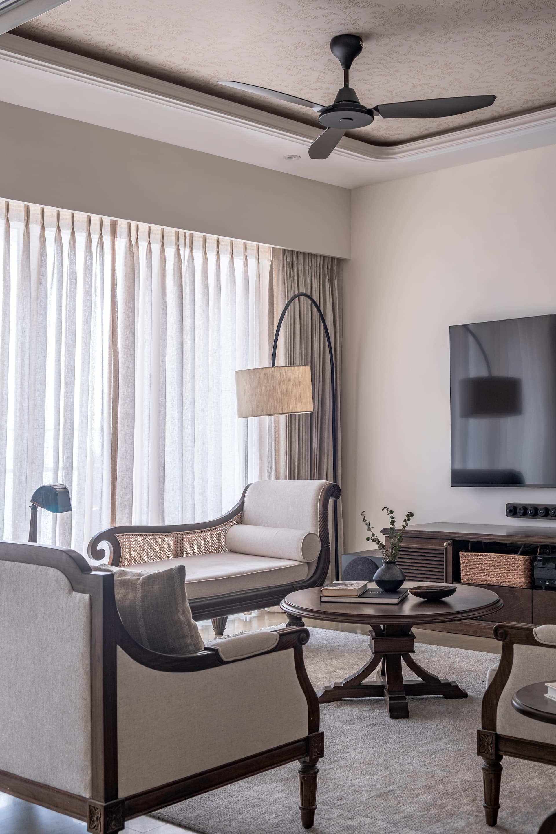 The inception of Vintage Vista was driven by homeowner Bijou George’s desire to transform his newly purchased apartment into a home that exudes warmth, character, and a sense of place. George, a financial writer and former hedge fund professional found the original finish of the apartment uninspiring. He sought a space that would reflect his passion for vintage aesthetics while maximising the apartment’s intrinsic advantages, such as its prime location and stunning views. The design inspiration for Vintage Vista was deeply rooted in the artisanal heritage of South India, particularly the Chettinad architecture known for its intricate detailing and use of traditional materials. Each design element was carefully chosen to pay homage to the past while ensuring a harmonious flow of textures and colours throughout the home.