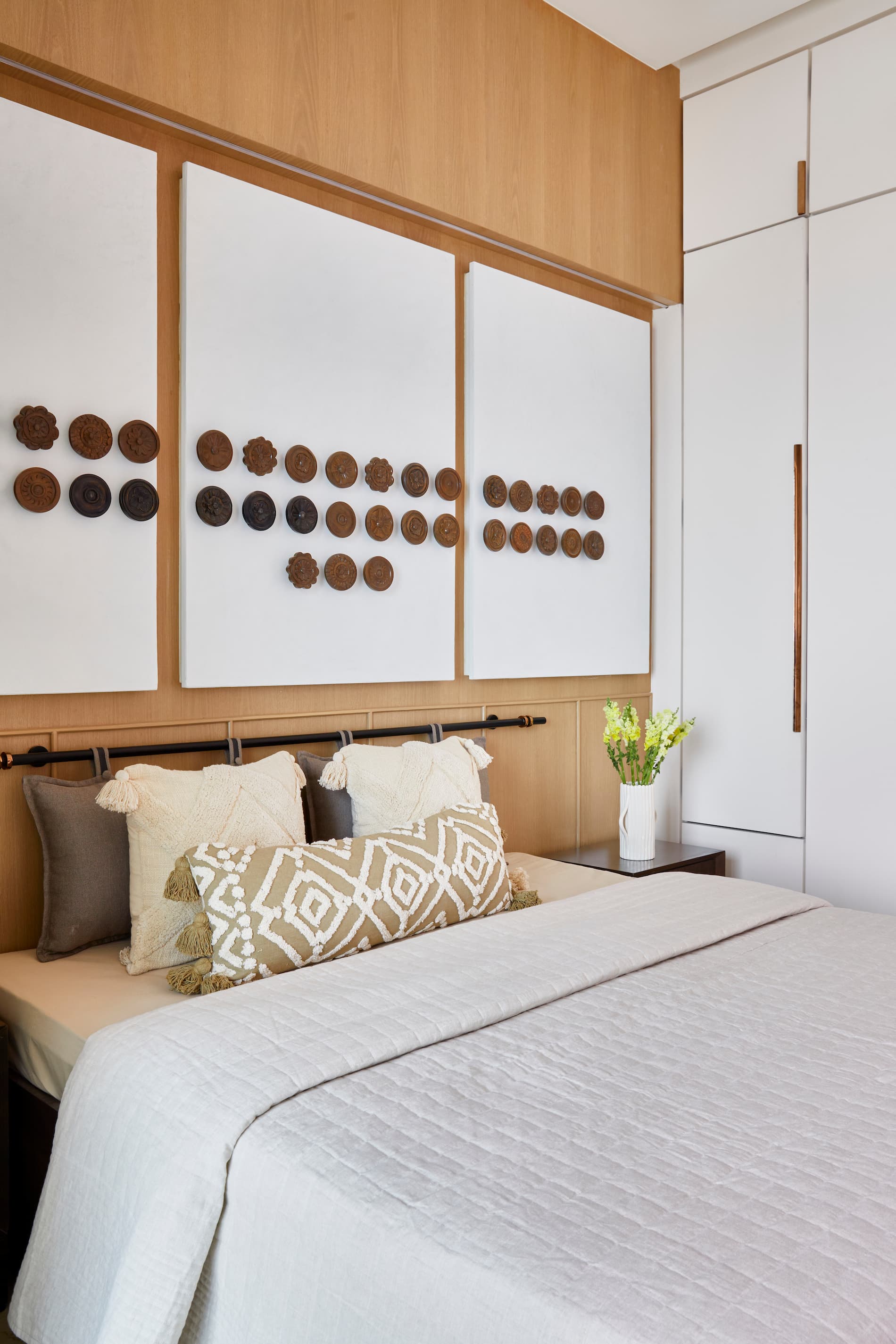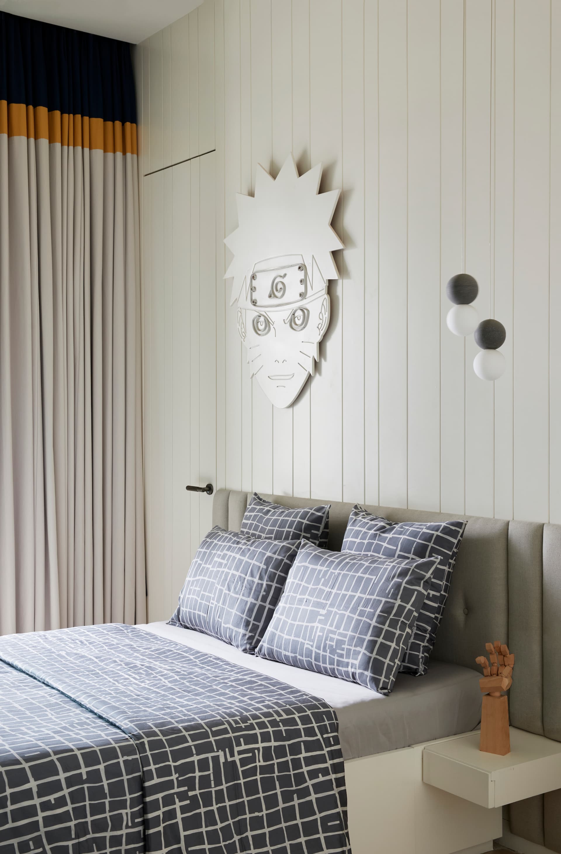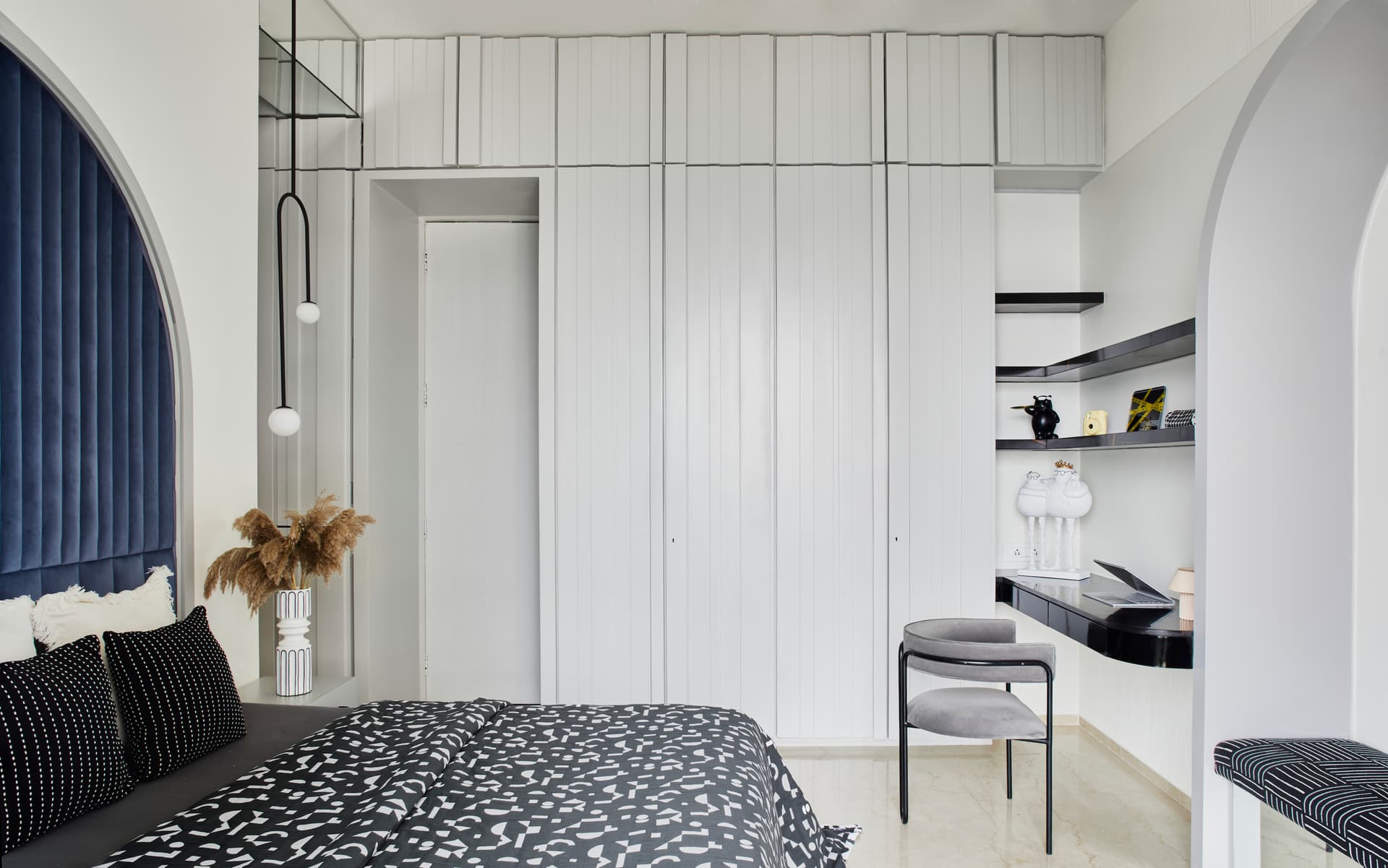 Each bedroom reflects individual preferences while adhering to the overall design concept. The son’s bedroom features his favorite characters and a color scheme of blue, greys, and yellows. The daughter’s room, designed with a chic and edgy atmosphere, incorporates blacks, greys, and blues, with arches as a dominant feature. The parents’ bedroom maintains a minimalist aesthetic with simple white wardrobes and a custom-made metal rod with hanging pillows as the bed wall’s highlight.