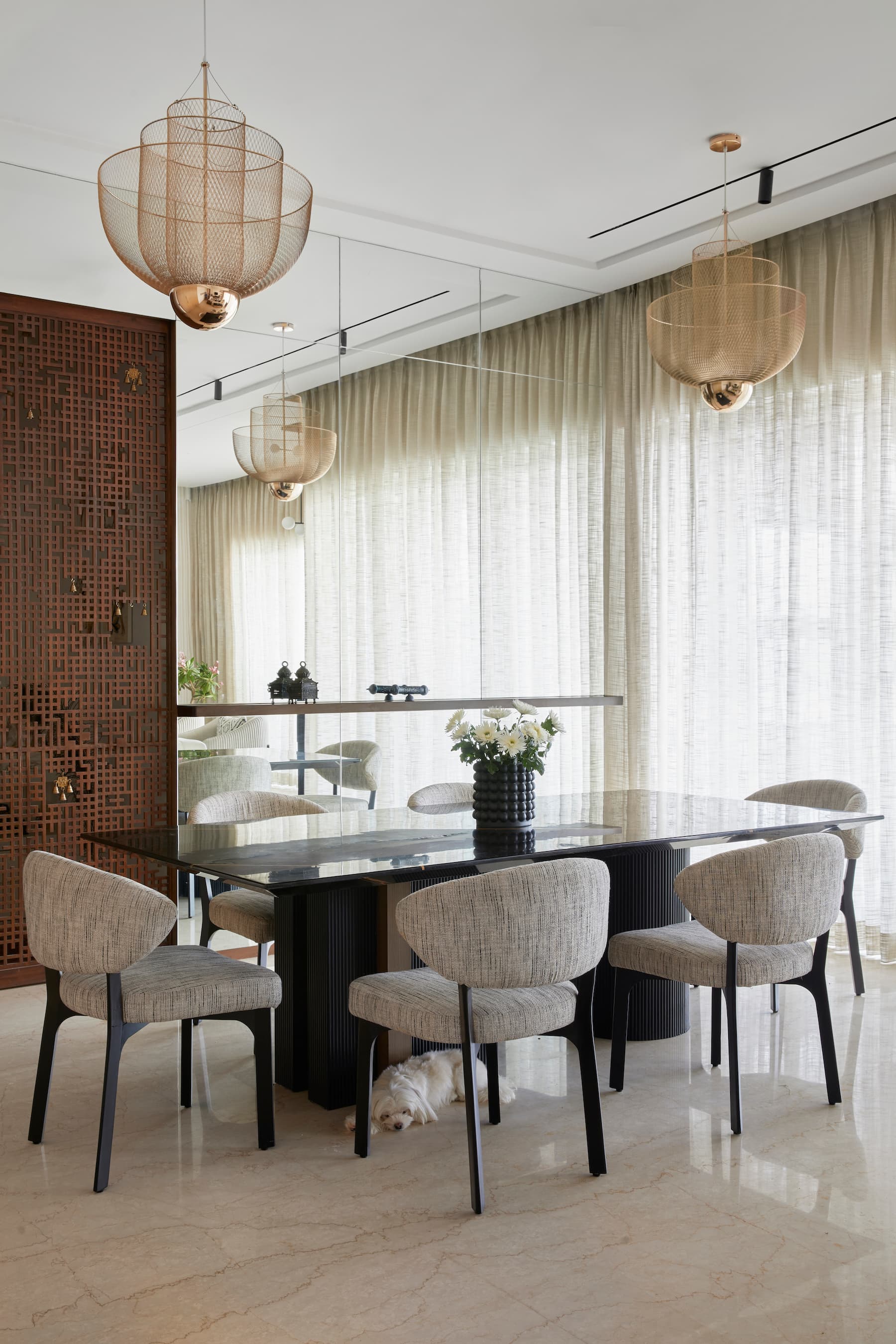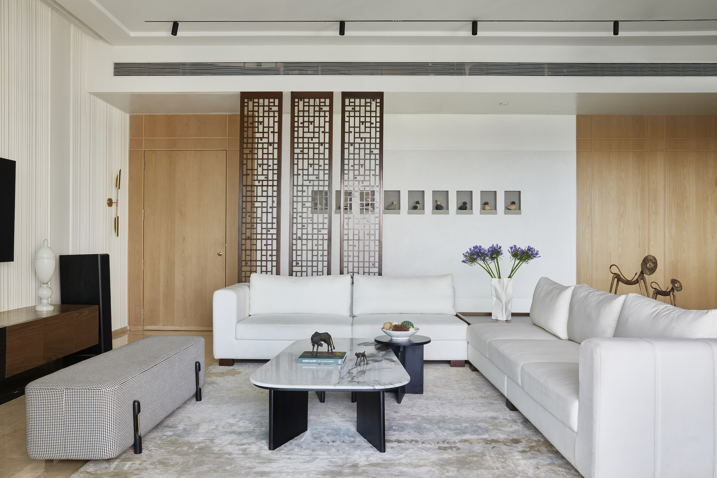 Throughout the apartment, long pendant lights, a neutral colour palette, curated accessories, and minimal art displays enhance the modern theme. Attention to detail in flooring patterns, textured walls, and customised elements creates a cohesive and visually appealing space, merging contemporary aesthetics with timeless design principles. The result is a home that seamlessly blends each family member’s personality while maintaining an overall sense of character.