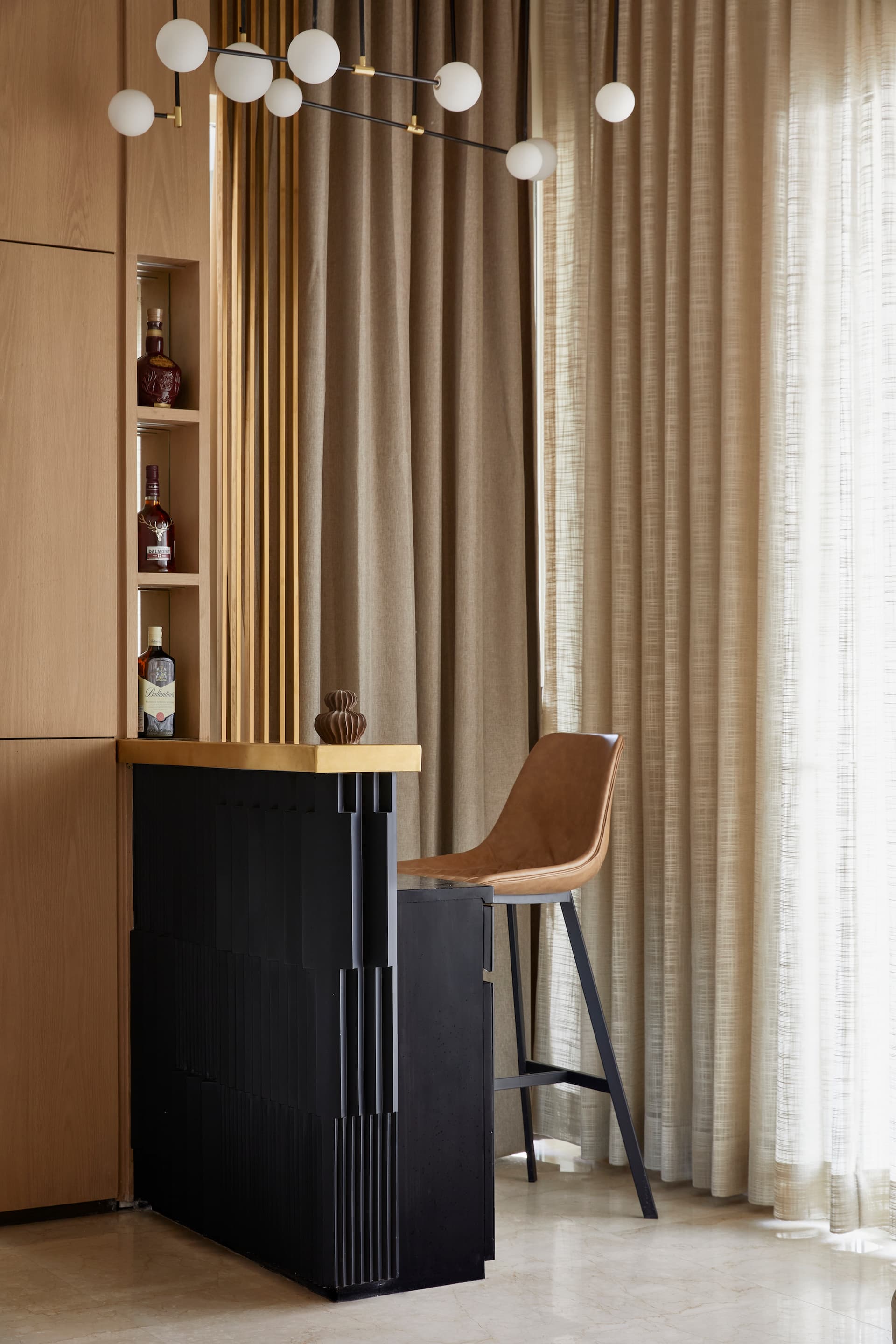 This 4 BHK apartment on the 24th floor of a suburban Mumbai highrise has been transformed into a modern, minimalistic haven. Spanning 2100 square feet, the space accommodates three generations, allowing each individual’s personality to shine within a cohesive, timeless design. The high ceilings and expansive balconies that run the length of the apartment enhance the sense of volume and offer serene outdoor spaces with stunning views.