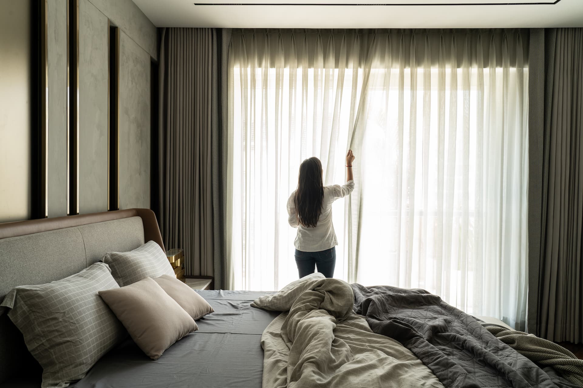 A graceful passage leads to the serene mother’s bedroom, where warm-toned veneer juxtaposes elegantly against beige wall finishes and antique gold metal accents. Wall light from Shailesh Rajput adds a layer of personality to the space. The en-suite bathroom exudes a monochromatic white ambience, enhanced by rich gold fittings that create visual interest.