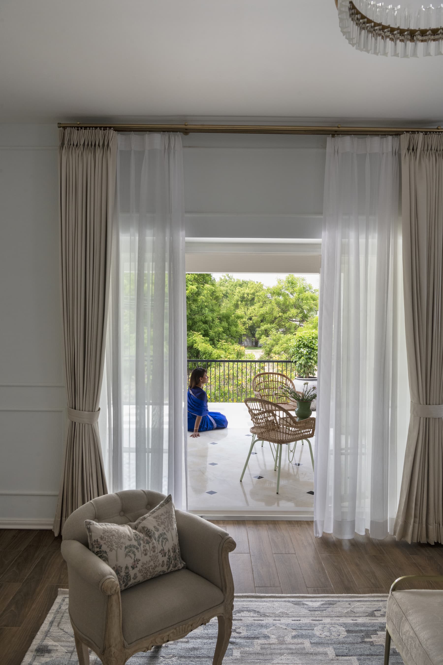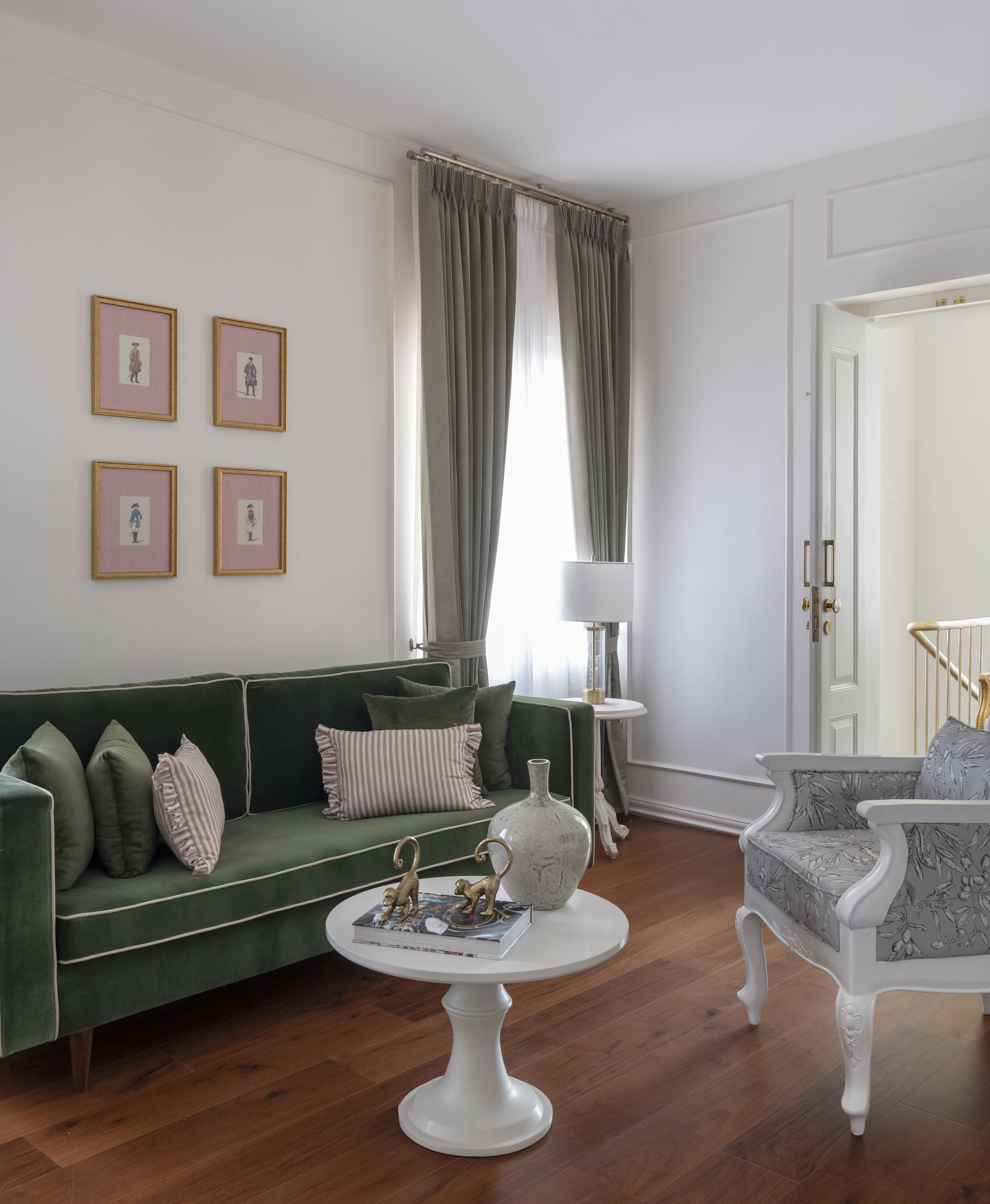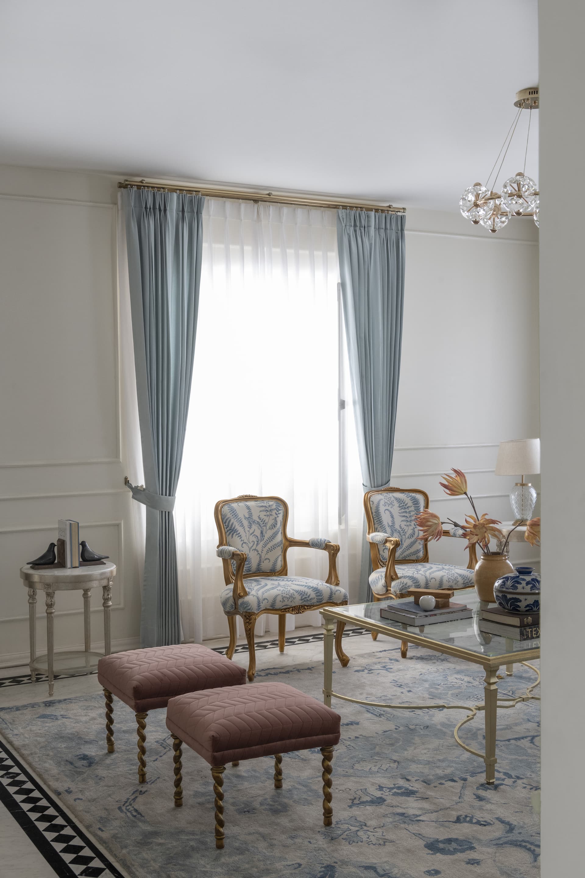 The journey continues into the living room, where an artful mix of pastel-coloured furnishings and floral prints softens the space, evoking a sense of comfort and serenity. Custom-made French-style doors and windows, adorned with wainscoting details, frame the room, allowing natural light to cascade into the space and accentuate the elegant décor.