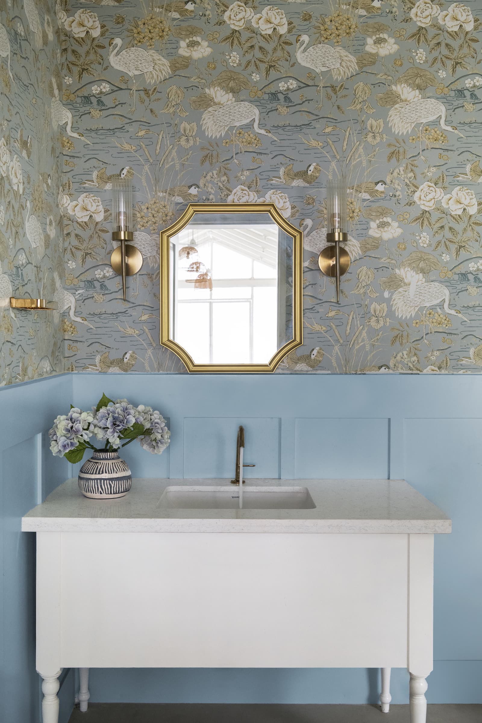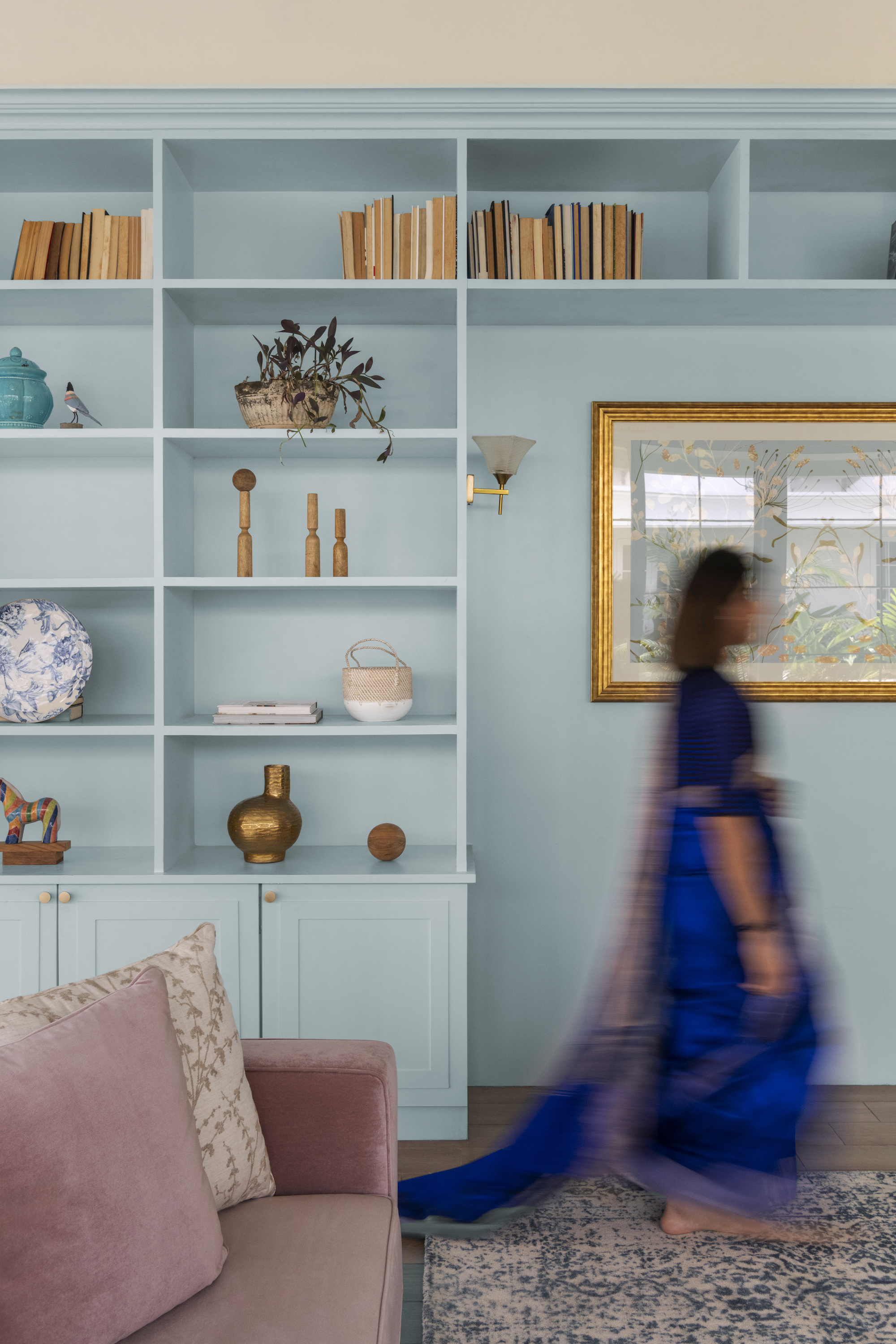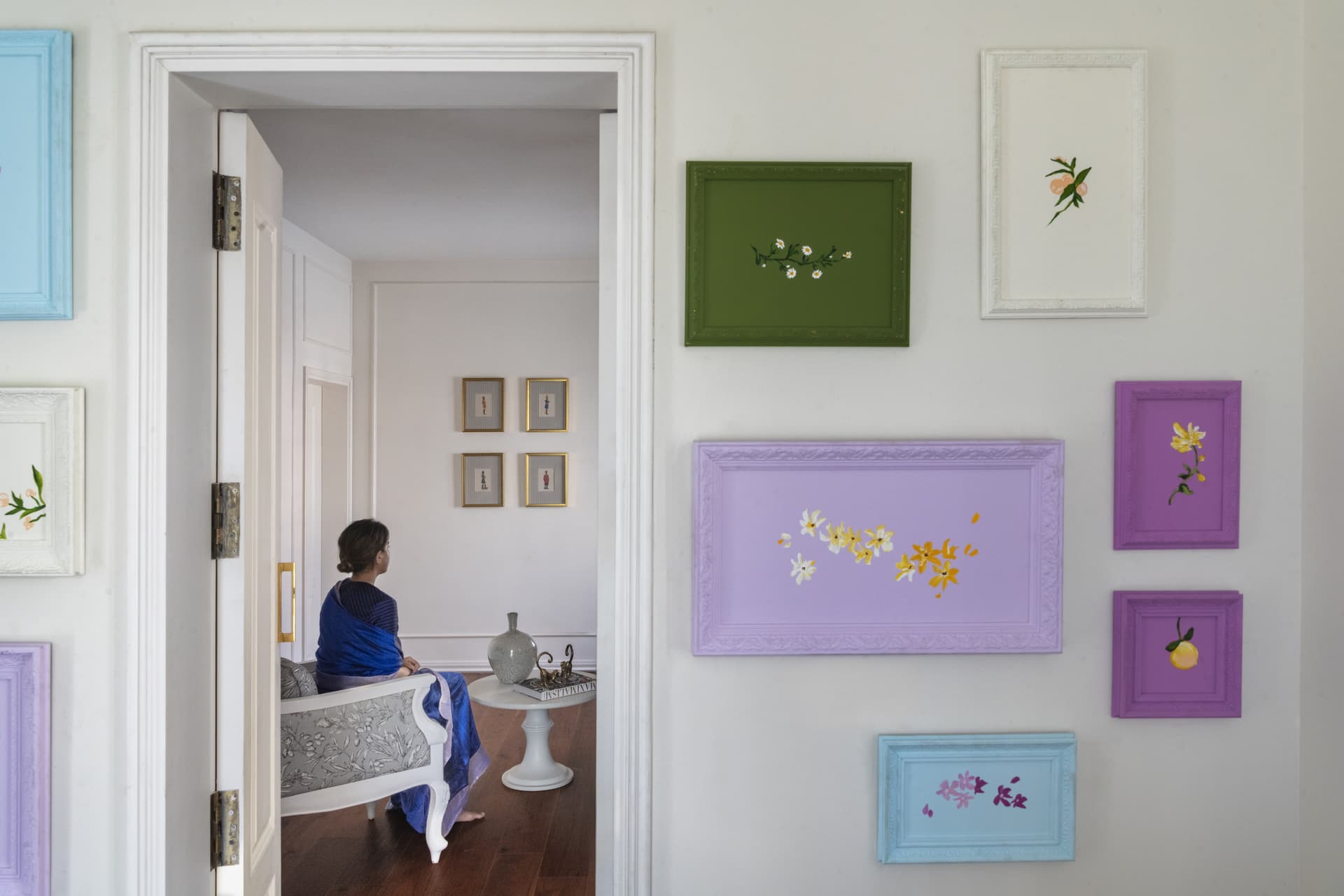 The journey continues into the living room, where an artful mix of pastel-coloured furnishings and floral prints softens the space, evoking a sense of comfort and serenity. Custom-made French-style doors and windows, adorned with wainscoting details, frame the room, allowing natural light to cascade into the space and accentuate the elegant décor.