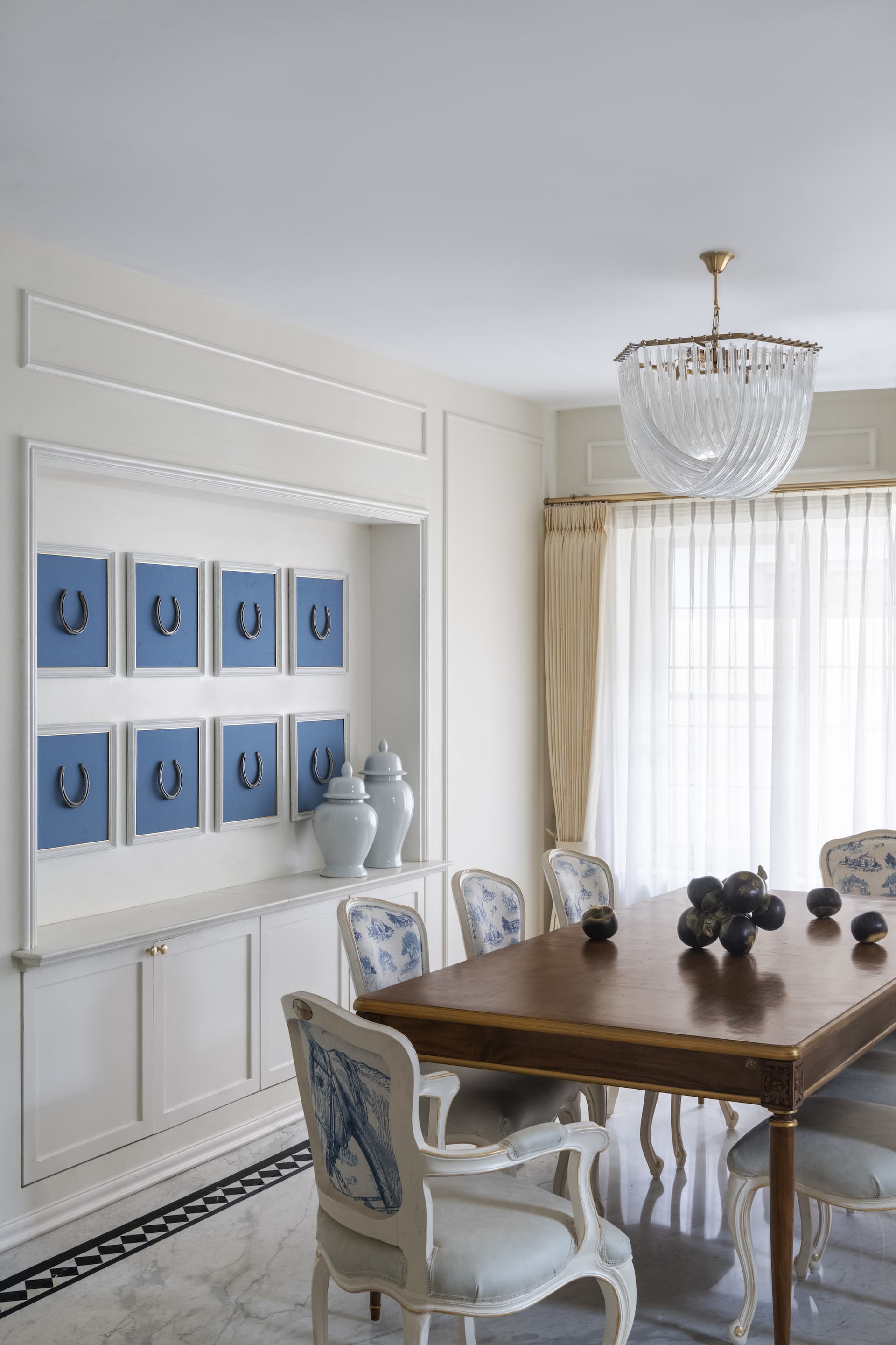 Transitioning from the living area to the dining room, one encounters a space that is deeply personal and distinctive. The client’s love for horse riding is thoughtfully woven into the design, with dining chairs named after their horses and worn-out horseshoes framed as wall décor. This equestrian-inspired motif adds character and emotional depth to the space, creating a dining experience that is both intimate and reflective of the family’s passions.