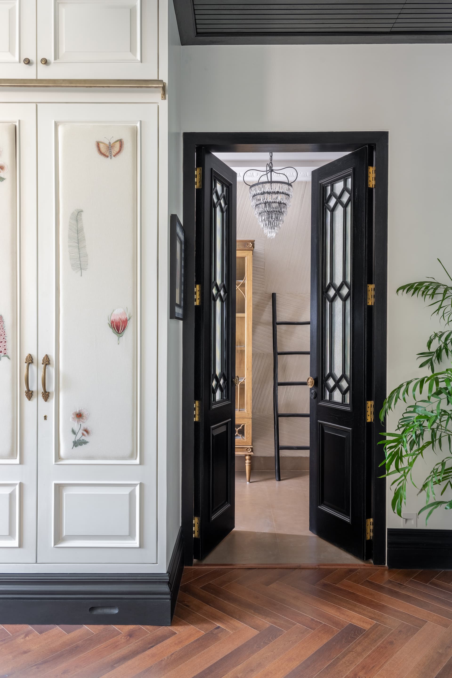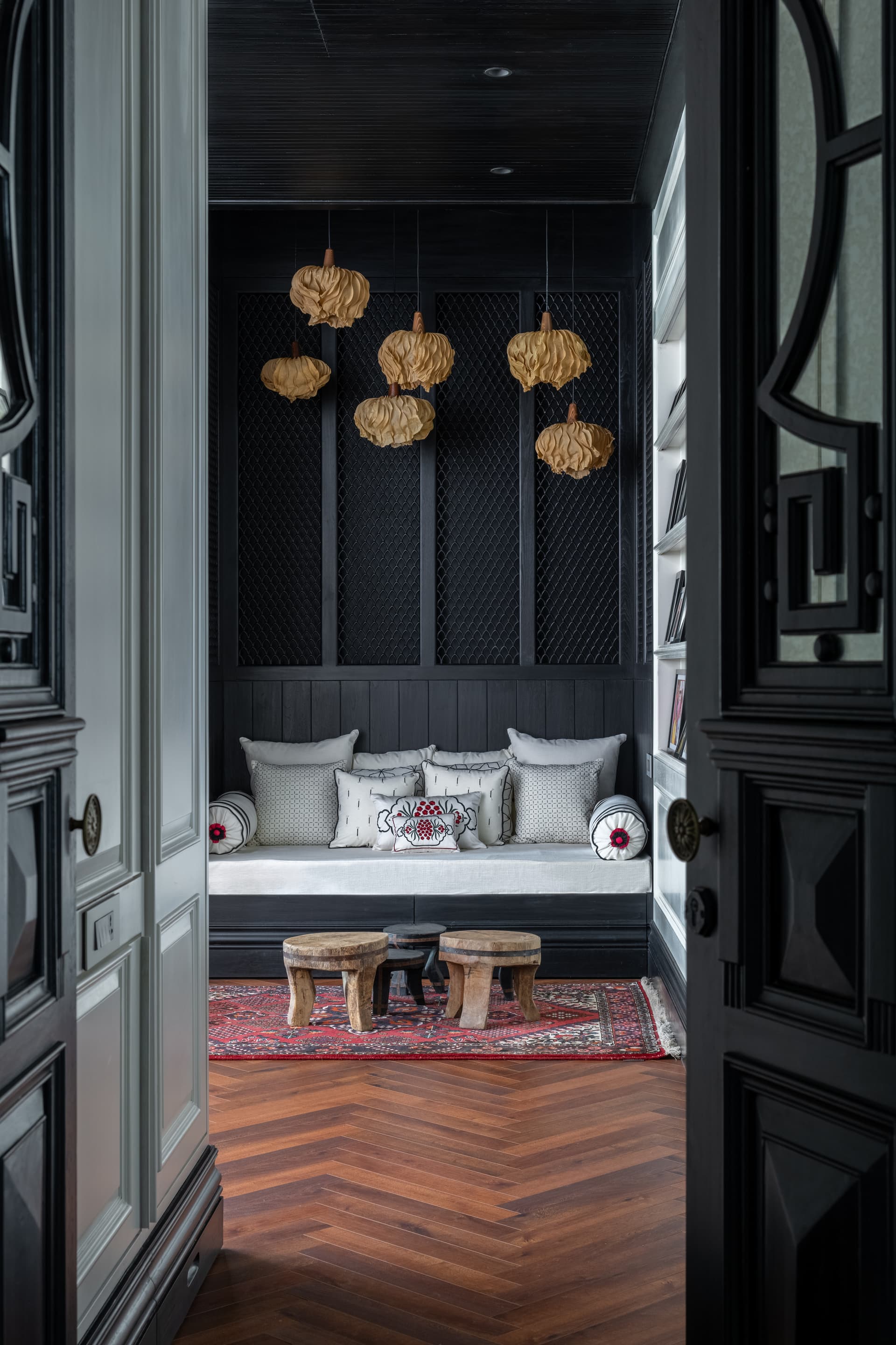 The living room is a bold interplay of black and white, elevated by carefully curated art and artisanal décor. A dripping chandelier cascades from the ceiling, its opulence balanced by the warm texture of wooden flooring and wainscoted walls. A helix-shaped black staircase, illuminated by metallic hand-painted walls, serves as a sculptural centerpiece, tying the grandeur of the space together.