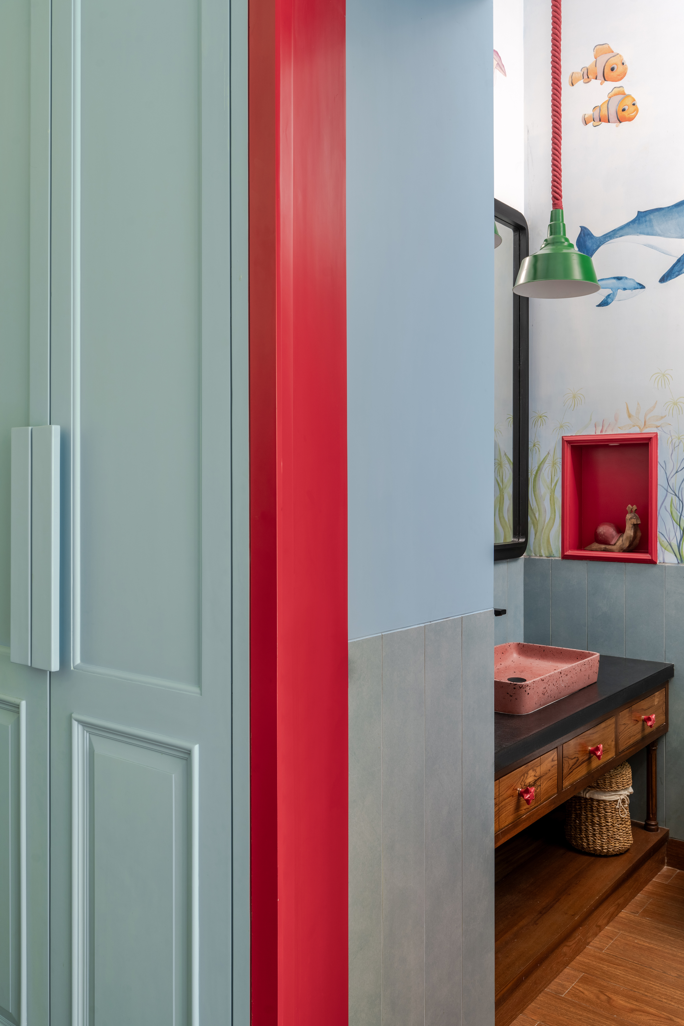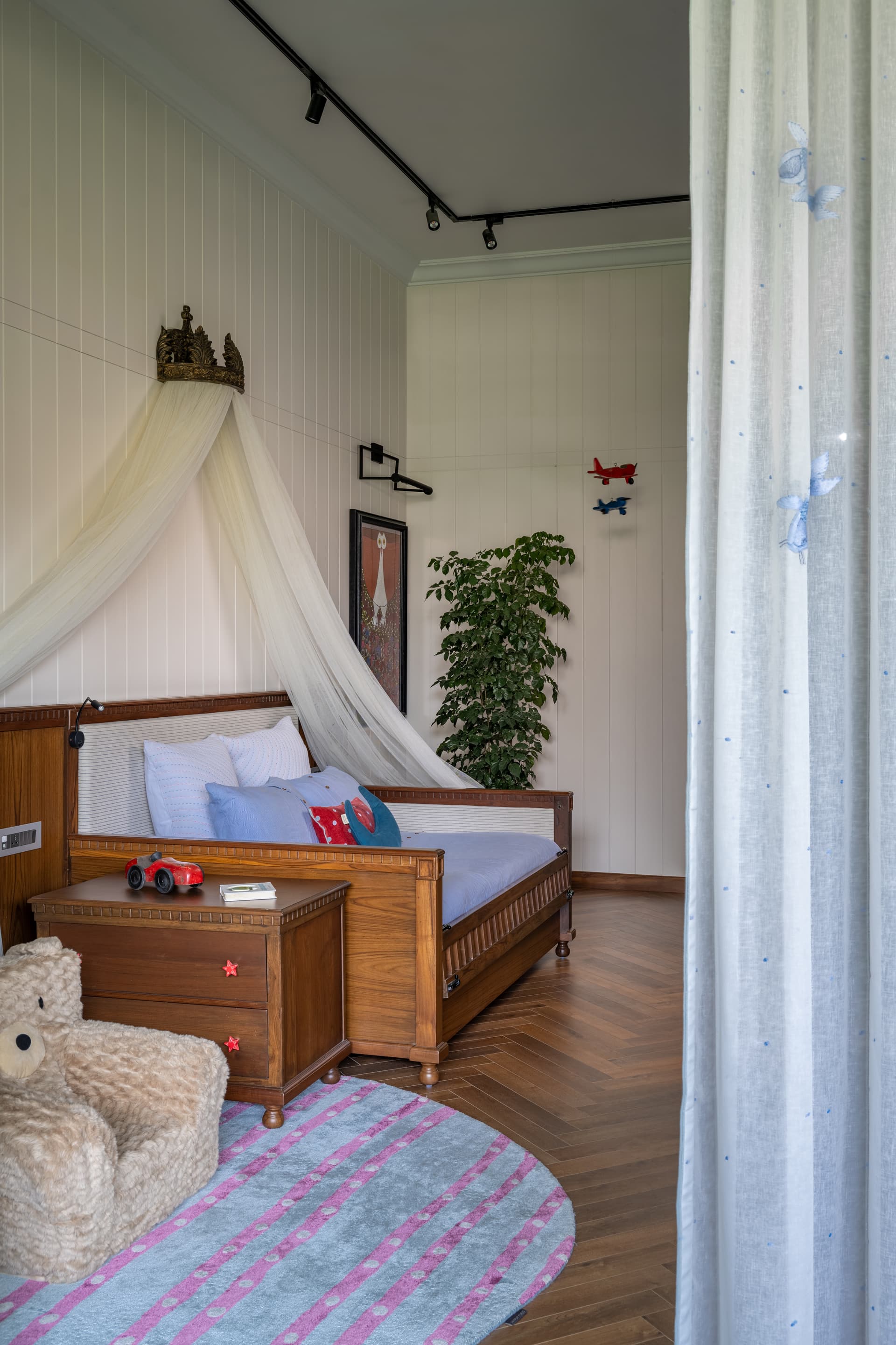 The child’s bedroom is a whimsical haven, complete with a draped canopy bed, a cozy teddy bear chair, and aquatic-themed wall art in the ensuite bathroom. Vintage louvered wardrobes, trunk-style side tables, and colorful rugs lend an air of charm and nostalgia, tying the rooms together with an understated elegance.