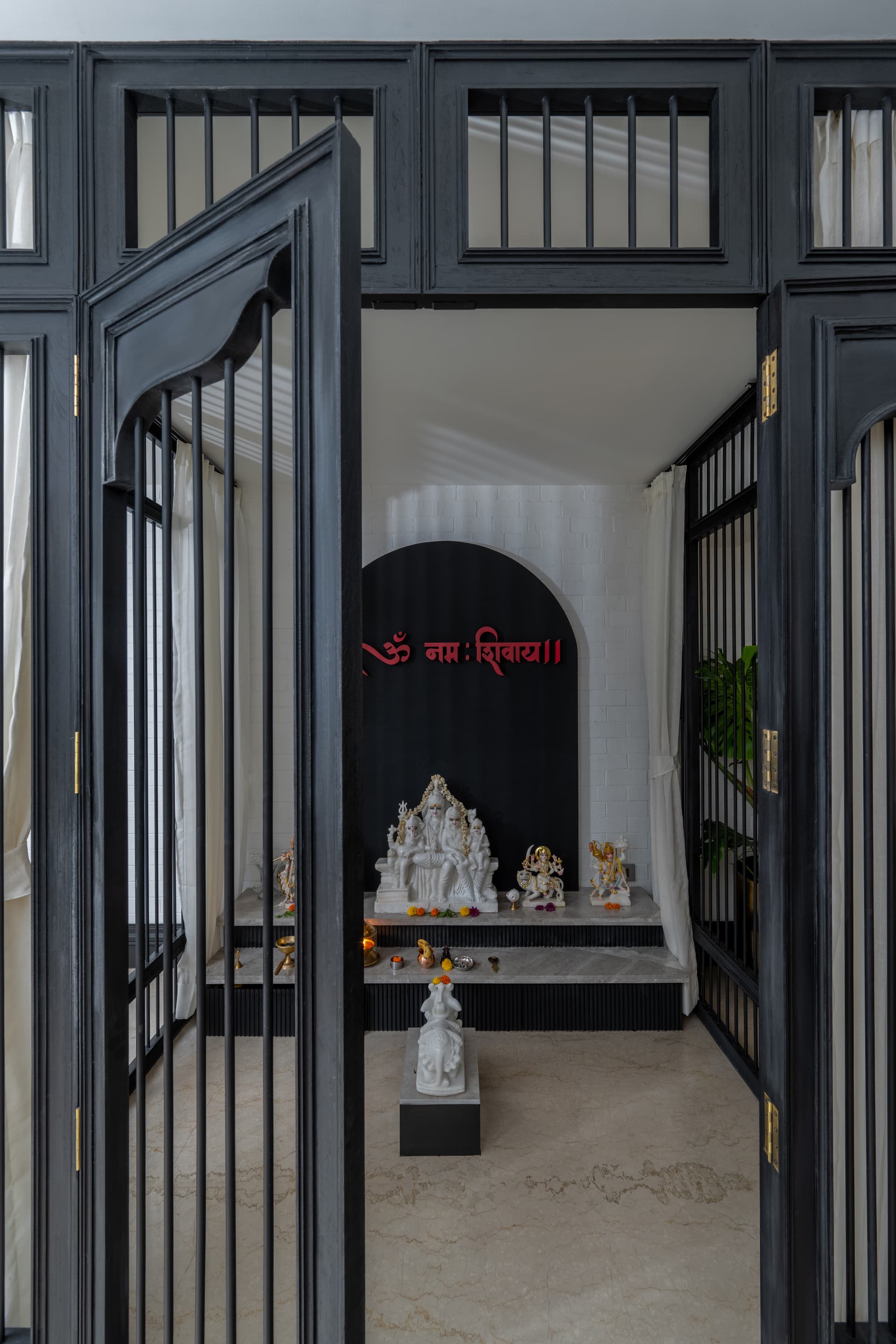 In the dining area, a striking fuchsia pink Suzani textile adorns the wall, breaking the monochromatic scheme with vibrant flair. This is complemented by a vintage-style dining table, plush velvet accents, and custom lighting that lends an inviting charm to the space. The pièce de résistance is a contemporary black-and-white mandir that radiates sanctity and style in equal measure.