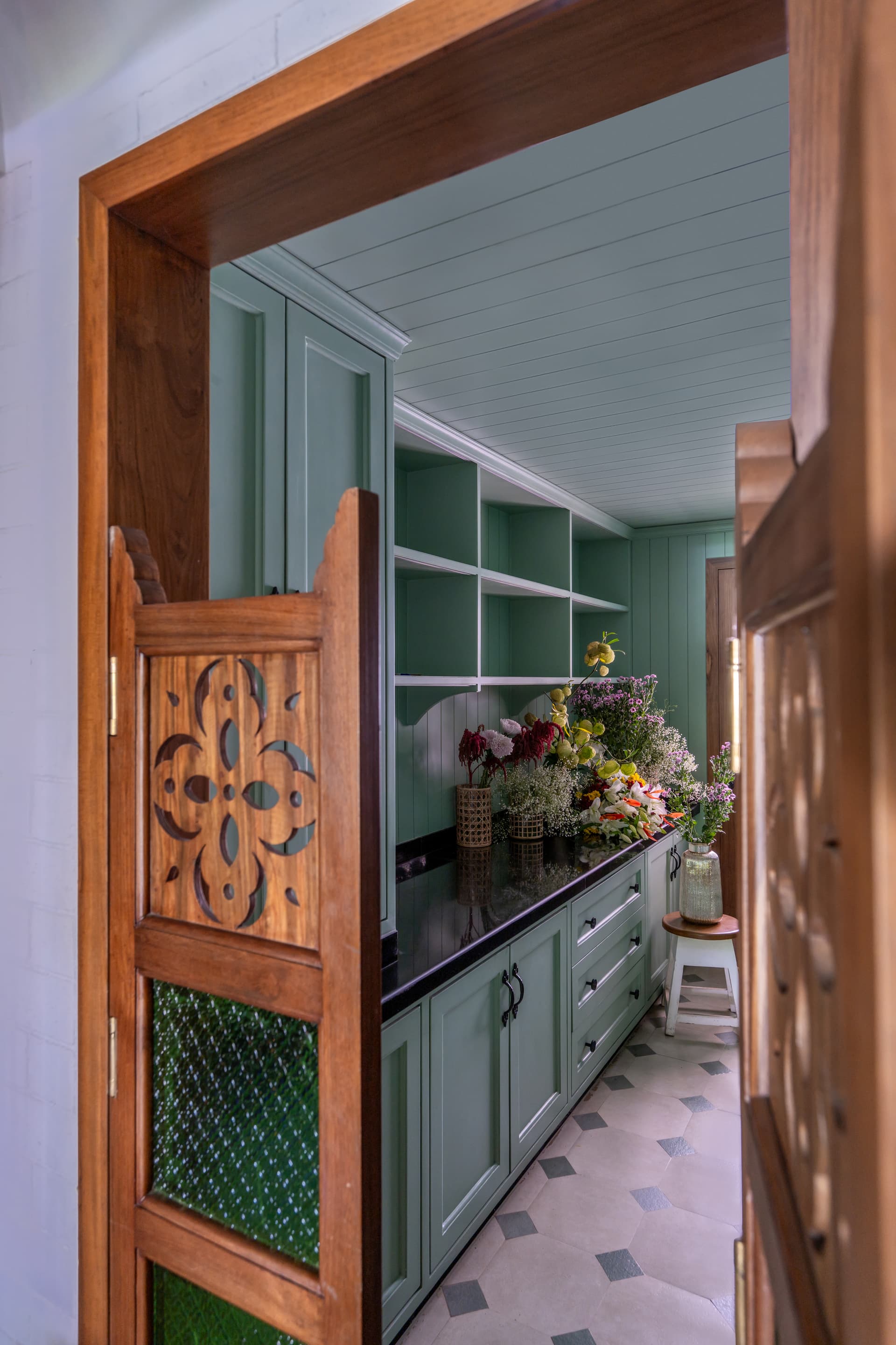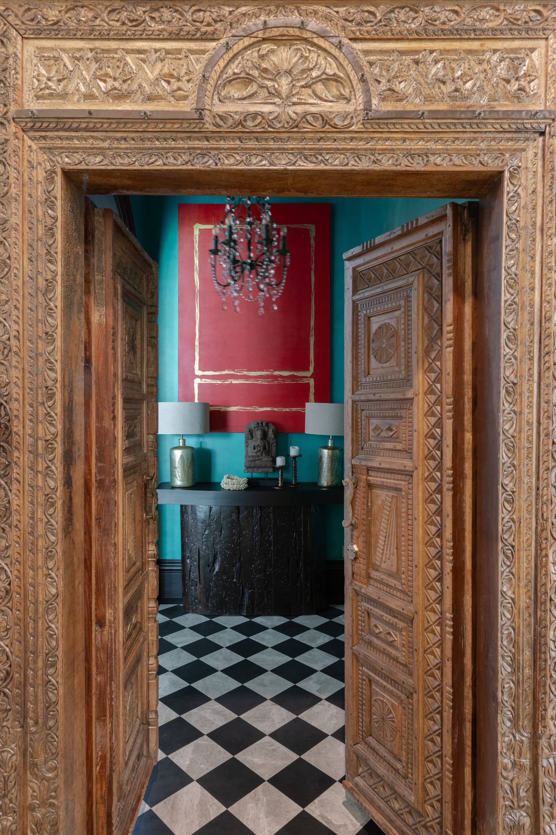 The journey begins with an intricately hand-carved wooden door, framed like a work of art, which sets the tone for the sensory extravaganza that lies within. The entrance foyer—a dramatic teal sanctuary adorned with a striking red art piece and curated curios—immediately commands attention. Custom lighting heightens the intrigue, offering a glimpse into the eclectic maximalist narrative that permeates the home.