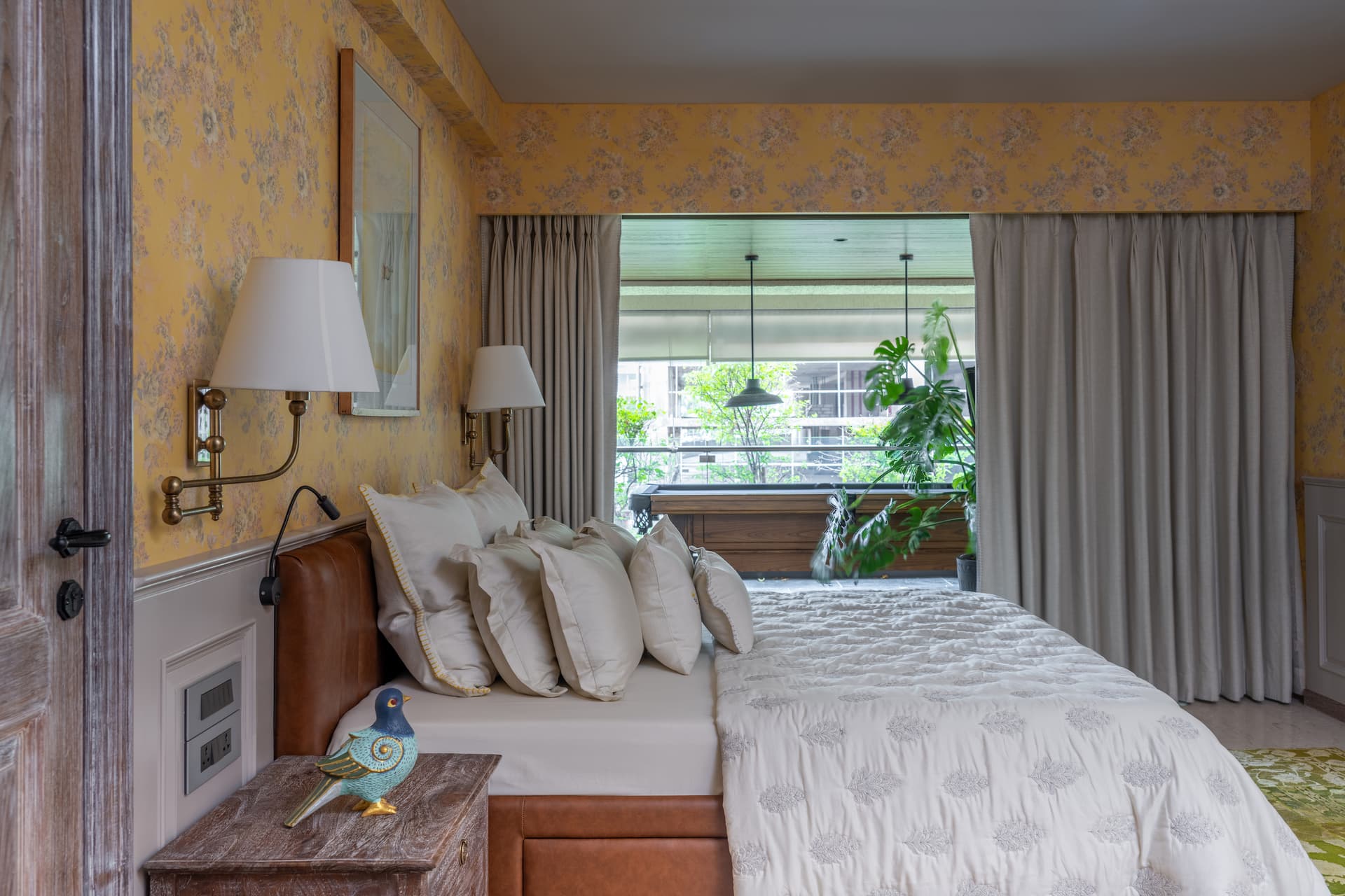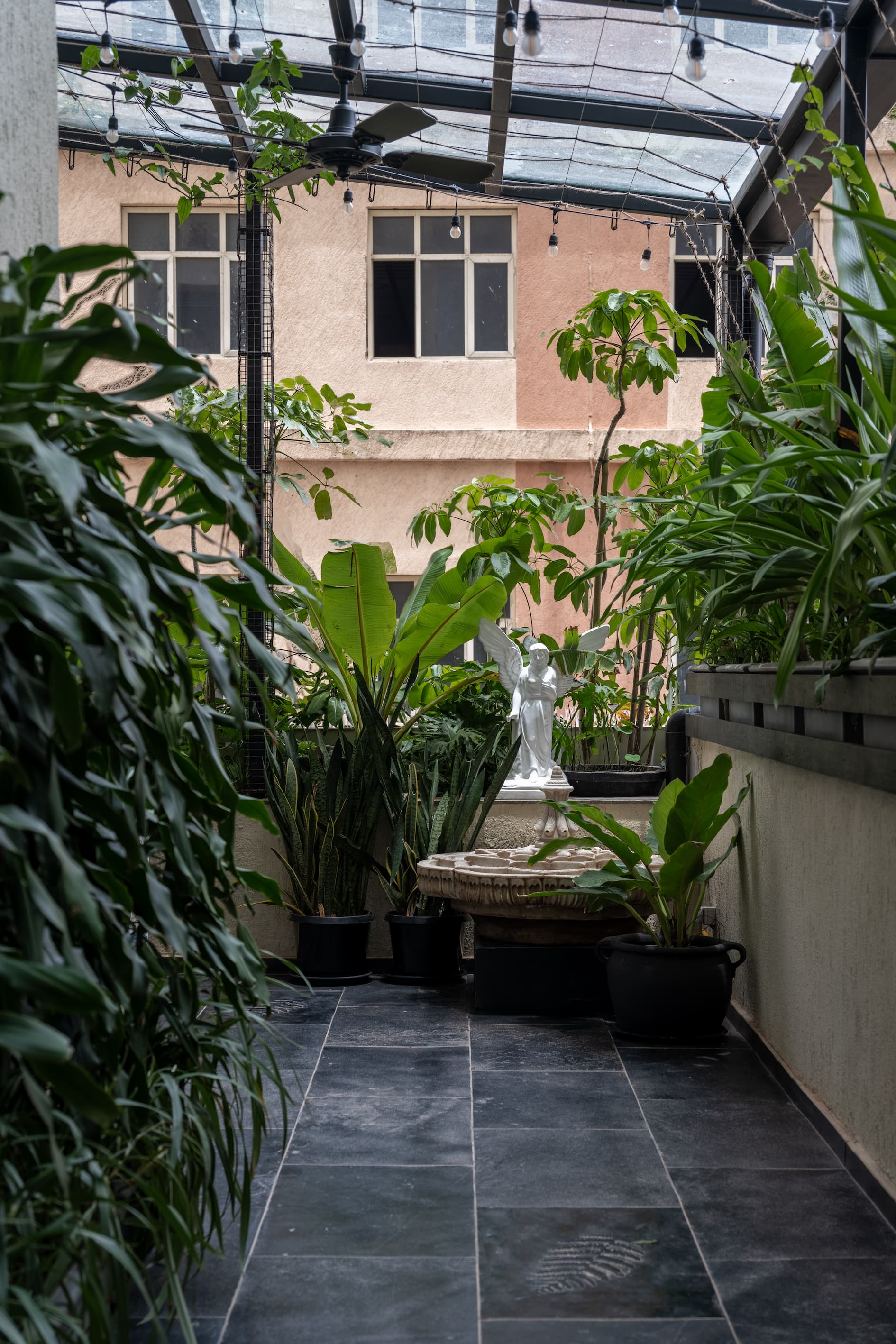 Upstairs, the terrace has been transformed into a glass conservatory—a tranquil oasis that houses a bar, outdoor seating, and a vintage water feature. Vibrant art from Baro adorns the walls, while sunlight streams through expansive windows, creating a vibrant yet serene ambiance. This space also serves as a brainstorming hub, with a den and study tailored for creative pursuits.