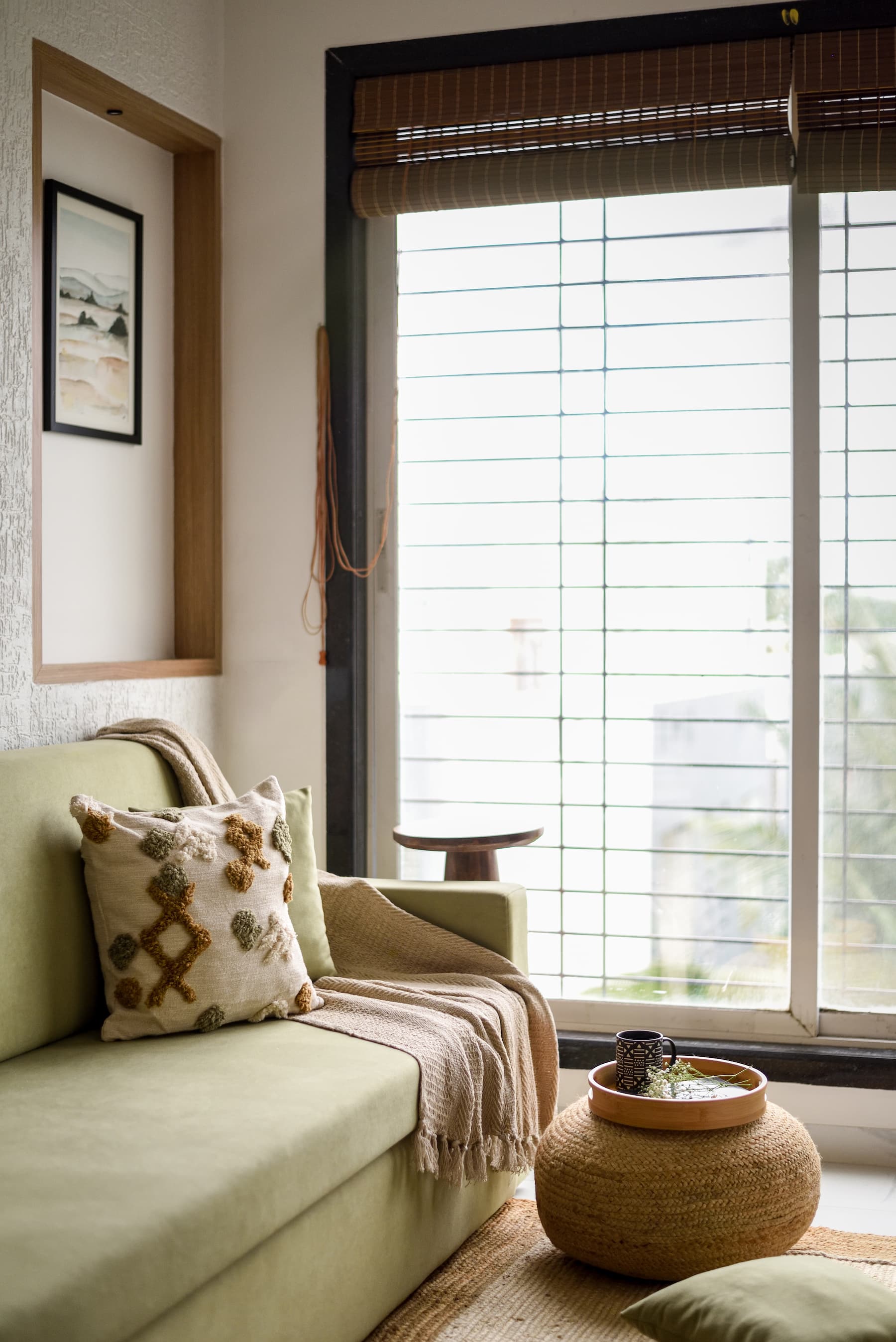 From the outset, D+U Architects approached the challenge of this residence with a keen eye for detail and a deep understanding of the client’s desires. The apartment, surrounded by the imposing mountains of Palghar, initially struggled with limited natural light. The design team’s solution was both strategic and poetic: by removing a common wall between the living room and an adjacent bedroom, they introduced an expansive sense of openness and light. This design intervention not only maximised the flow of natural light but also enhanced spatial continuity, embracing the Japandi ethos of functional simplicity and unobtrusive elegance.