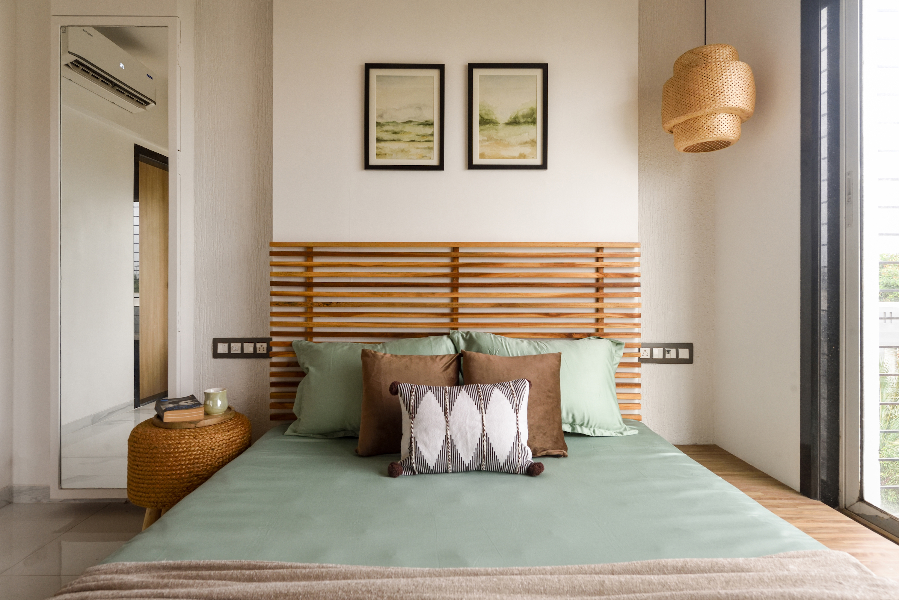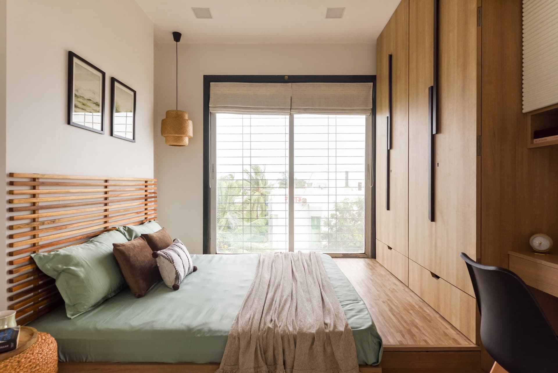 The bedrooms are thoughtfully designed to provide a serene and personalised retreat for each occupant. Embracing the Japandi style’s emphasis on tranquility and understated elegance, each room features a harmonious blend of soft, neutral tones and natural textures. The master bedroom showcases a minimalist aesthetic with a streamlined platform bed and carefully chosen bedding in muted shades, complemented by wooden accents that add warmth and depth. The guest bedroom continues the theme with a refined palette , punctuated by a subtle pop of colour in the bedding to create a welcoming atmosphere.