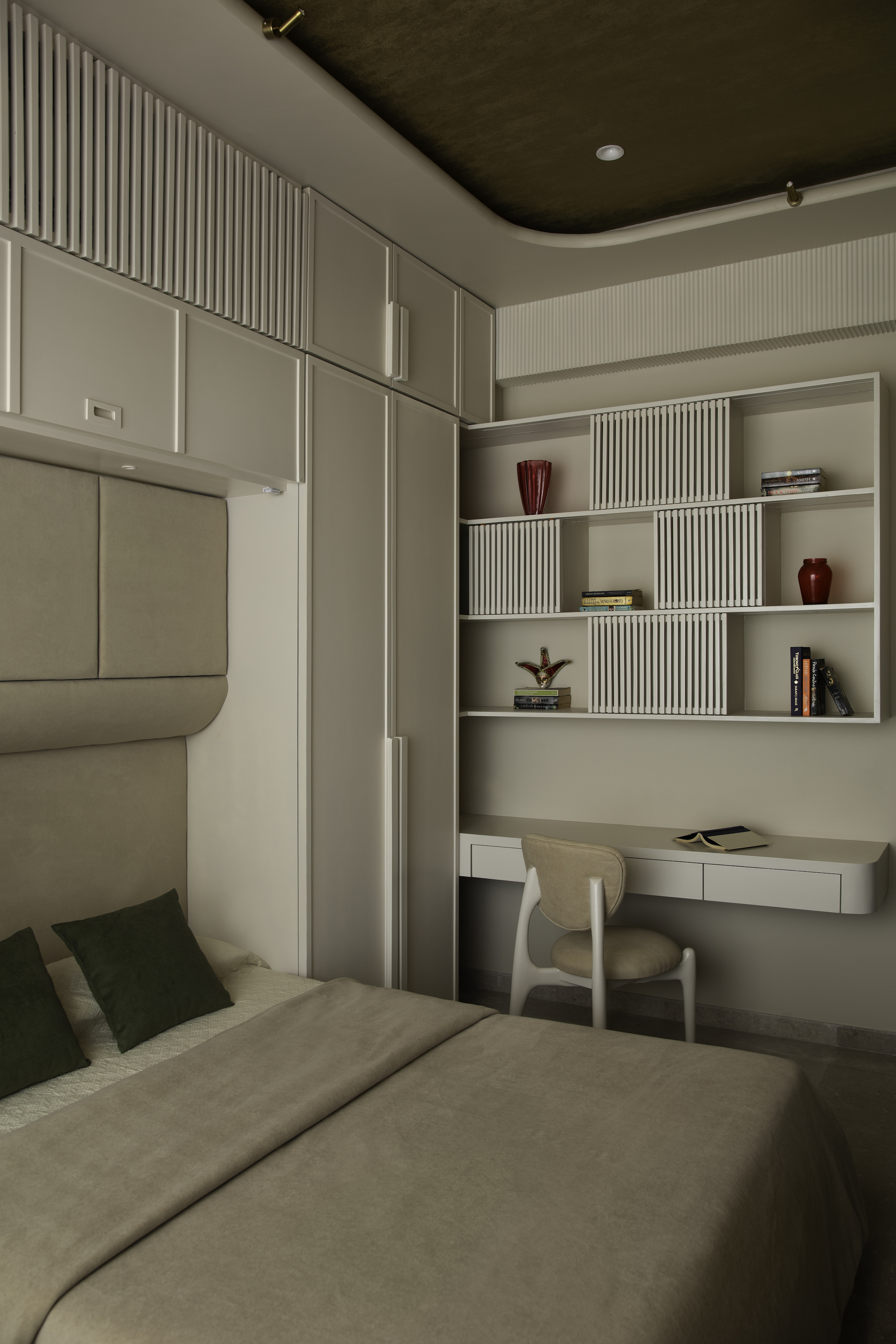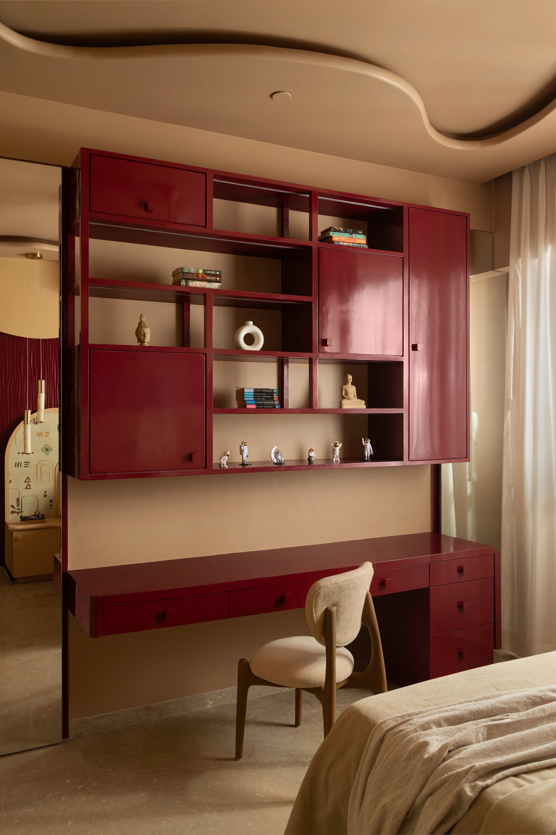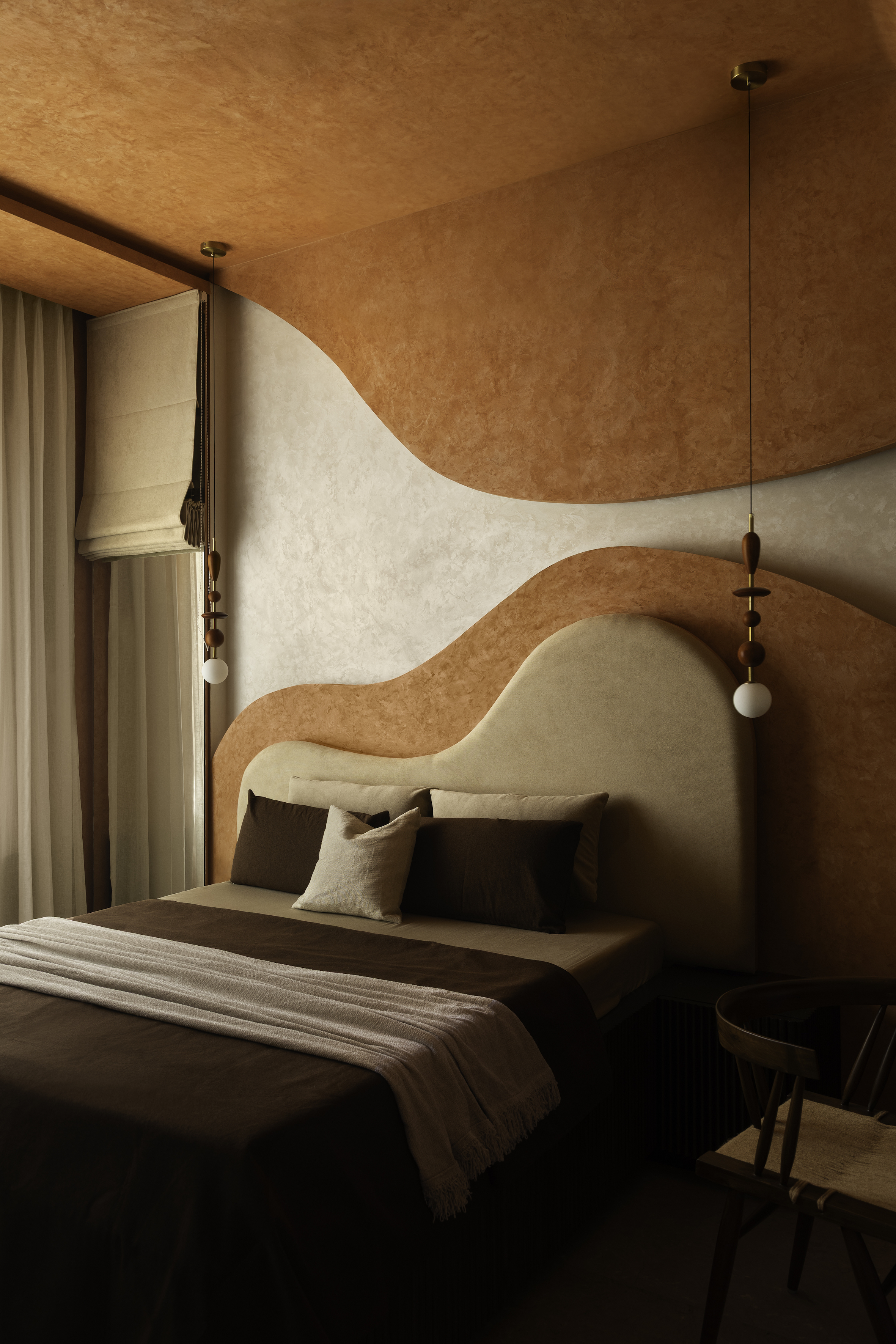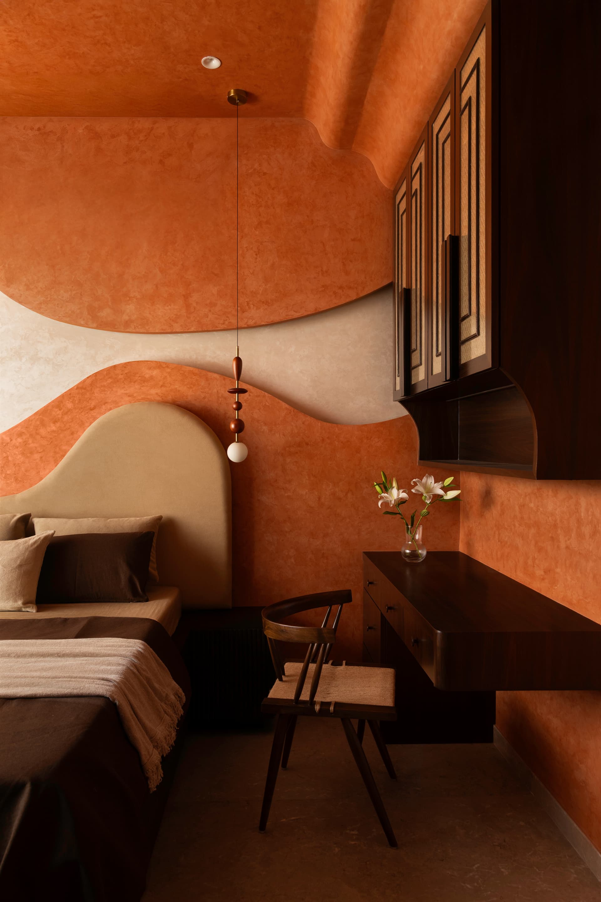 This bedroom carries a bold yet immersive personality through its terracotta drenched envelope. Curved ceiling and wall panels transform the room into a warm, sculptural cocoon. Textured surfaces introduce tactile richness, while dark wood details in the desk and wardrobe bring sophistication and balance. The room reflects a youthful energy without compromising on refinement, combining global influences with a sense of grounded warmth.