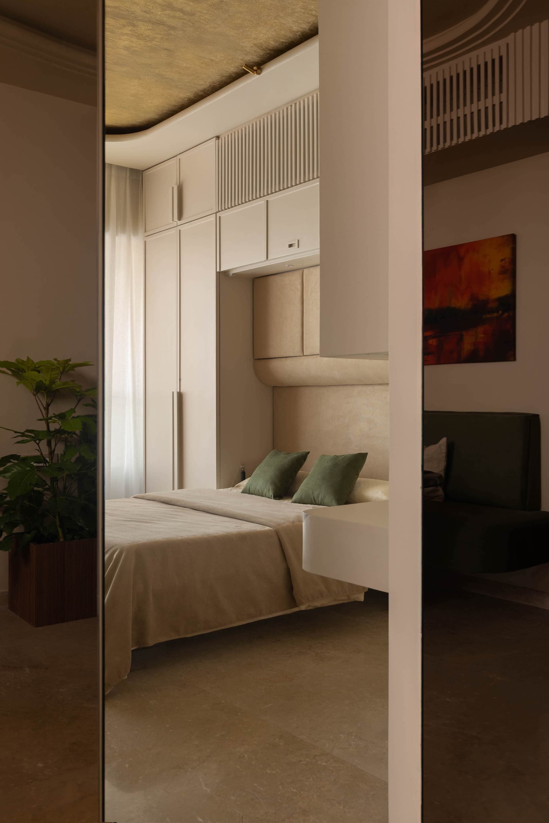 The master bedroom shifts into a calming, cocoon like palette where soft burgundy meets warm neutrals. The custom designed bed, featuring a fluted headboard, offers an immediate sense of repose. Asian print textured wallpaper becomes a key element, adding depth and tactility while maintaining understated elegance. Subtle lighting and gentle contours complete the ambience, creating a restful yet elevated environment designed for long term comfort.