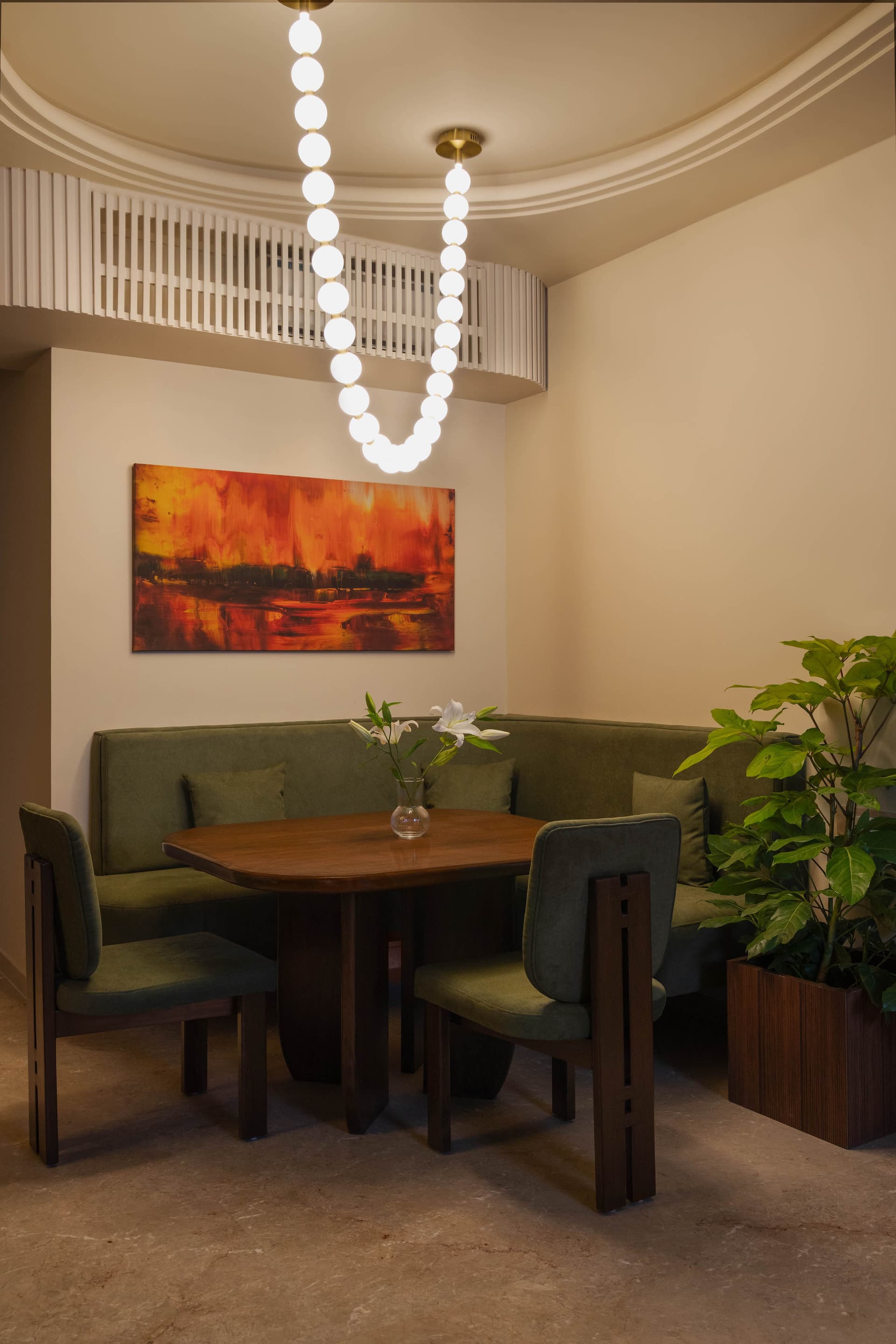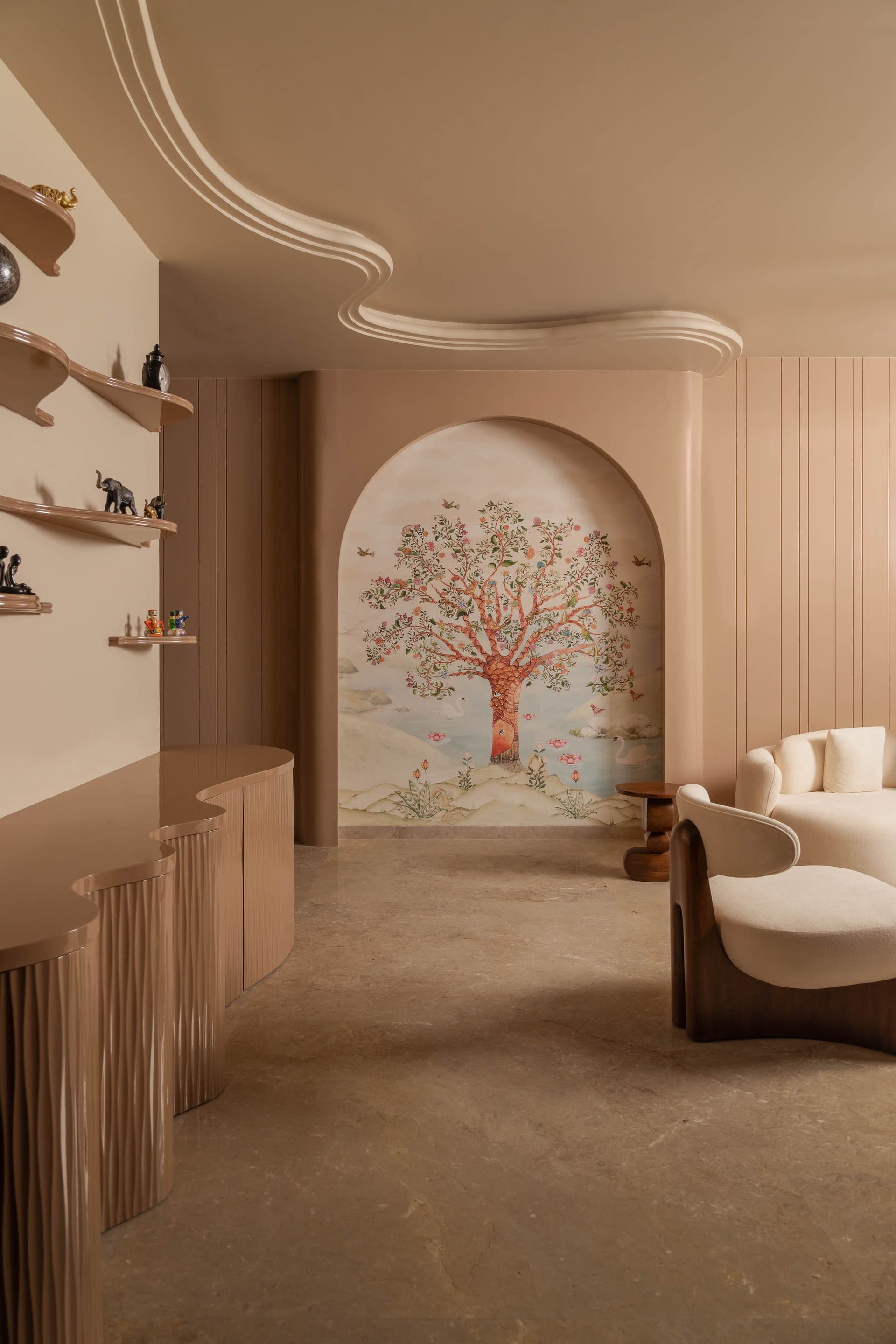 The living room sets the tone for the entire home. A ripple inspired ceiling feature becomes the sculptural highlight of this space, crafted in custom plasterwork that adds rhythm and expansion. Seating is designed to echo this softness, expressed through deep cushions, layered fabrics, and an inviting arrangement that encourages gathering. The 8 foot Tree of Life mural becomes an emotional centrepiece, grounding the room with symbolism and offering a strong narrative anchor.