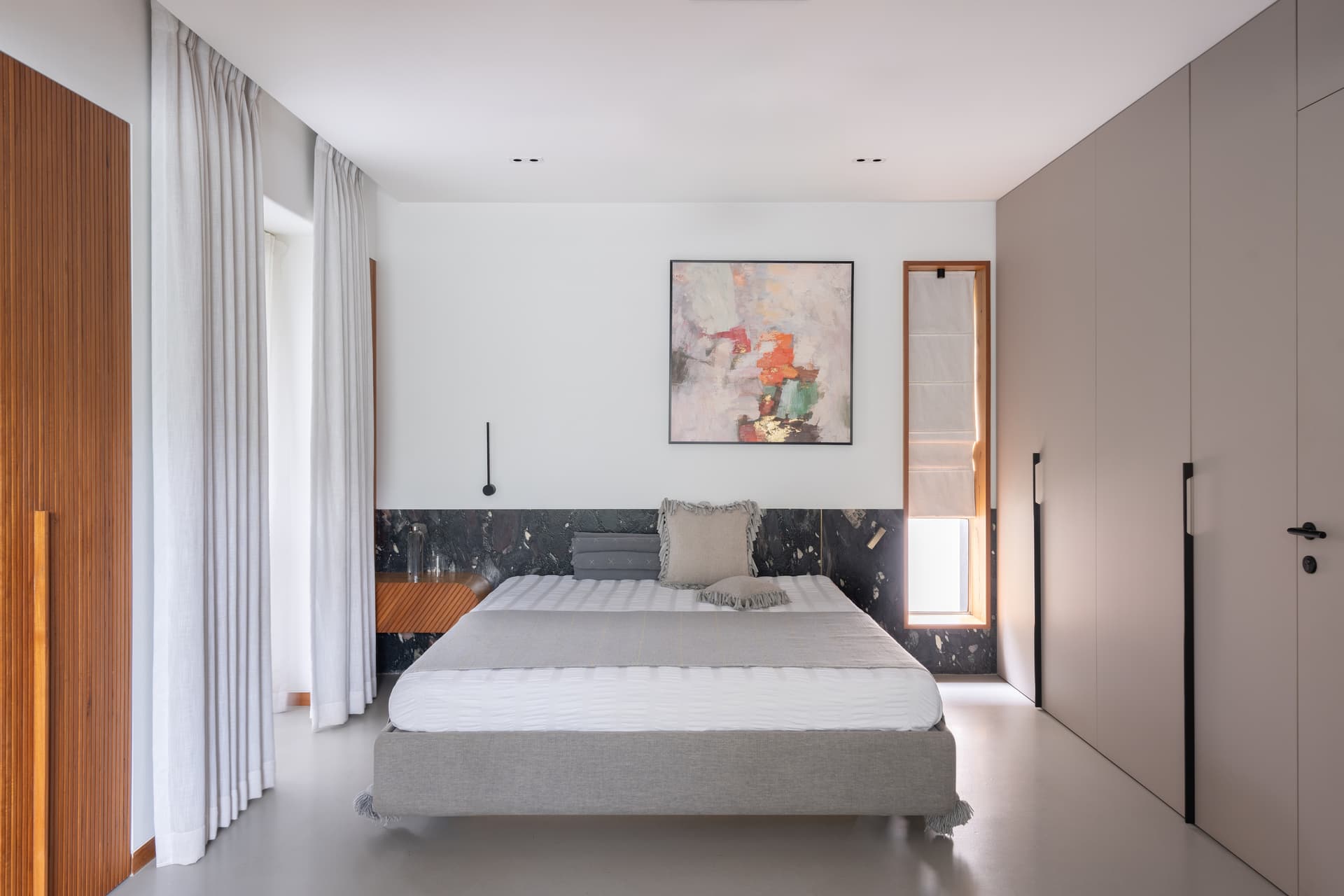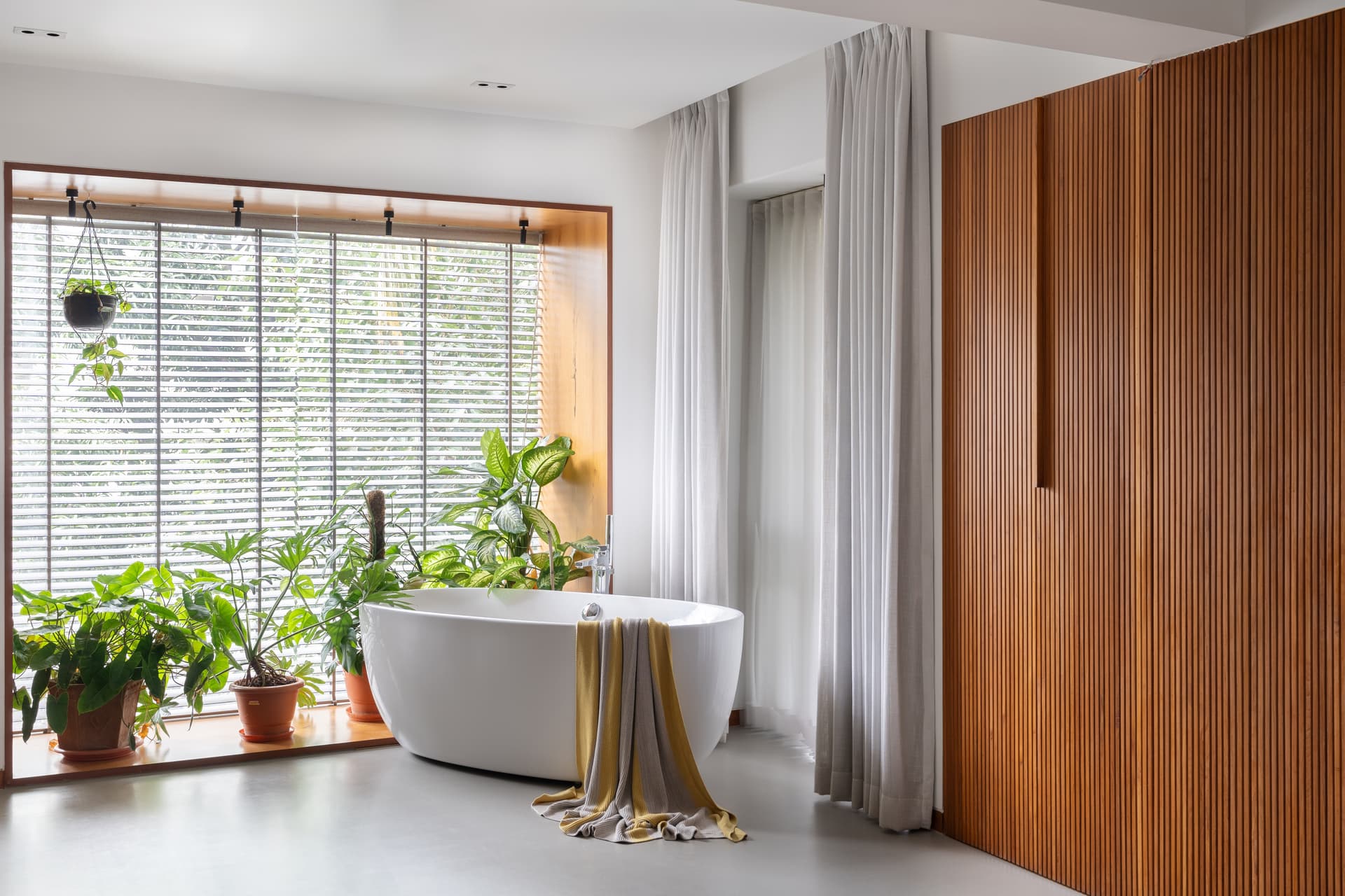 There’s an inherent human warmth to the interiors, not through ornamentation, but through proportion and tactility. Light oak furniture, linen drapes, ceramic decor, and smooth stone counters together form a palette that invites touch, movement, and calm. The open bedroom, with its freestanding bathtub, epitomises this spirit, a private sanctuary that dissolves the line between functionality and indulgence.