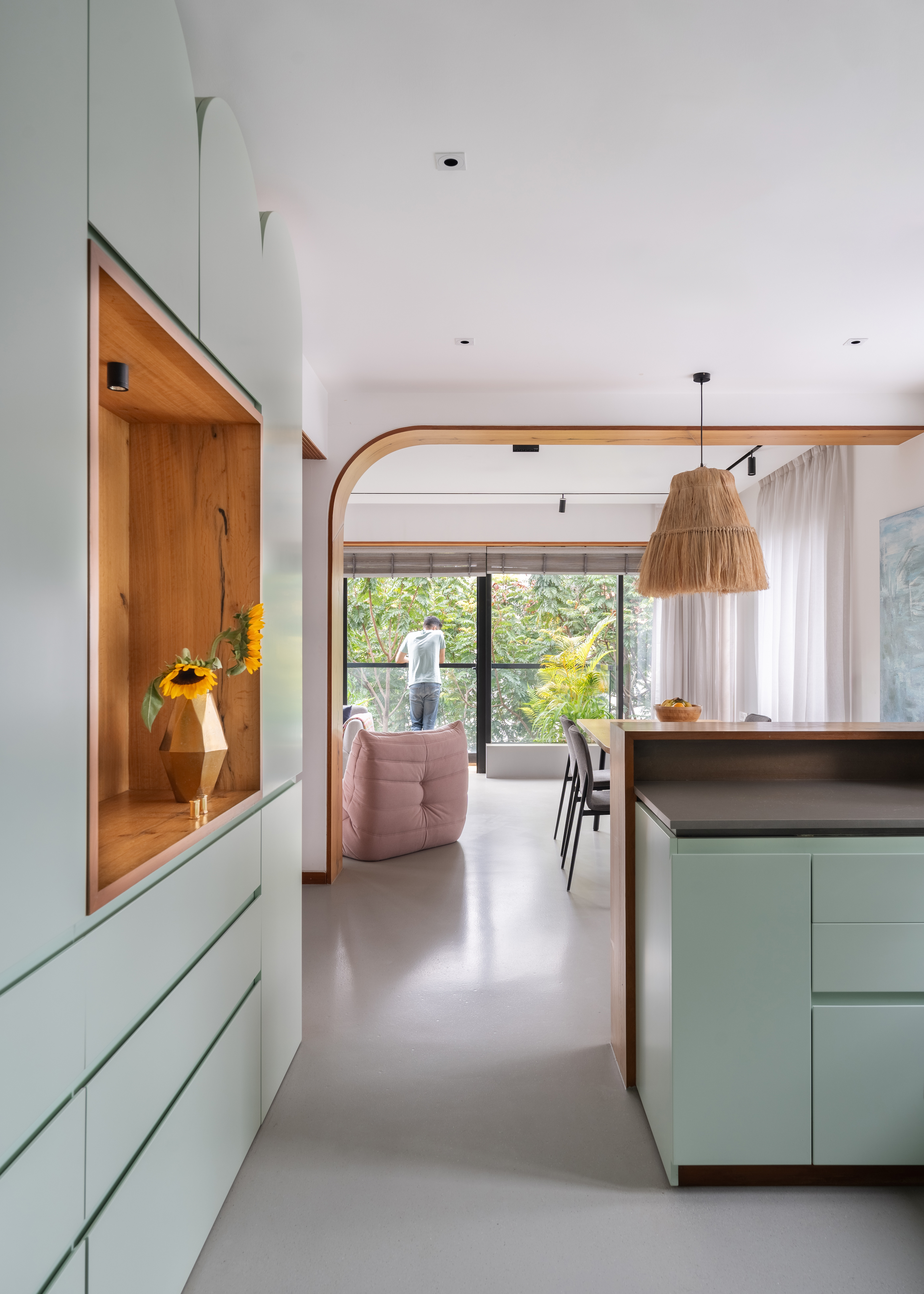 As the original architects of the building, SVAC leveraged a unique opportunity, redesigning the living façade as a full-height glass curtain wall. This bold move floods the interiors with soft, filtered daylight while framing a natural tableau of mature trees that form a green cocoon outside the balcony. It’s a rare luxury in a city apartment, a space that feels connected to nature without compromising privacy.