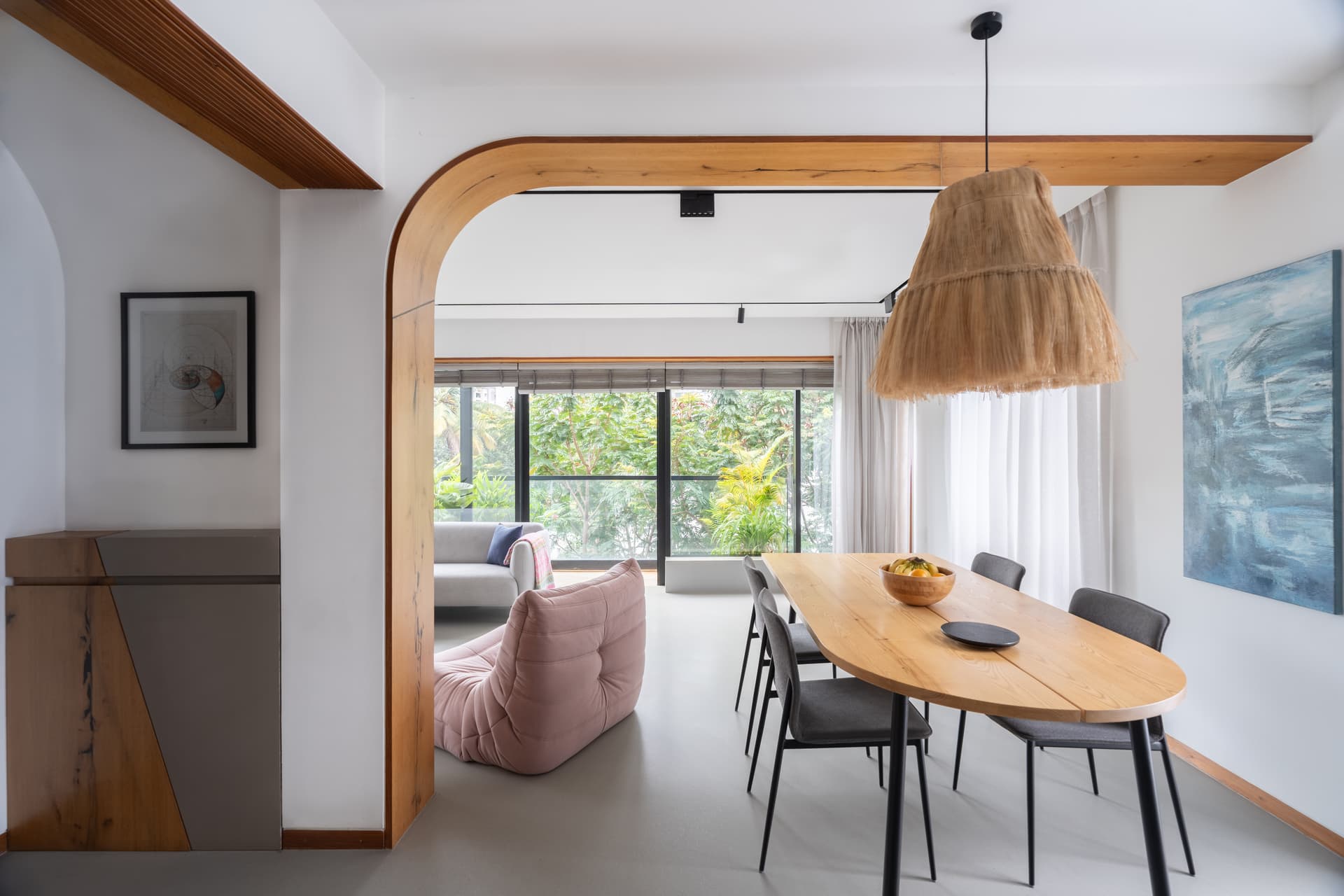 At first glance, BharatKunj is an ode to restraint, pale timber, neutral hues, and refined textures dominate the palette. But look closer, and the quiet rhythm of material layering reveals itself. The micro-topping flooring stretches uninterrupted across rooms, its velvety finish grounding the apartment with a sense of unity and calm. The minimal use of materials is not only aesthetic but psychological, it expands the perception of space, allowing natural light to dance uninterrupted from corner to corner.