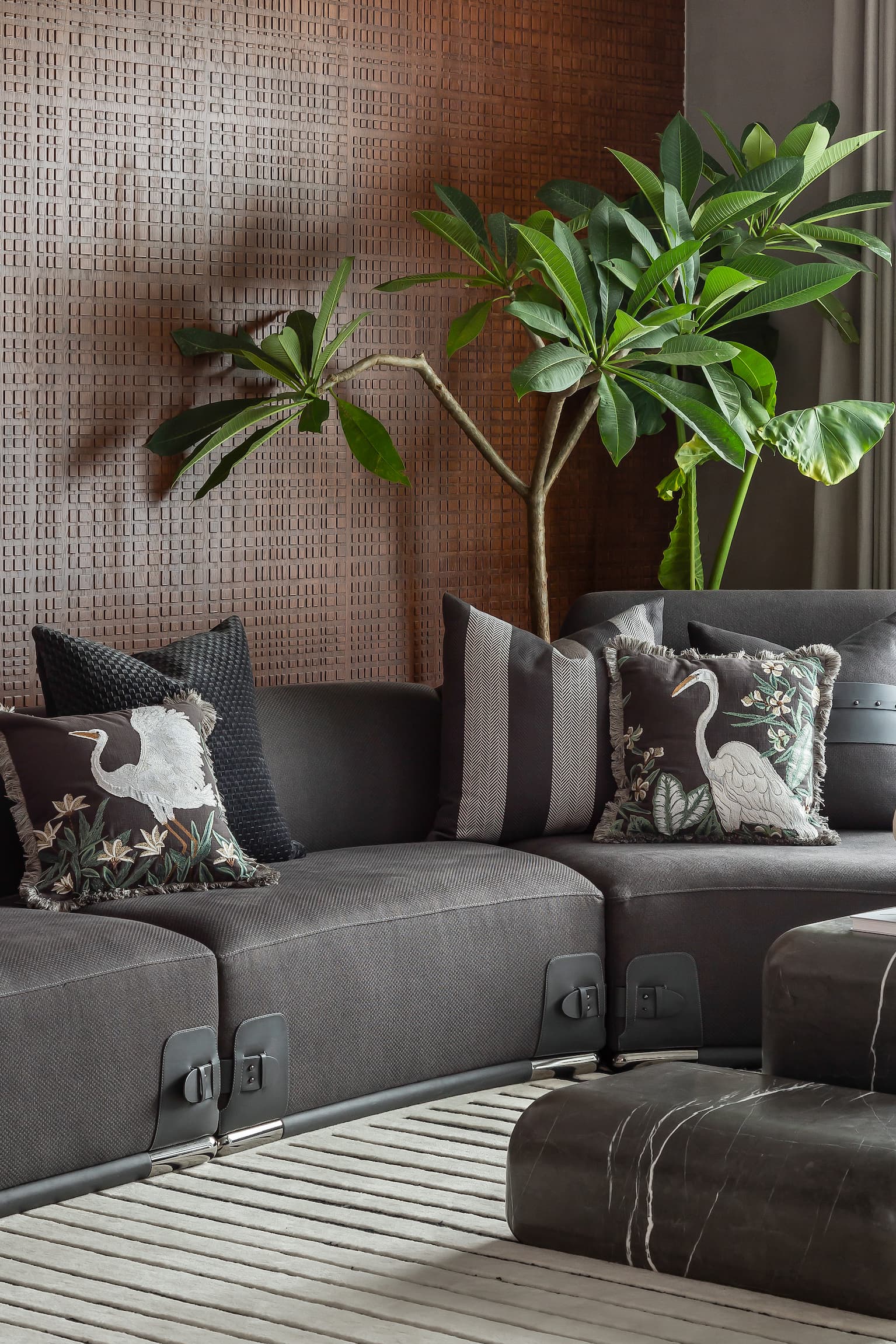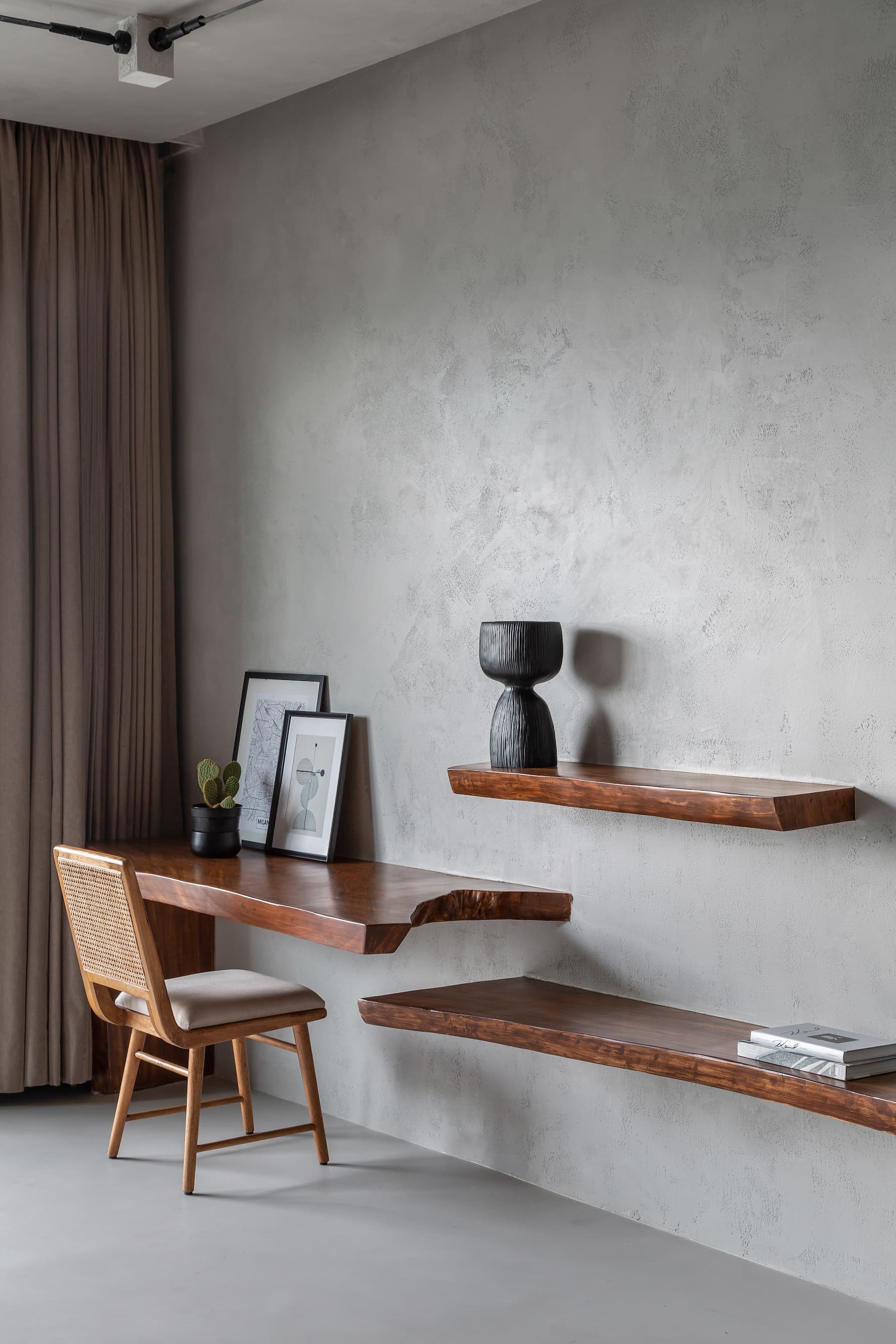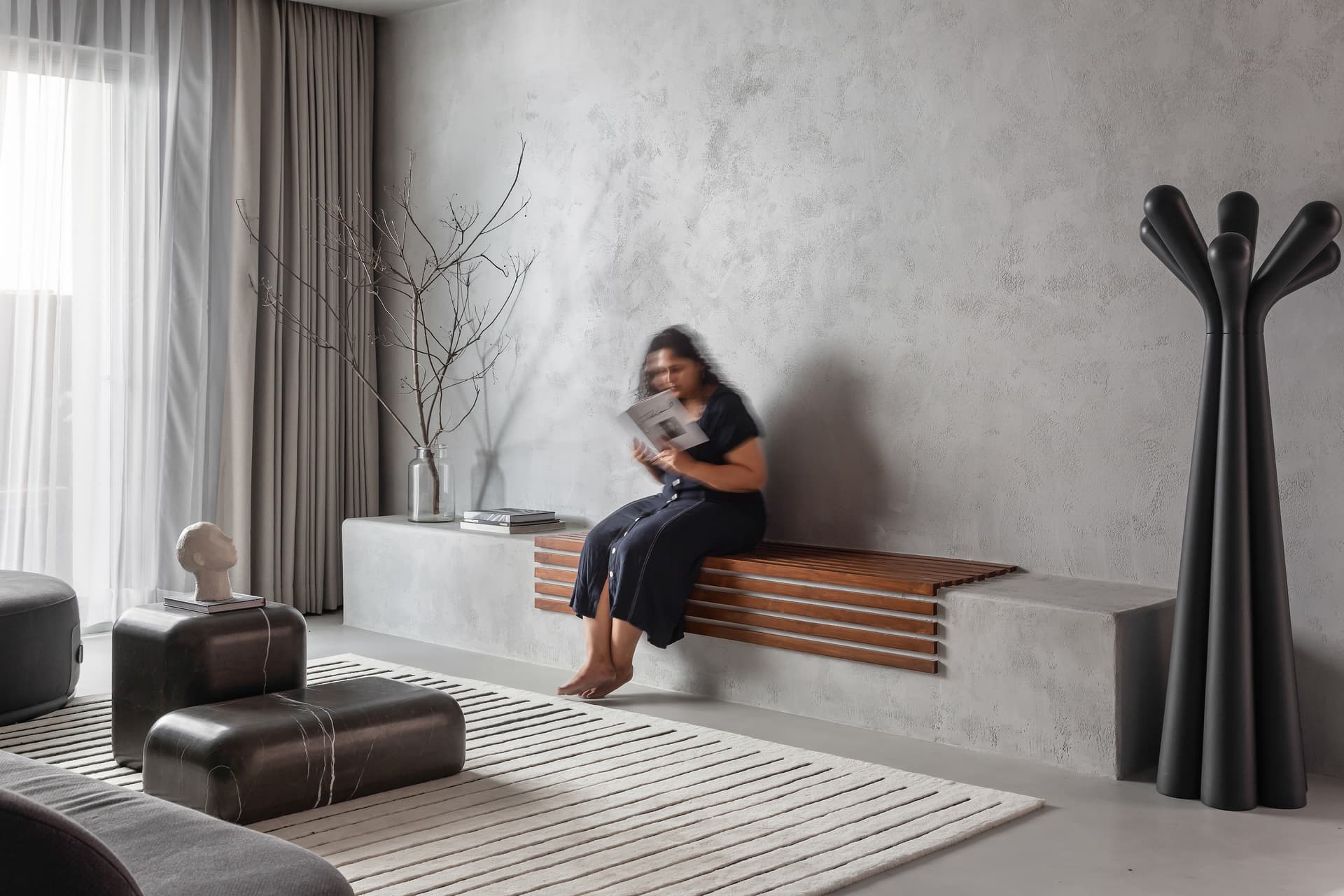 The foyer immediately sets the tone: a clean, monolithic bench—crafted in microtopping—appears to emerge from the wall, blurring boundaries between furniture and architecture. A small, contemplative seating corner with darker tones mirrors the hues of the cladded walls, creating a monochromatic stillness that encourages one to pause and breathe.