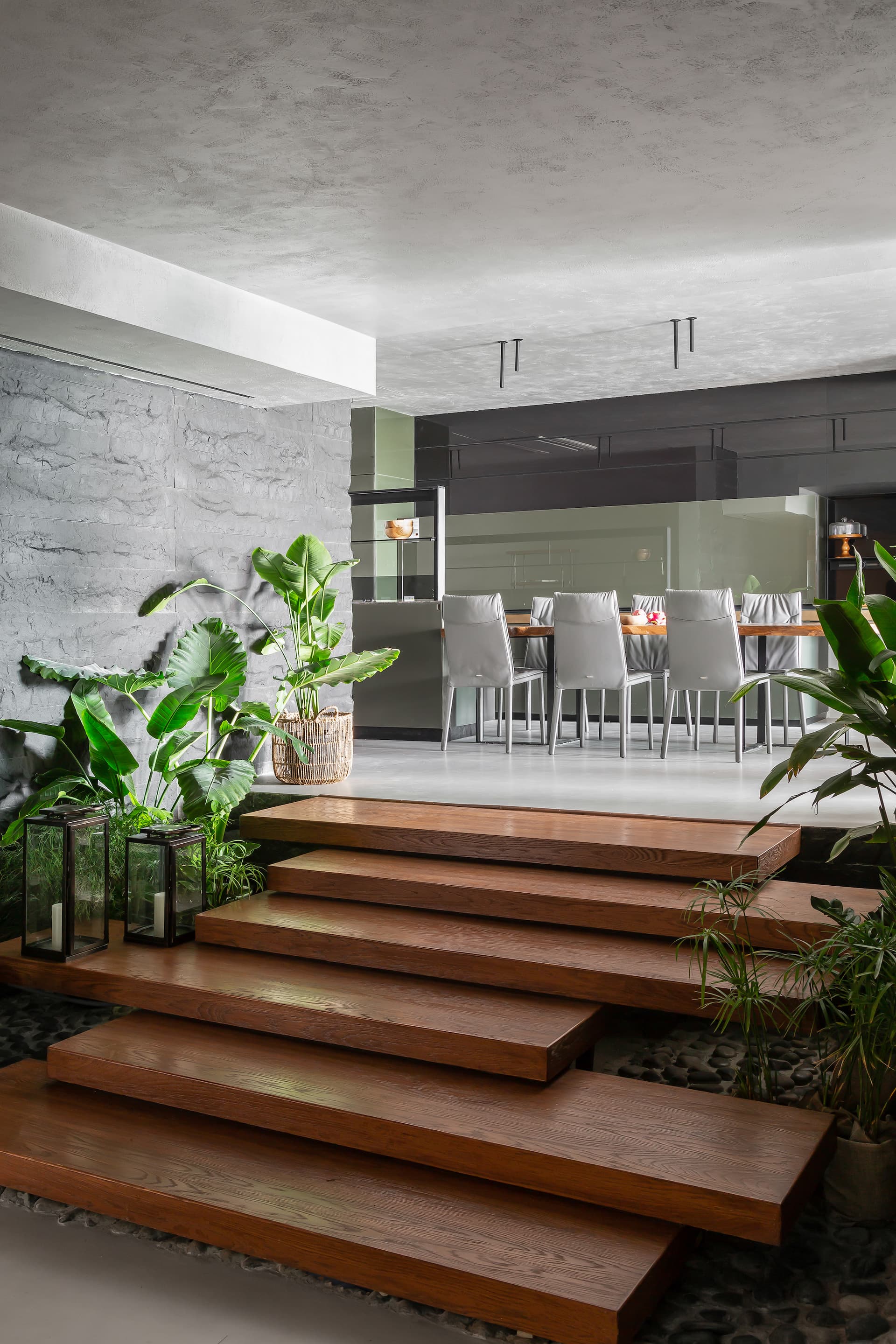 From here, a striking set of staggered wooden steps acts as both circulation and sculpture. Lined with vertical stone cladding and pockets of lush greenery, the stairway feels like a serene passage to another world. The minimal detailing, combined with tactile finishes underfoot, evokes the experience of walking through a contemporary spa retreat—thoughtfully calibrated to slow you down.