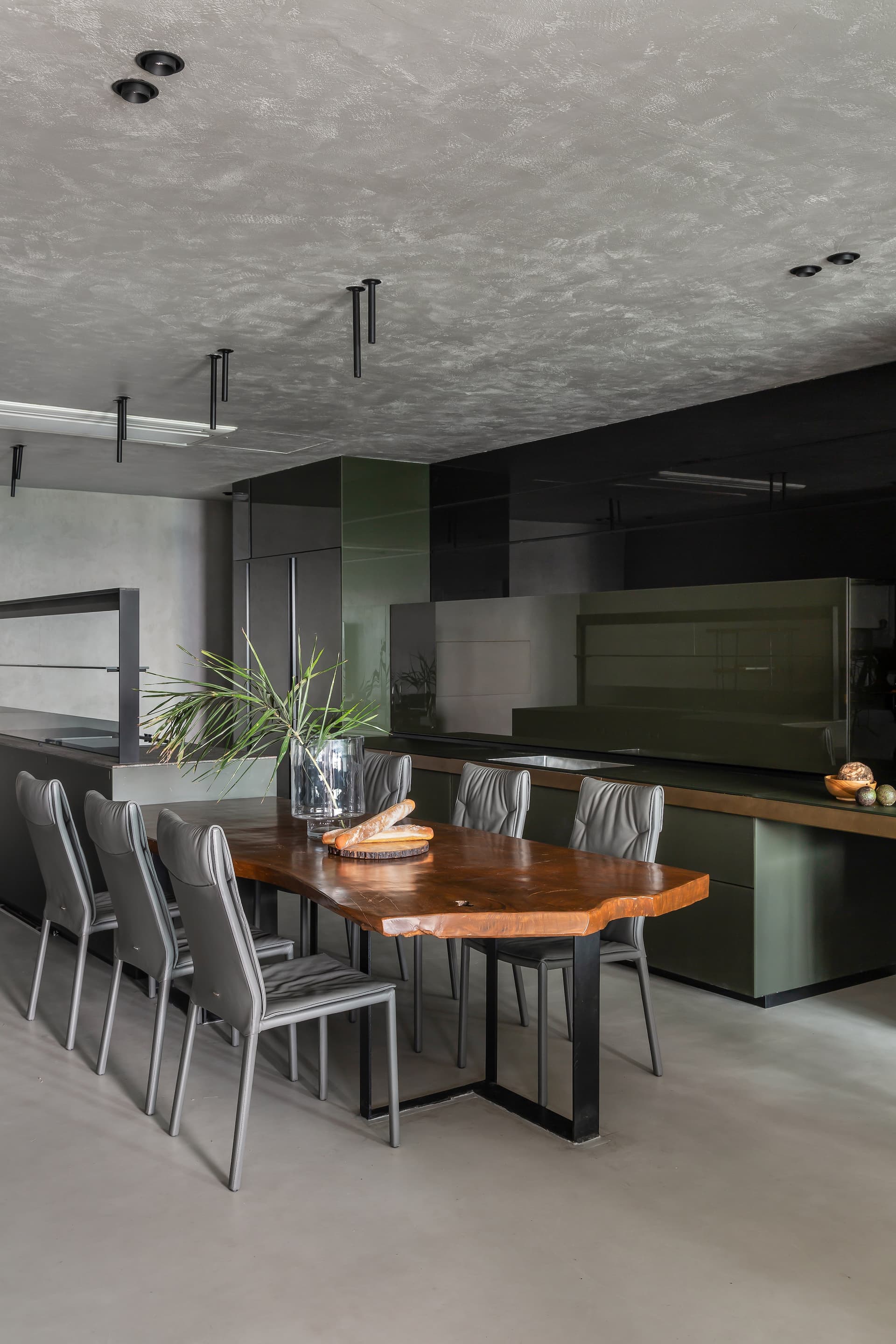 The kitchen is minimal and modern—streamlined cabinetry, sleek countertops, and a quiet efficiency in layout. The dining area is anchored by an organically shaped wooden table, handcrafted from the same tree used across the home, and paired with understated seating that emphasizes flow over formality.