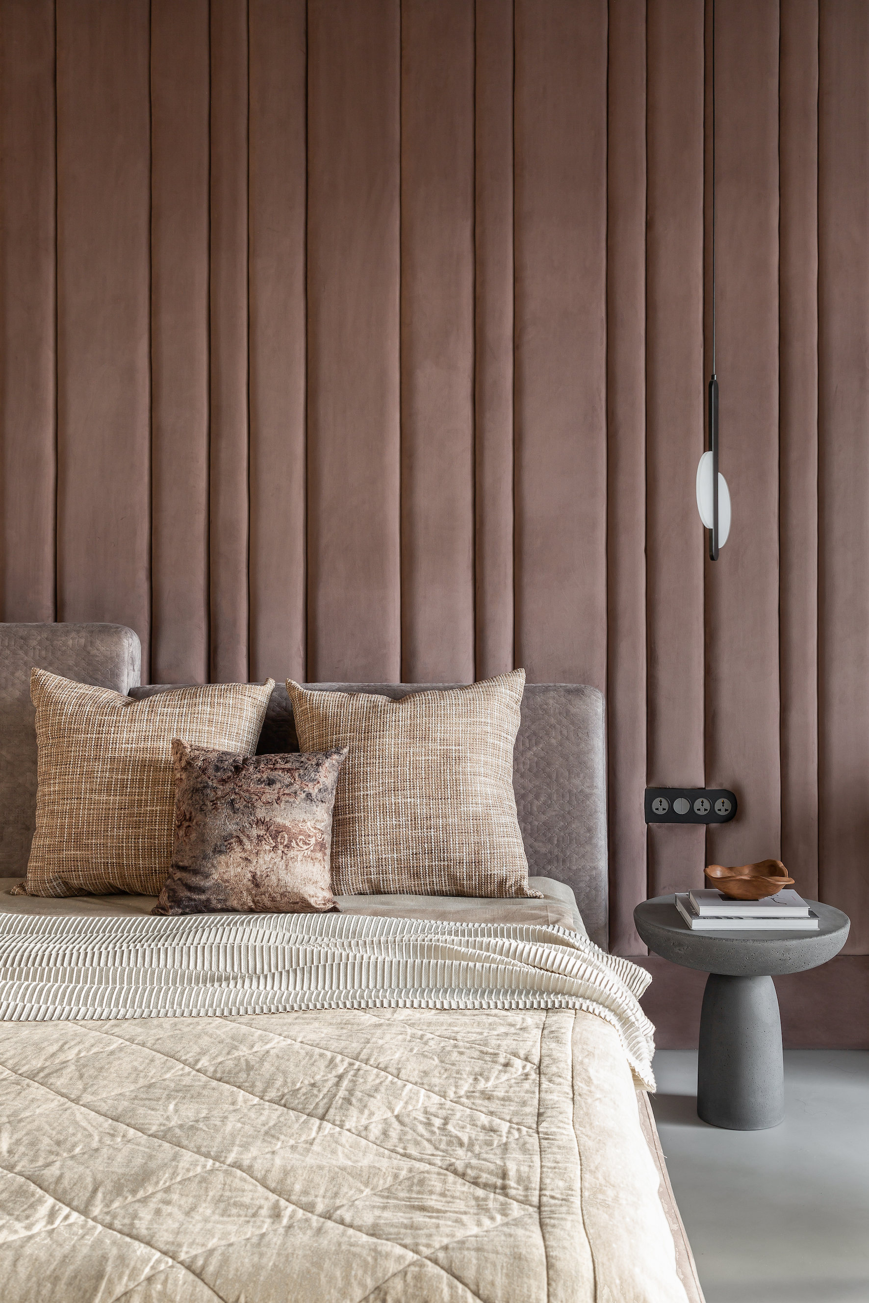 At the core of the design philosophy lies the use of a singular material—microtopping—a seamless cementitious surface that wraps the floors, ceilings, and walls in a soft, tactile grey. This continuity eliminates visual clutter, allowing the architecture to recede and the material palette to speak. The textured neutrality of the microtopping is not stark, but rather soothing—a canvas onto which light, shadow, and natural finishes are layered to evoke mood and depth.
