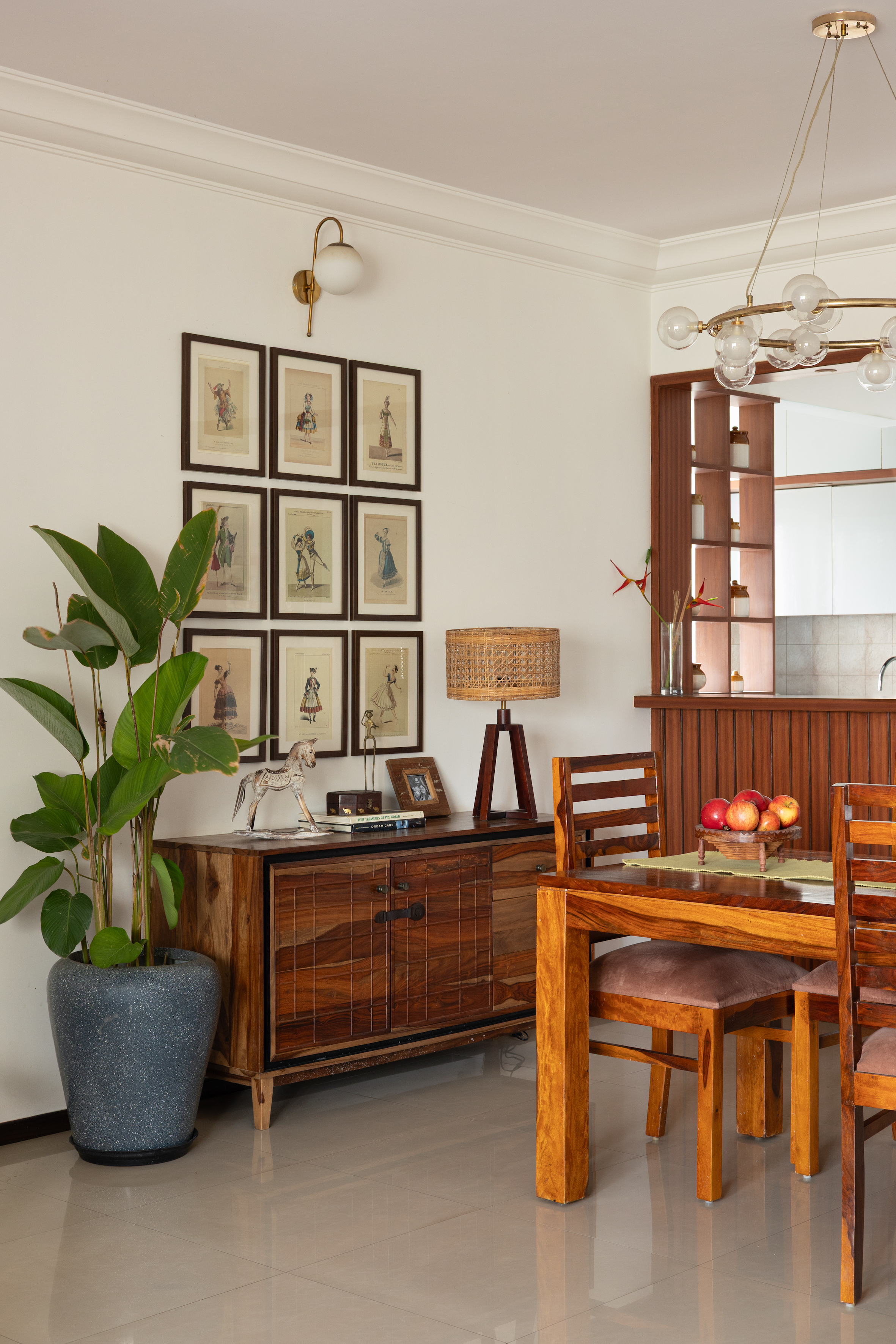 Moving into the dining zone, the dialogue between tradition and contemporary living becomes more pronounced. Minimal wooden furniture is paired with a modern light fixture that defines the space without dominating it, allowing the dining area to function as both a social anchor and a visual pause within the home. This language flows seamlessly into the kitchen, where tonal continuity, efficient planning, and streamlined cabinetry reflect Studio Aelux’s commitment to functional clarity. A distinctive partition featuring pickle jars of varying sizes introduces a tactile, cultural layer, serving as both a spatial divider and a moment of quiet storytelling that connects everyday rituals with design expression.