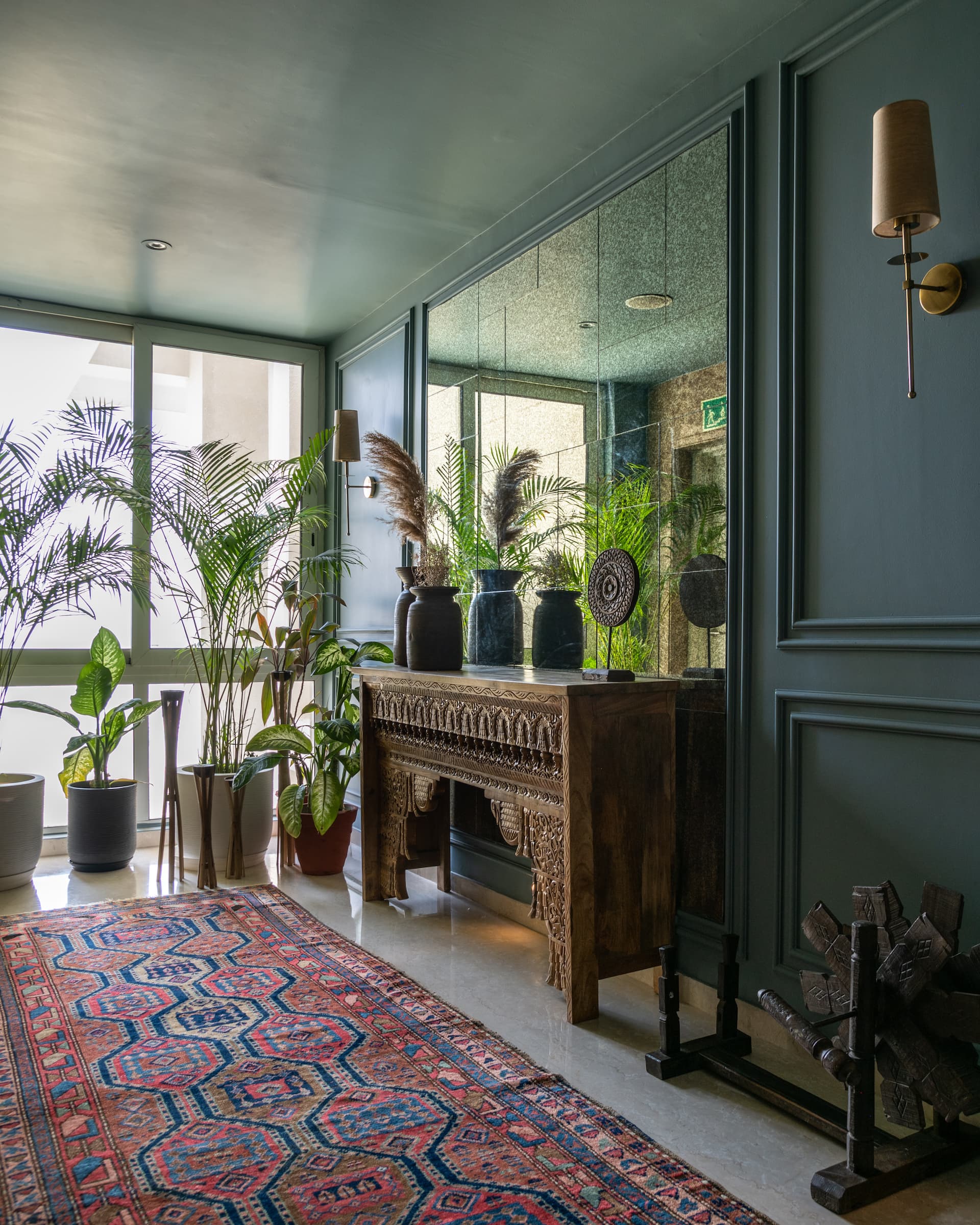 Upon entering the lovely home, one is greeted by an aged, intricately carved wooden console set against a dramatic deep grey panelled wall, complemented by antique mirrors. Abundant greenery positioned by the window, thoughtfully arranged in collaboration with IAAH, serves to enhance the ambiance and set the tone for the residence.