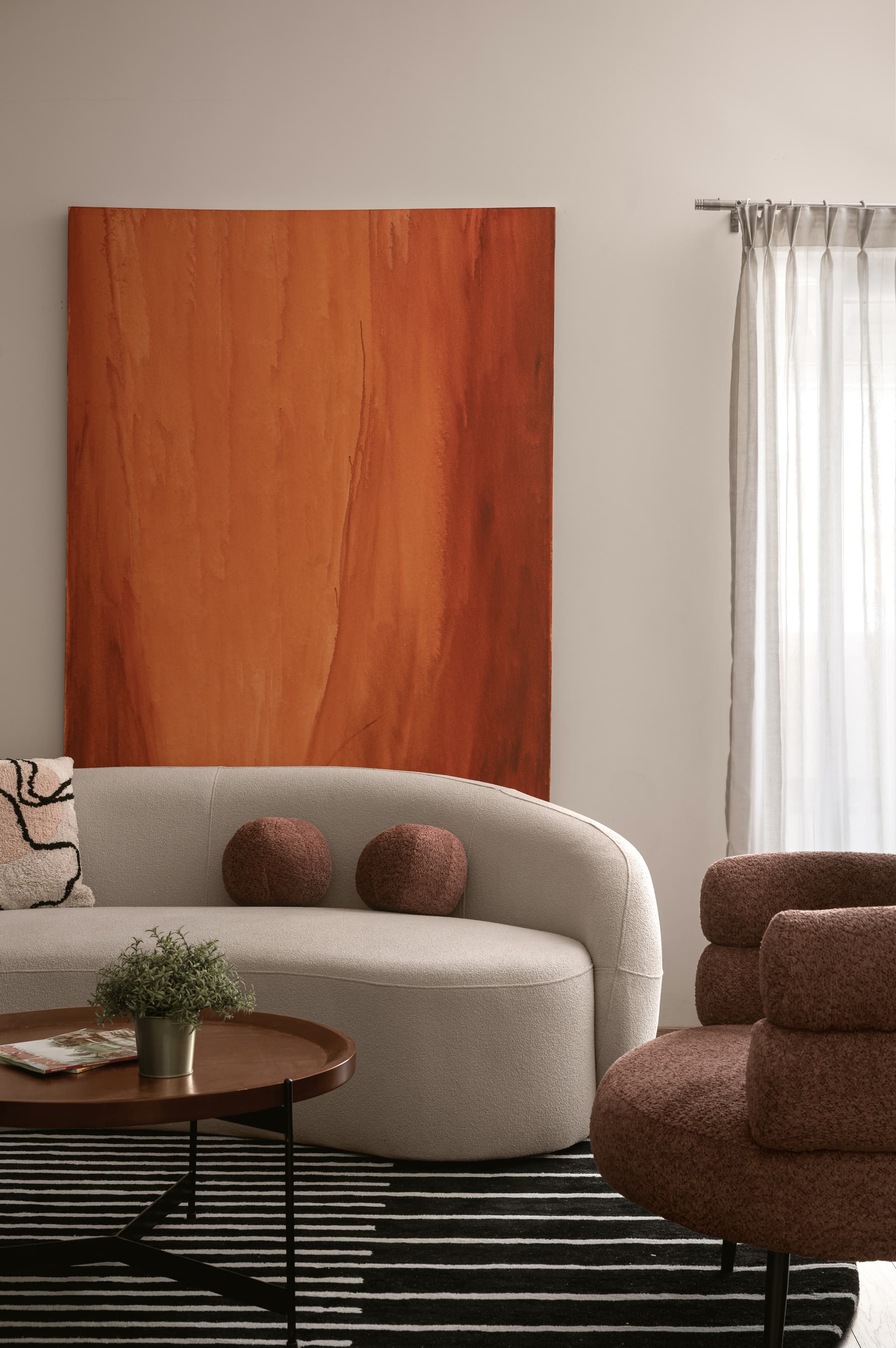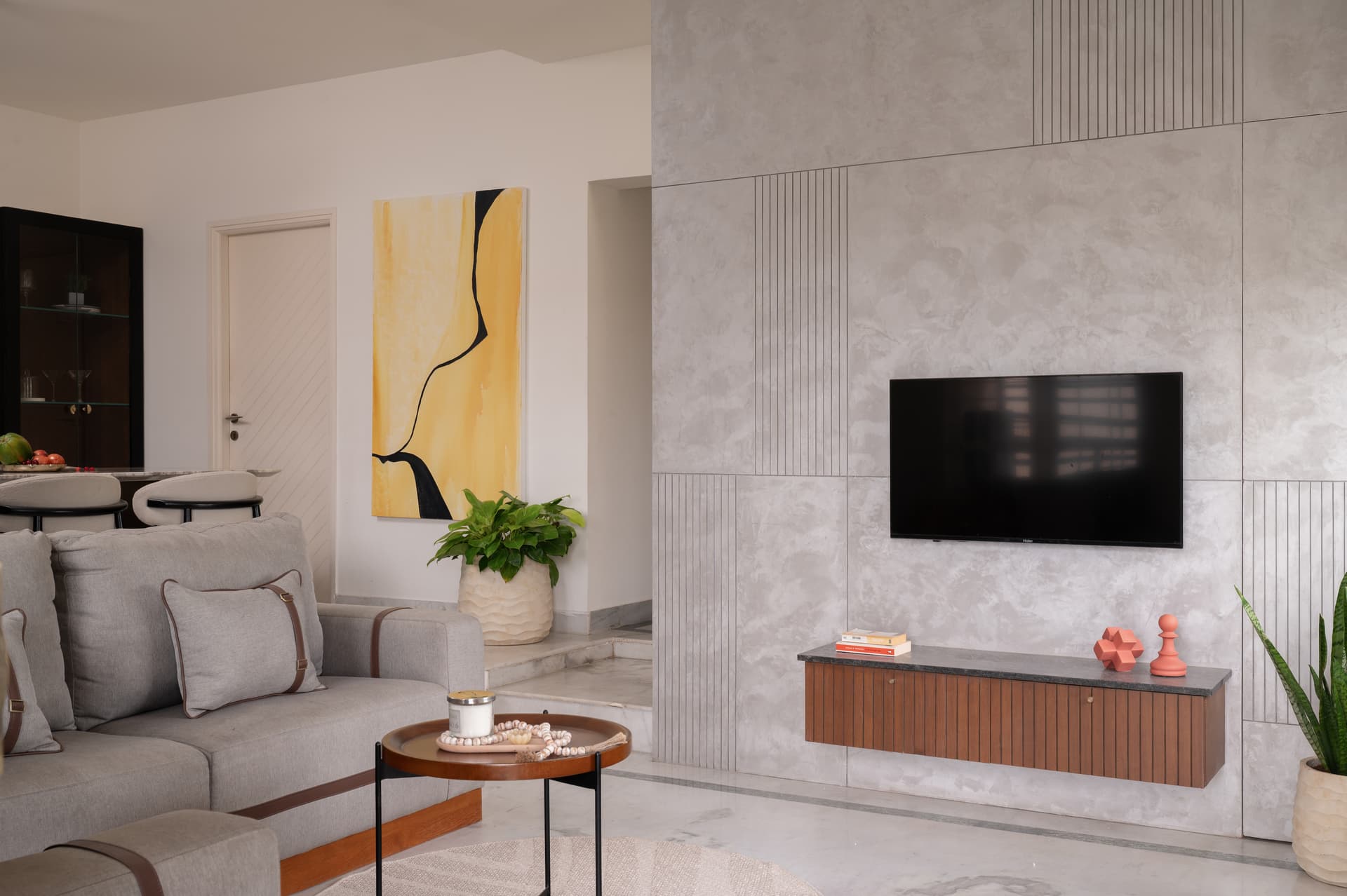 The upper level houses a second living area, designed for both solitude and social gatherings. Soft forms, muted tones and tactile materials make this space feel adaptable. A curved TV unit encourages shared experiences, while a cleverly concealed study nook, with a teak totem-inspired desk, provides storage and focus for the couple’s work-from-home routines. A semi-circular sofa and lounge chair anchor the space, with pops of colour coming through vibrant art, round cushions and potted plants.