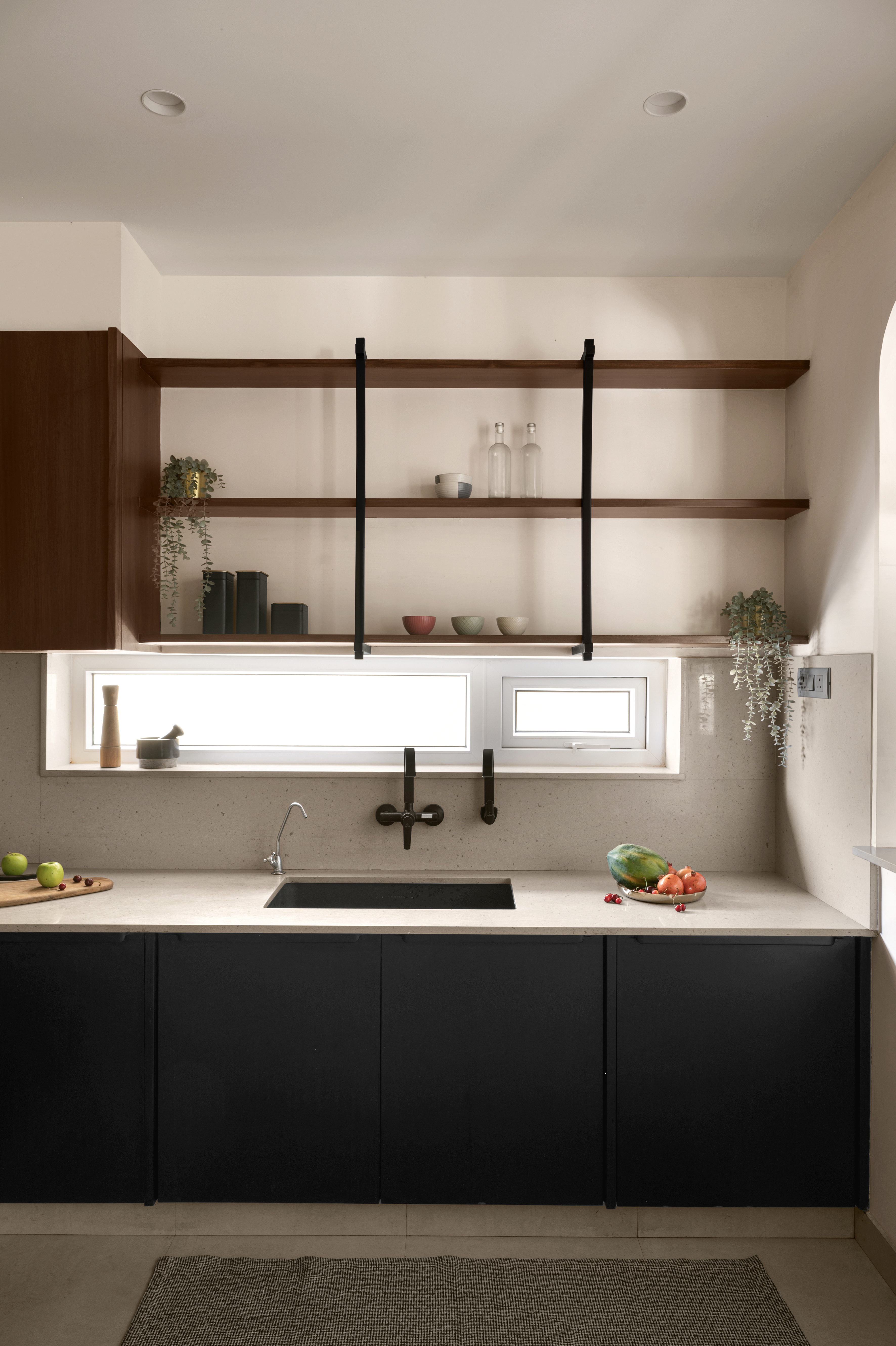 At the core of the ground floor is an open-plan layout connecting the living, dining and kitchen. Indian marble flooring and white walls establish a serene backdrop, while custom oakwood furniture, grey upholstery, and lush greenery add warmth and character. The kitchen, compact but deliberate in its expression, features handleless cabinets, dark oak shutters, and bespoke shelving, grounded by a pale quartz worktop. A softly arched entry marks the transition between the kitchen and living space, offering visual flow and a gentle threshold.