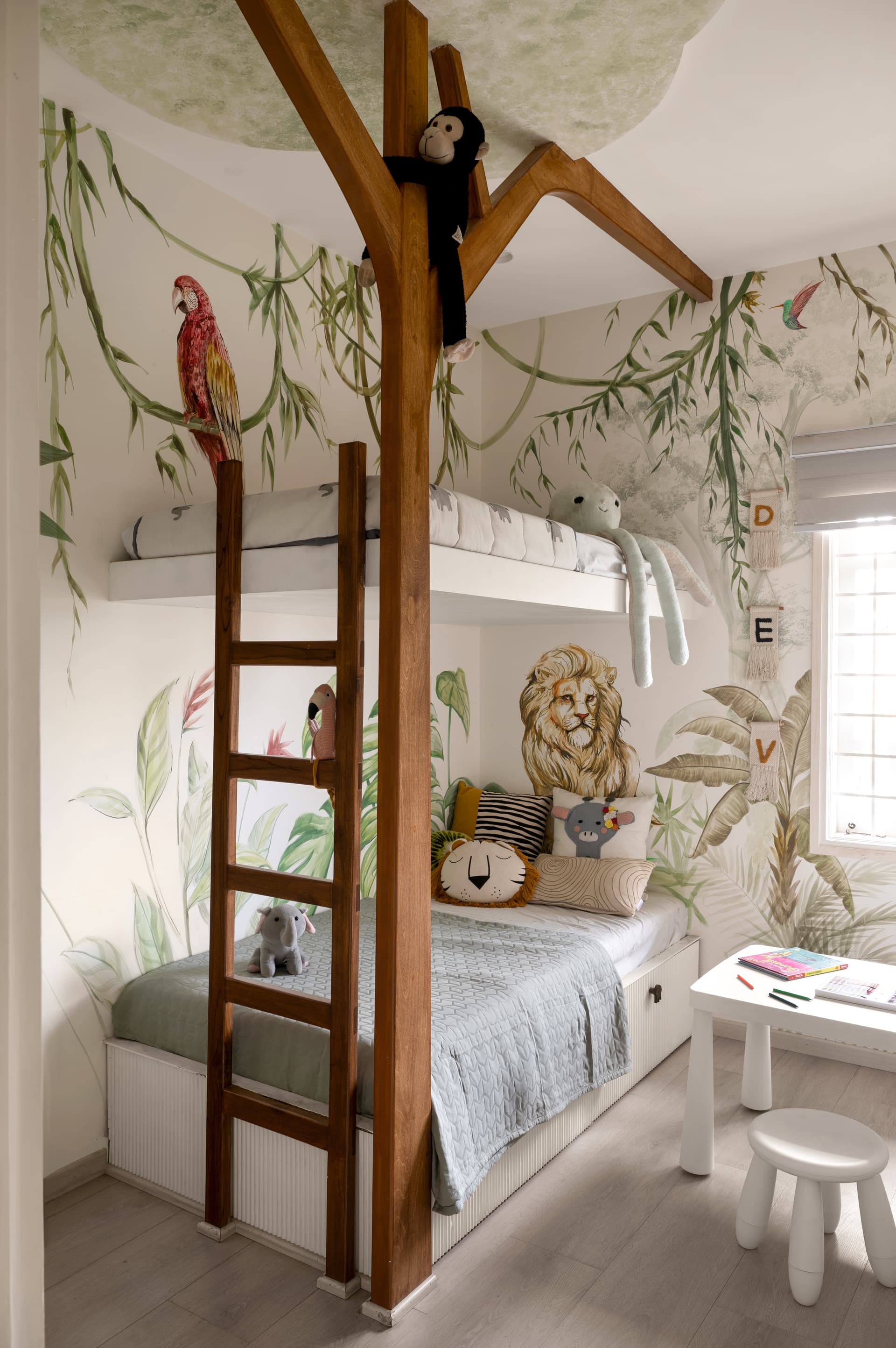 One of the most delightful contrasts appears in the child’s bedroom. Here, the design departs from the home’s quieter tones, embracing a jungle-inspired theme that reflects the young occupant’s love for animals. A tree trunk-shaped wooden bunk bed, whimsical forest murals, and olive green accents create a space that is imaginative yet grounded. Curved shutters and rounded wardrobe edges ensure safety, while playful animal knobs and a low, open shelf encourage independence. Lion-shaped pillows and animal print bedding add a cosy layer of storytelling to a space made for wonder.
