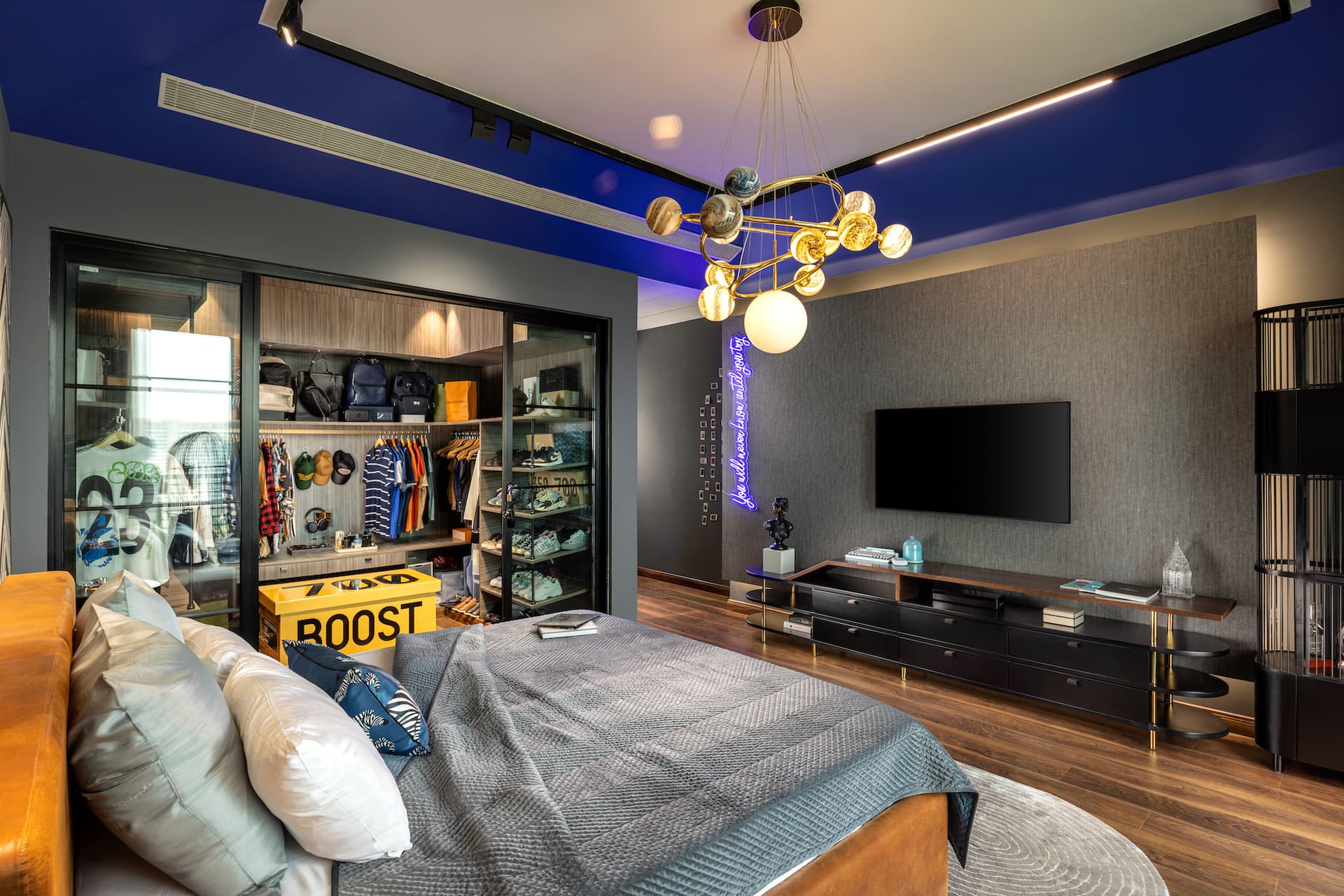 The master bedroom brings the trajectory of the blue back with its furnishings. The inspiration from Madhubani paintings veils the curtains. Plush leather tufted beige headboard set against monochrome veneer panelling with metal profiles is another constant that runs through the home.