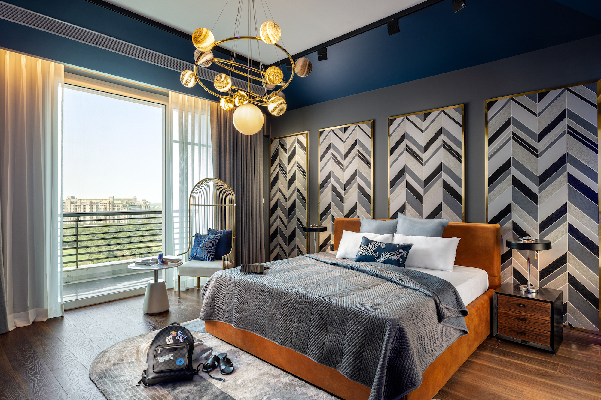 The use of orange continues in the third room through the bed along with prevailing patterns and hues. Cage chair offers a vantage viewpoint over the golf course. When it comes to luxury, the bathroom interior designs are a step ahead. Black and white geometric patterns transform into a base for two of them, while the third has a floor to ceiling glass wall etched with a digitally printed leaf design that fashions for a distinctive feature wall. The luster of loft chandeliers commands attention.