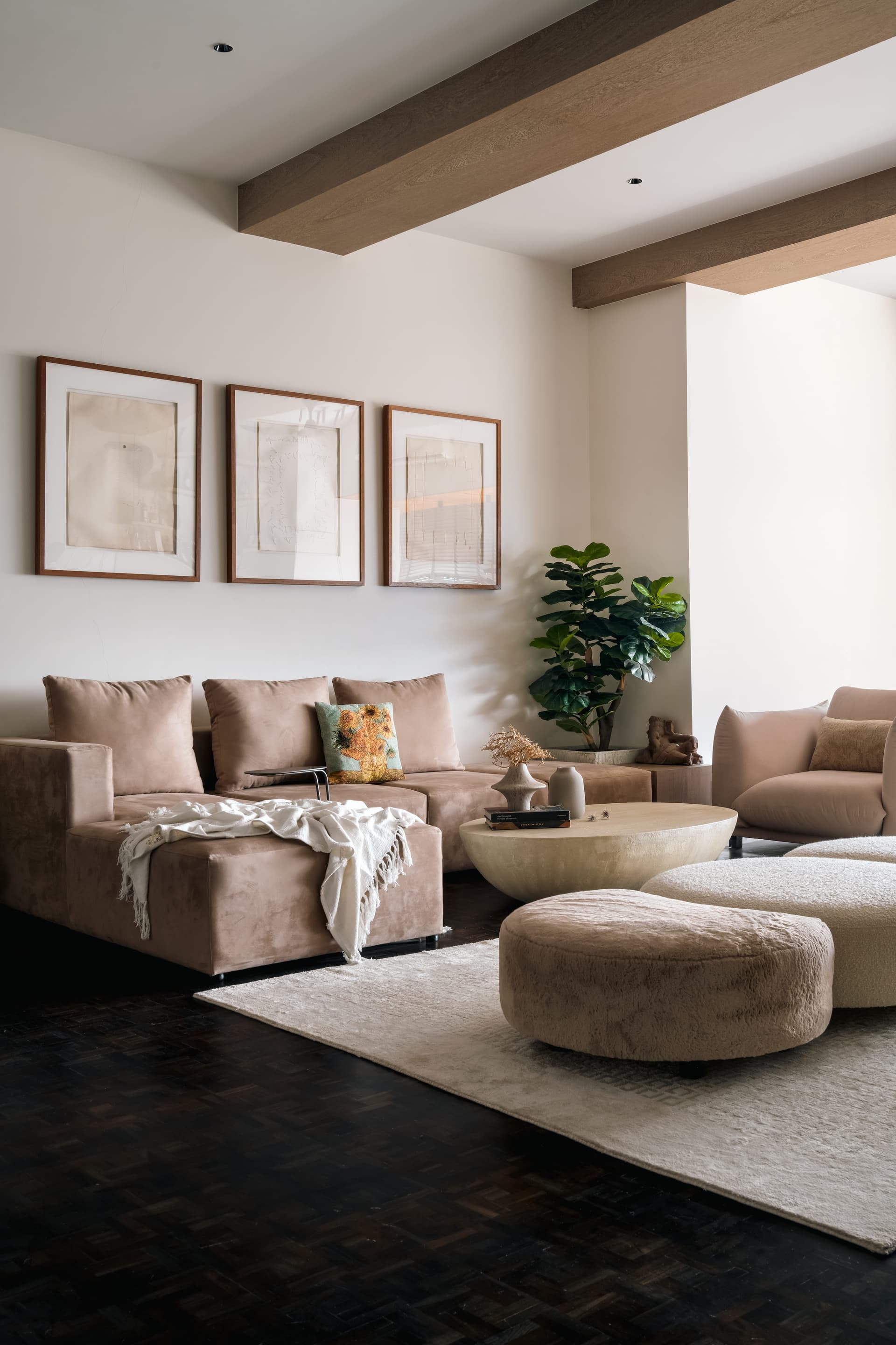 Accentuating this textural dialogue are the black metal details—in the form of hardware, sliding window frames, and select fixtures—which serve as subtle anchors within the light-filled expanse. These graphic elements provide definition without disrupting the overarching softness of the space. In contrast, distressed wooden beams, salvaged and repurposed, punctuate the ceiling—a gentle nod to the building’s original structural character, seamlessly blending the old with the new.