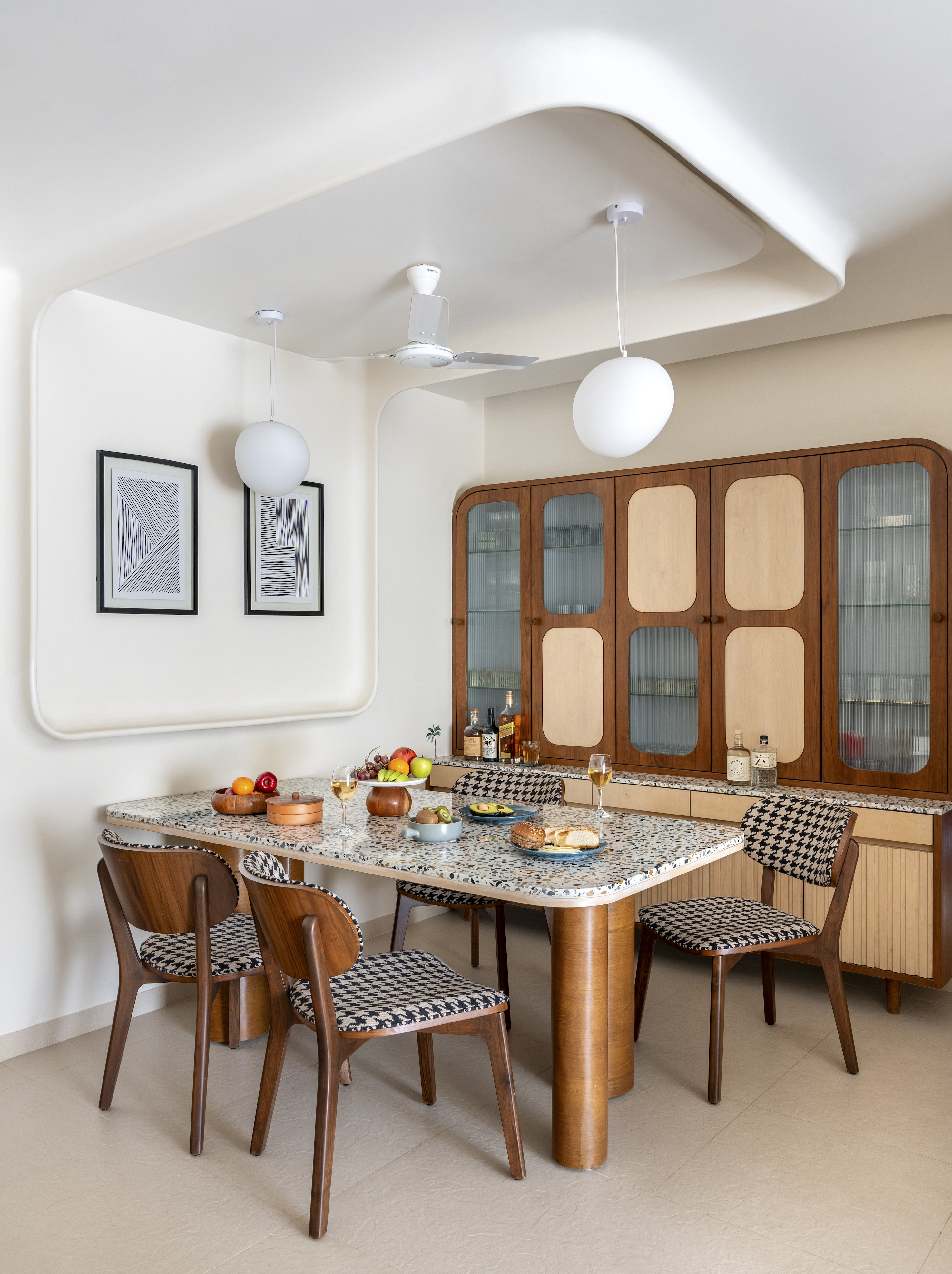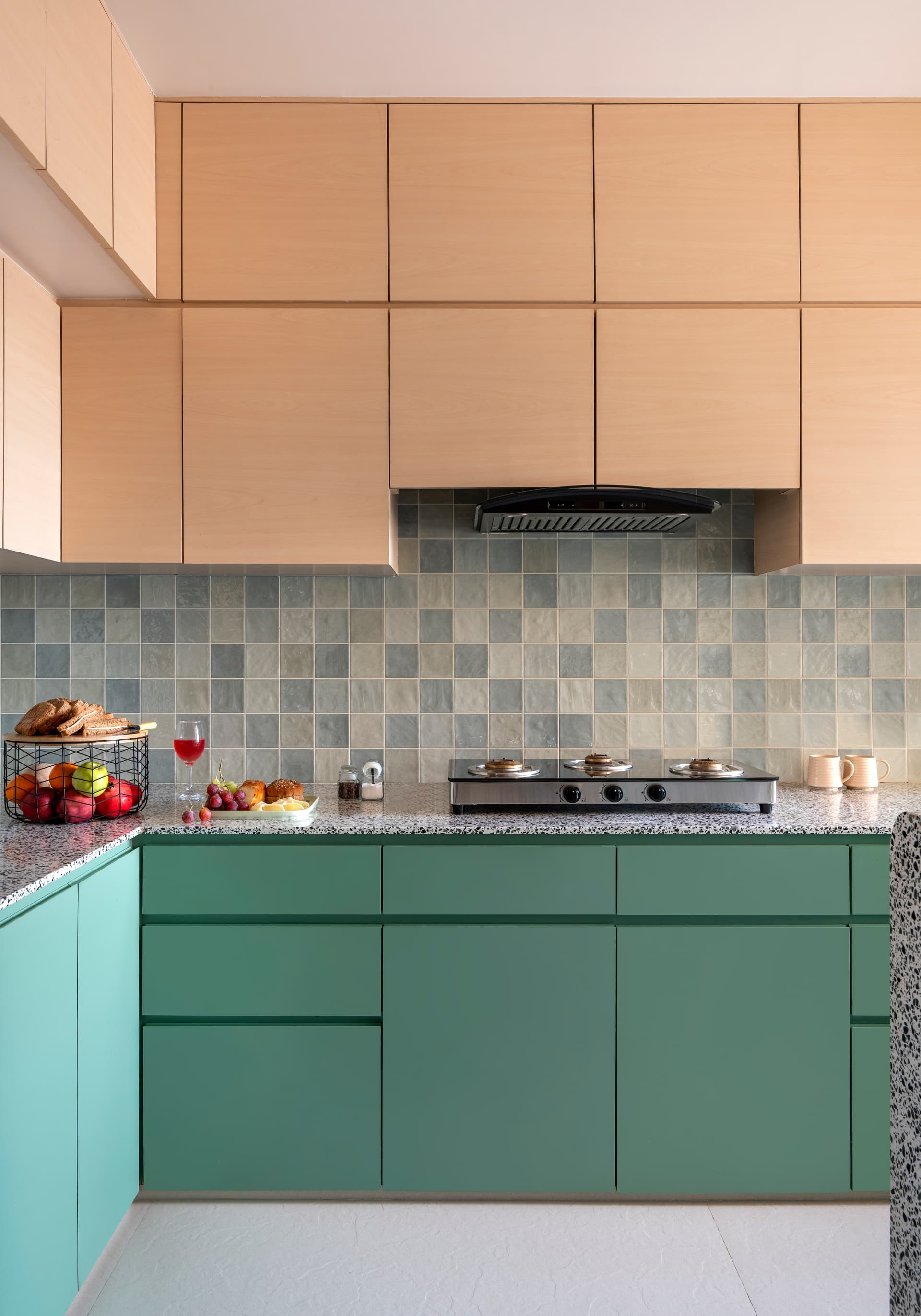 Adjacent to the living area, the dining space continues the home’s material dialogue with a bespoke terrazzo tabletop supported by four teakwood cylindrical legs, each varied in proportion to create a sculptural presence. A multifunctional crockery unit crafted from teak wood, birch ply, and fluted glass balances openness and storage, while a terrazzo ledge echoes the dining table’s finish, visually tying the elements together. In the kitchen, Jetsons adopts a restrained monochromatic palette, combining leaf green laminate lower cabinets with light wood-toned uppers. A green-chip terrazzo countertop paired with a sage kit-kat tile backsplash adds texture while maintaining a light, cohesive aesthetic within the compact layout.