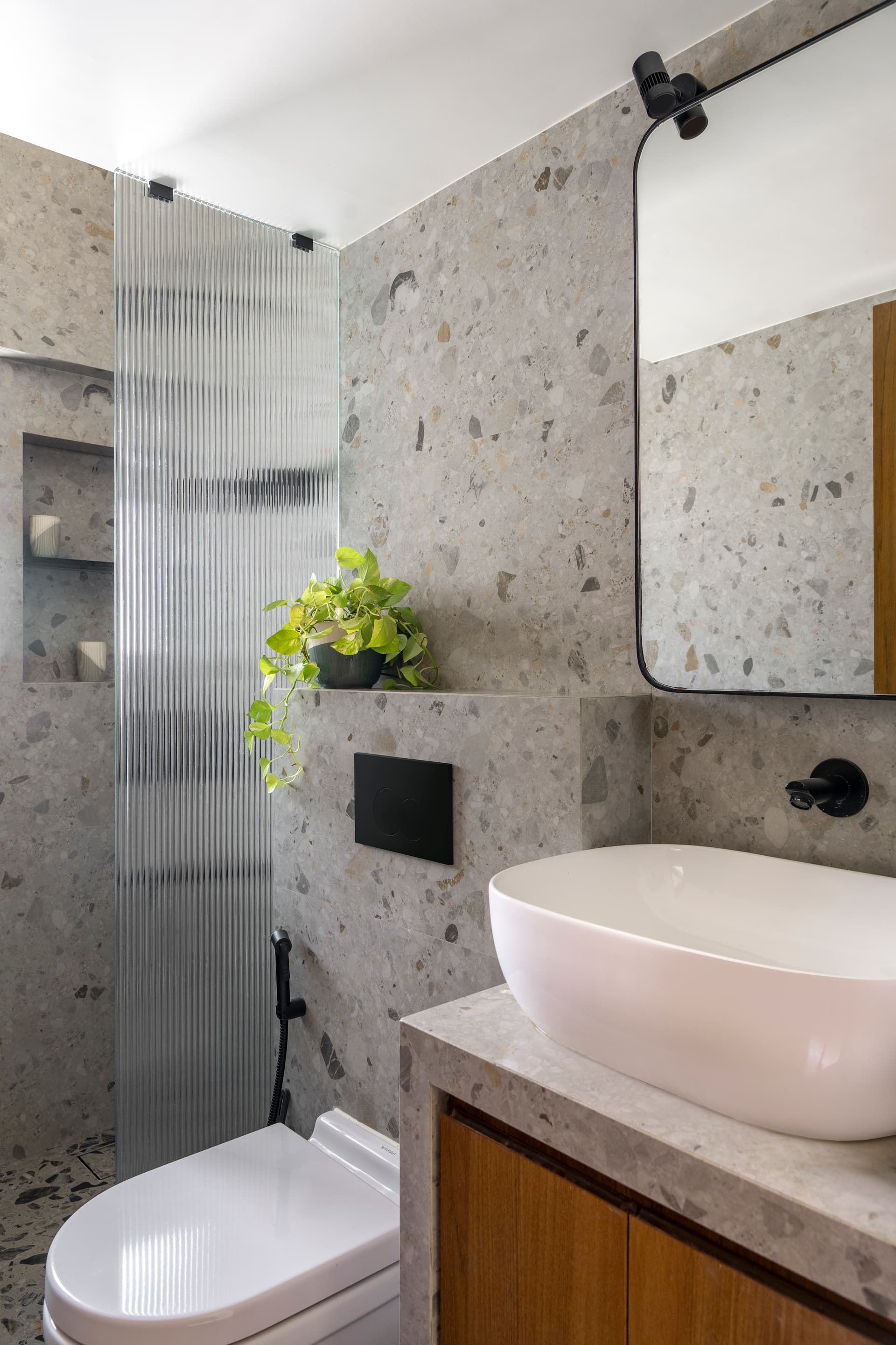 Bathrooms across the home maintain the same disciplined material approach. The common washroom features grey terrazzo tiles paired with fluted glass partitions and matte black fixtures for a clean, minimal expression. The master bathroom introduces a horizontal material split, with dark grey terrazzo tiles below and teak wood-look tiles above, creating both warmth and spatial clarity.