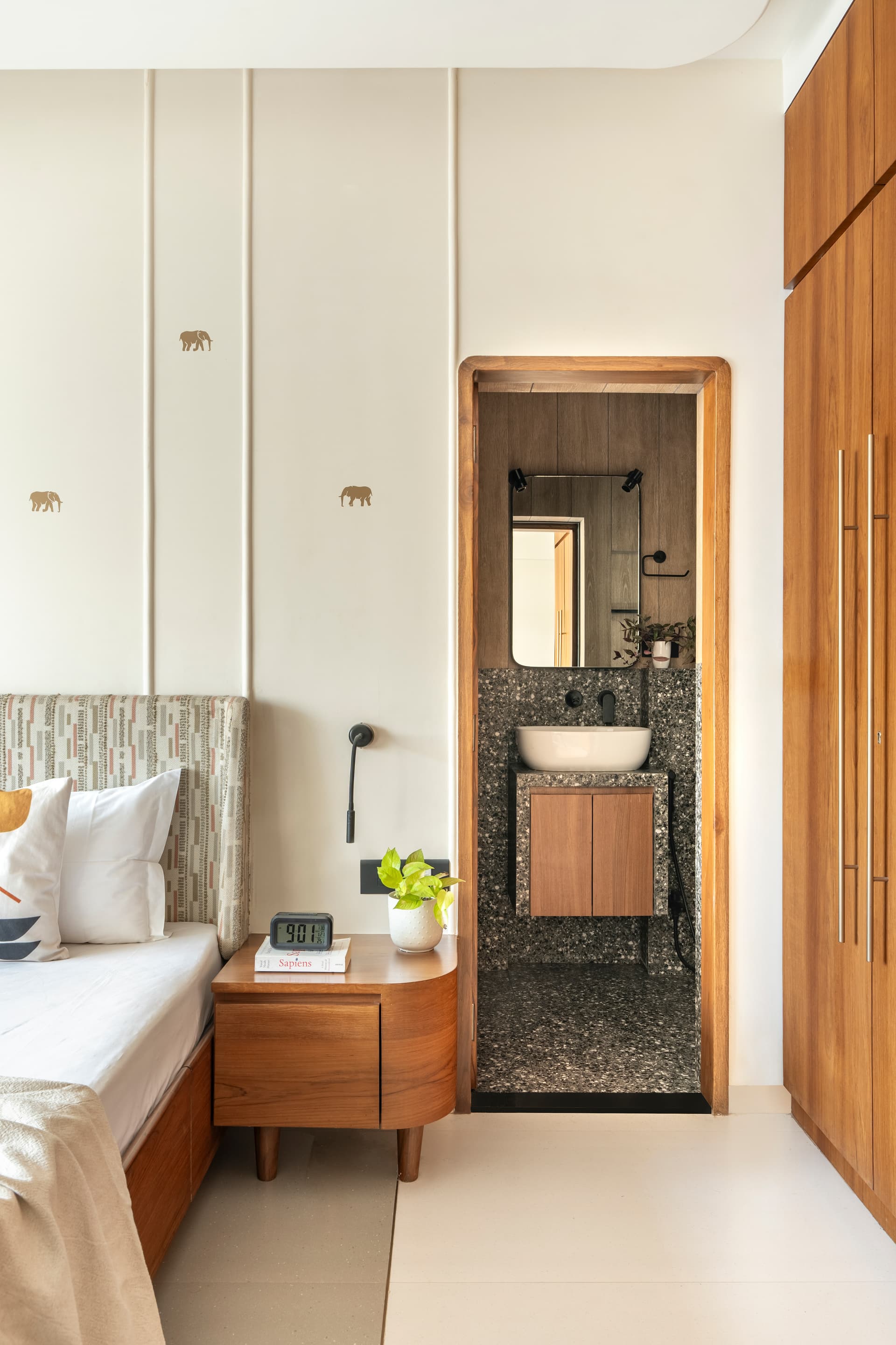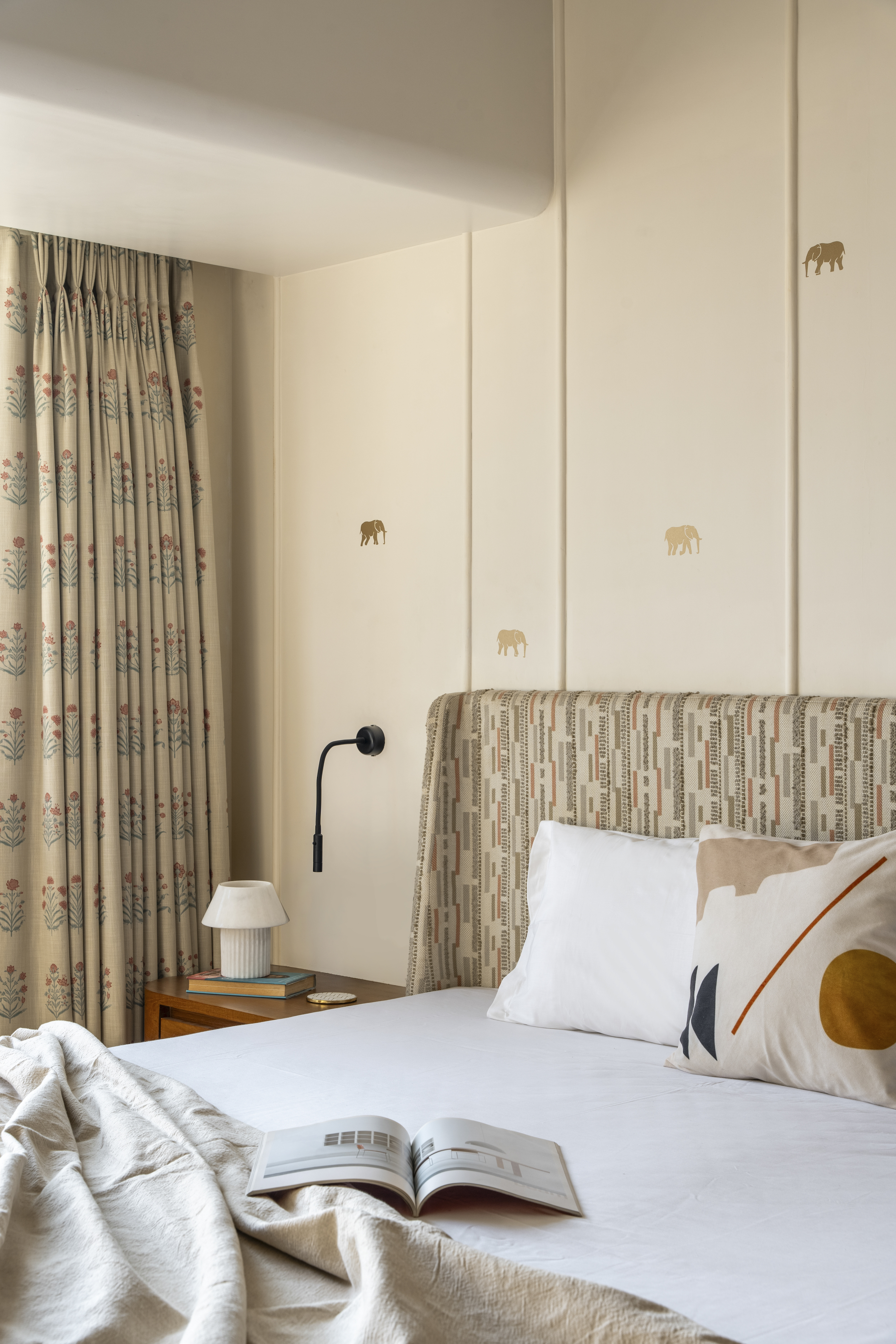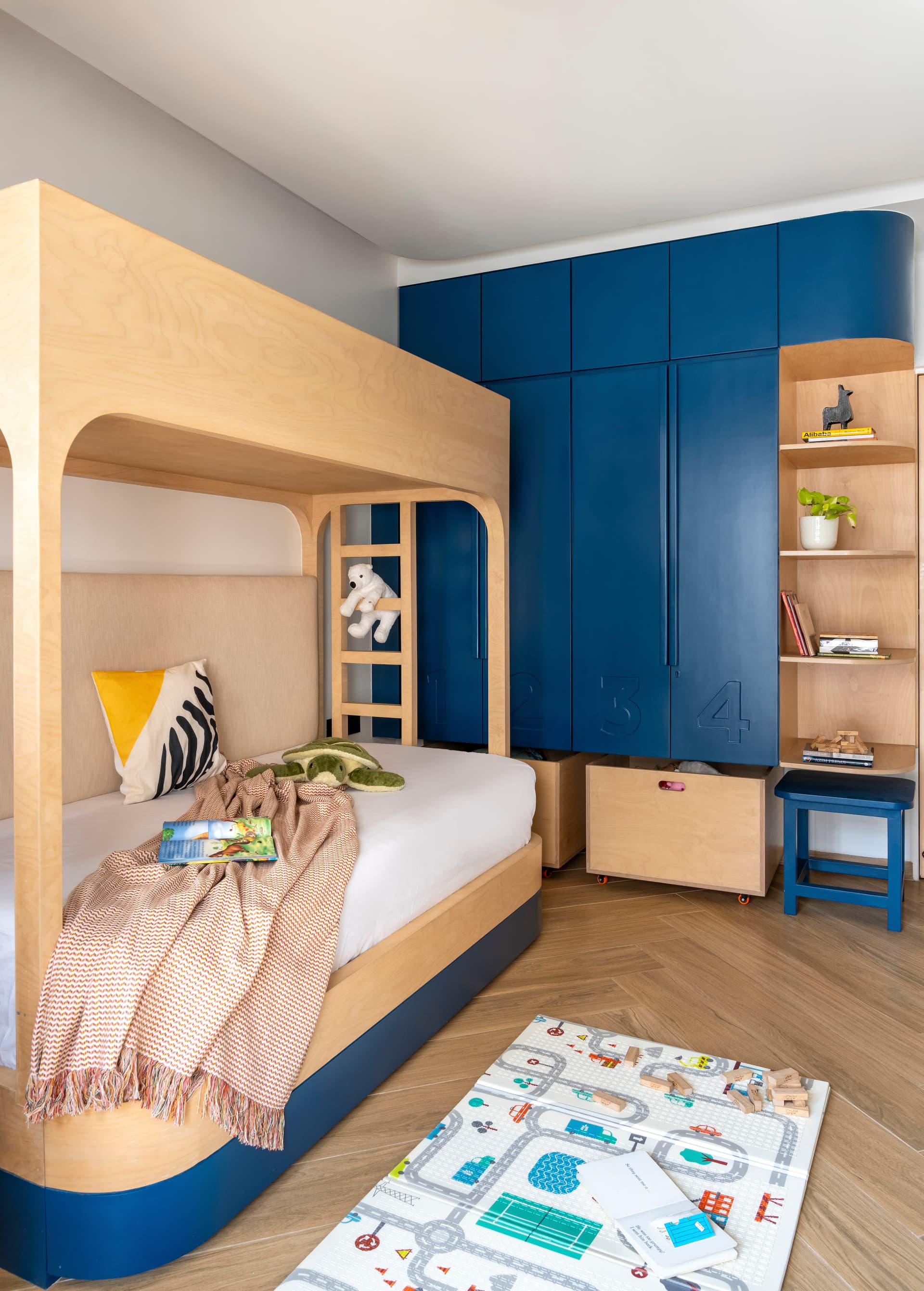 The private spaces reflect a thoughtful shift in tone while remaining true to the overall design language. The children’s bedroom introduces playfulness through chevron-patterned wooden flooring, cobalt blue PU-finished shutters, and custom furniture including a bunk-bed–sofa hybrid and a dedicated study zone. Wall- and ceiling-mounted monkey bars near the window transform the room into an interactive environment, seamlessly merging design with movement and imagination. In contrast, the master bedroom is calm and composed, defined by two-tone flooring subtly divided by a brass pati. Teak veneer furniture with brass handles reinforces material continuity, while the upholstered headboard introduces muted colour through vertical stitch detailing. Floral butta curtains, bespoke moulding details, and matte gold elephant motifs by KalakaariHaath add cultural nuance without visual weight.