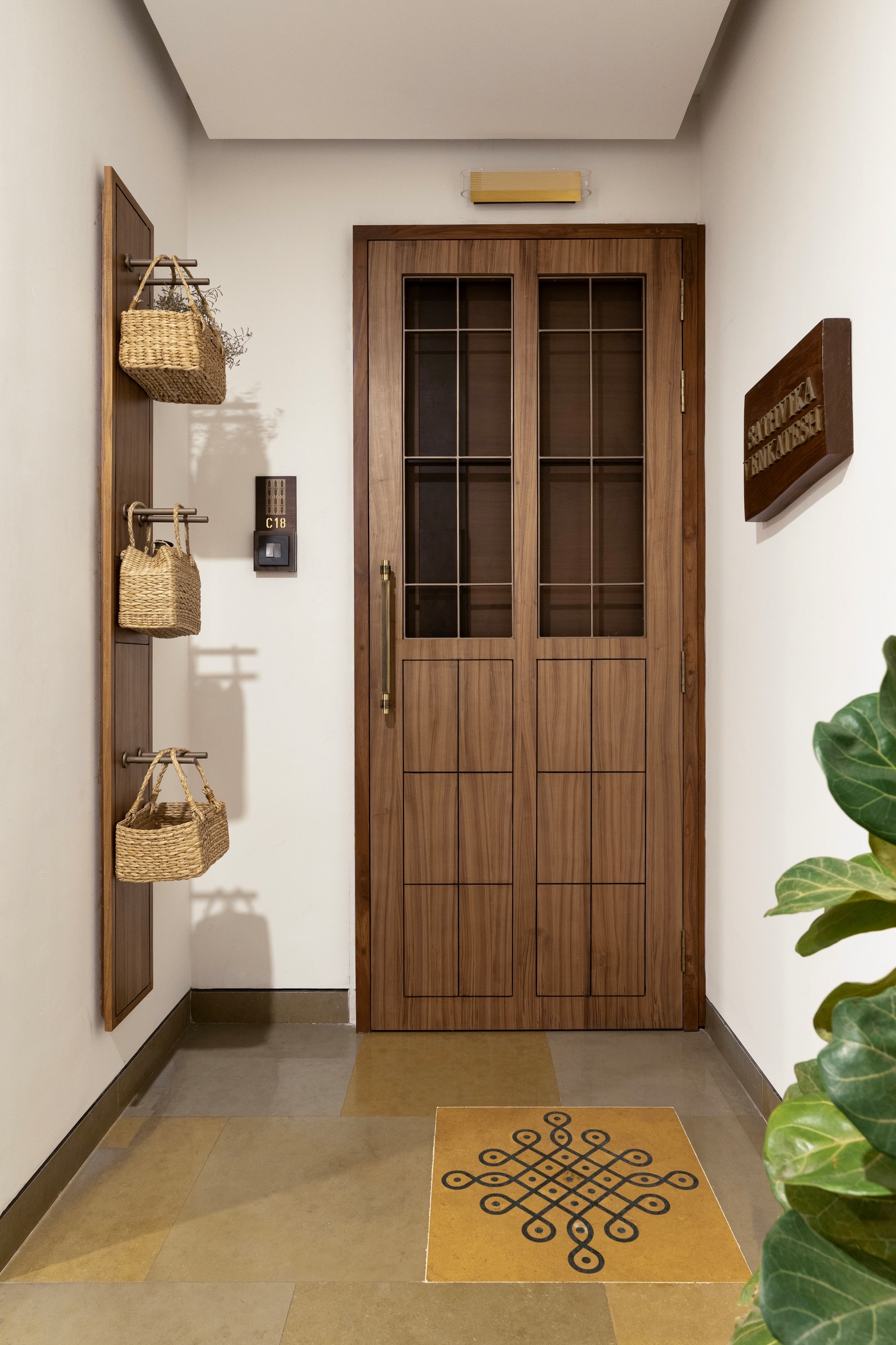 Before one even steps inside, Nesavu begins to narrate. The foyer’s Kota flooring, accentuated by Jaisalmer inlays, forms a delicate kolam motif, an homage to South Indian courtyards. Udaipur green marble, veined and sinuous, winds through the entryway inlaid with brass and natural stone geometries. A tactile detail appears on the wall: slender brass rods project from a wooden panel to hold woven baskets, a poetic nod to the morning rituals of milk and newspaper deliveries.