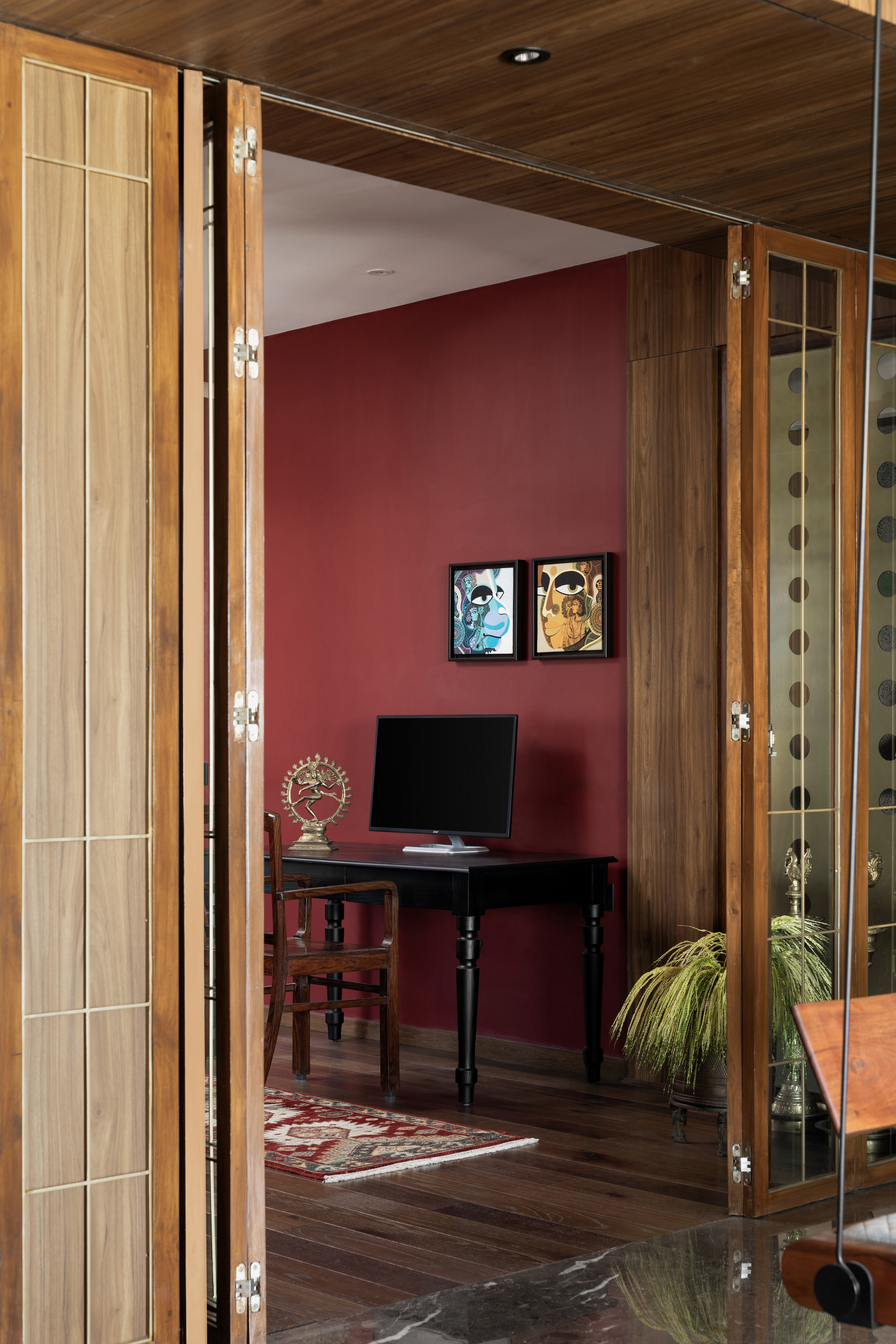 Beyond the shared zones, an accordion of glass doors opens into a multi-purpose room awash in earthy marsala tones. During the day, it becomes a sunlit dance studio, its wooden floors echoing the rhythm of practice. By evening, it transforms into a study or a guest retreat – a versatile, character-filled cocoon.